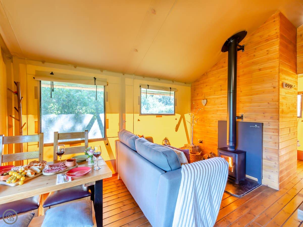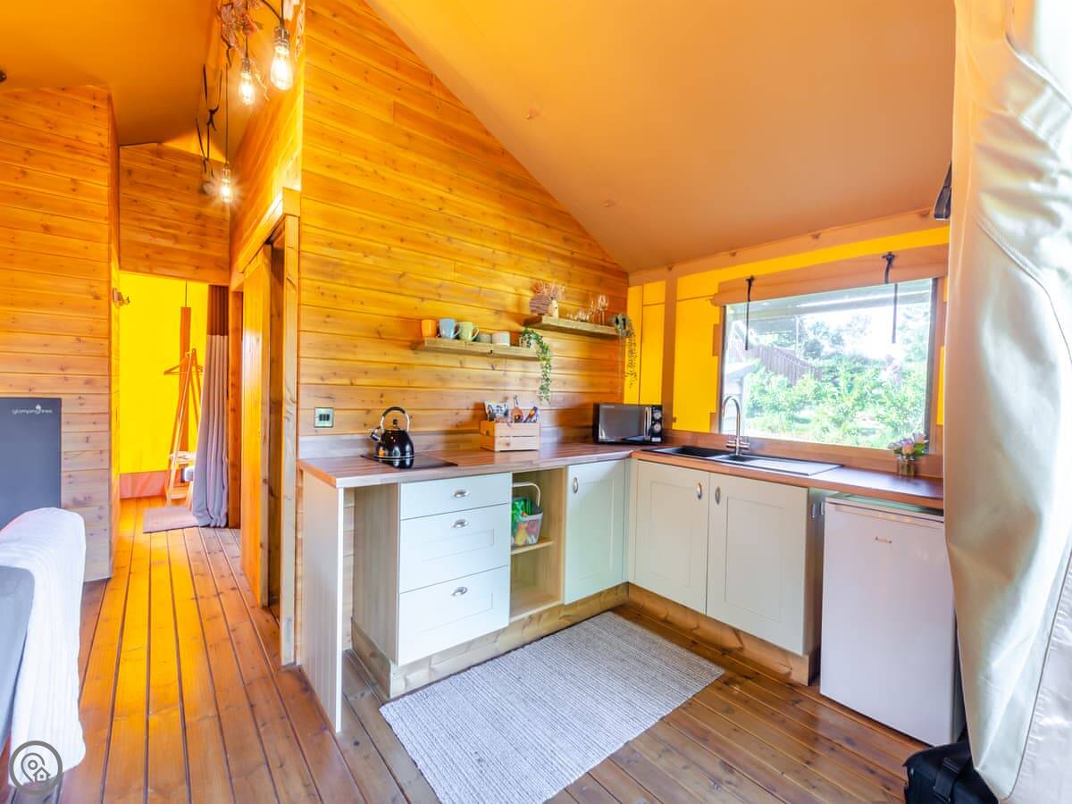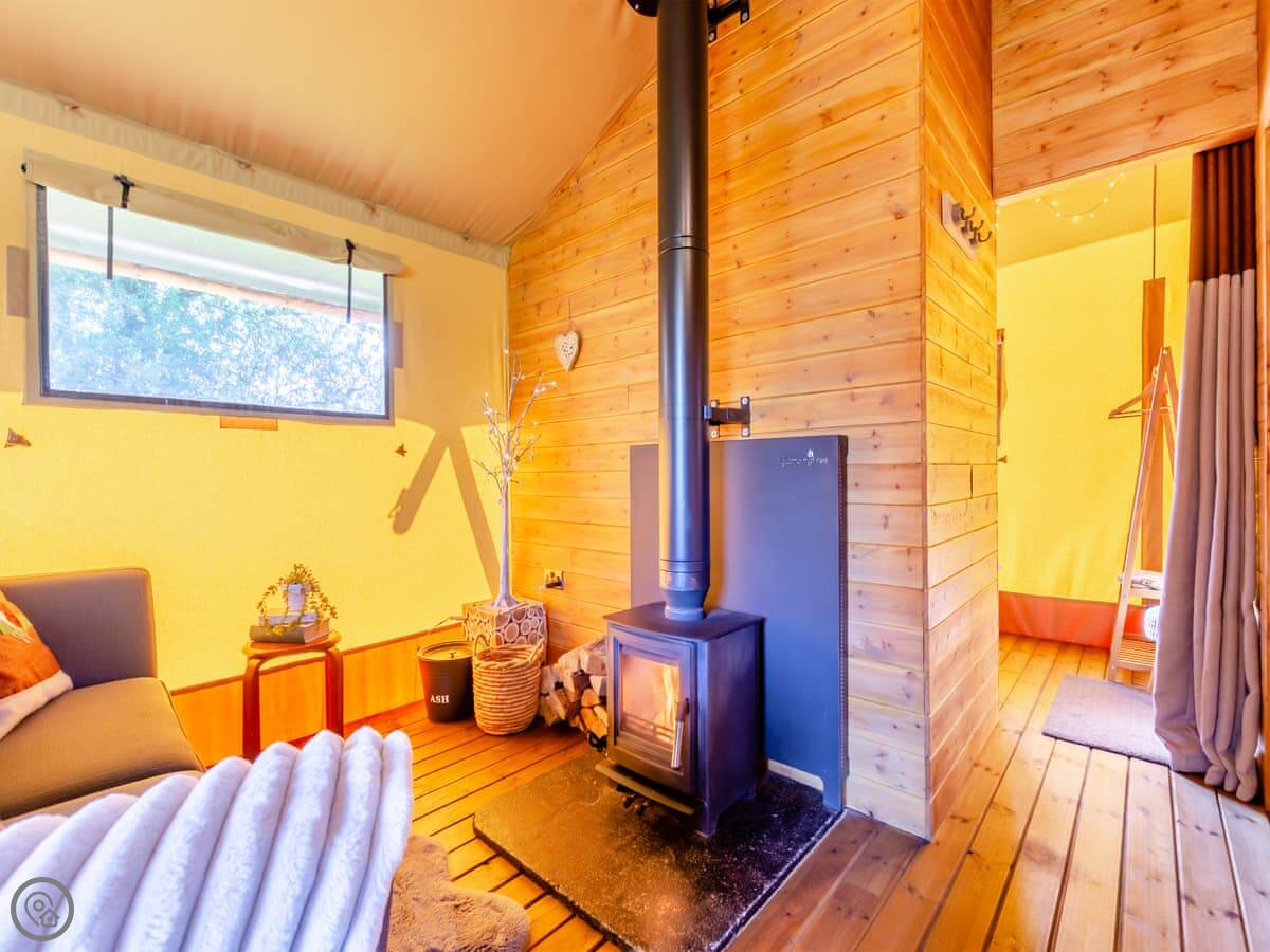 There's a wood burning stove for heating. The kitchen has an electric hob and a microwave. You've got your own deck with seating, and a fire pit and barbecue outside.