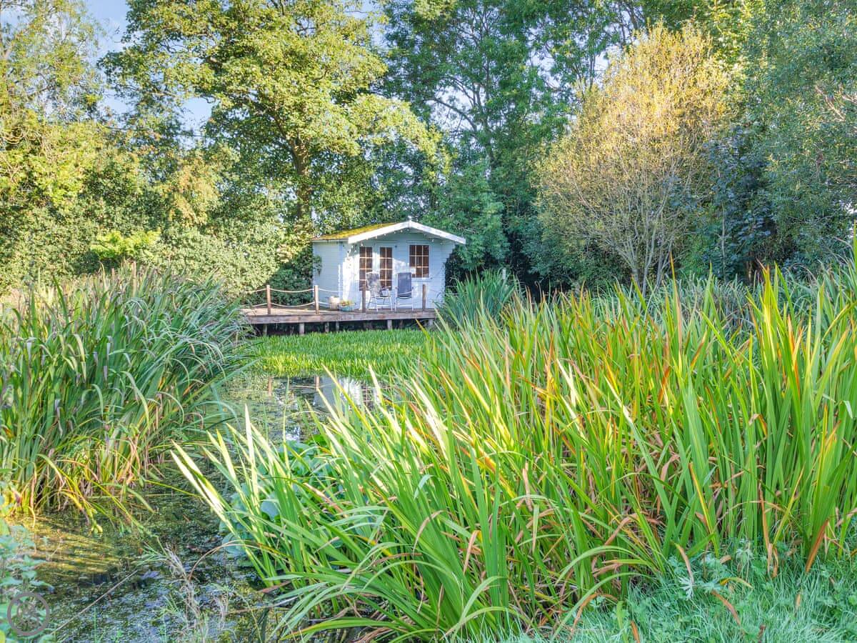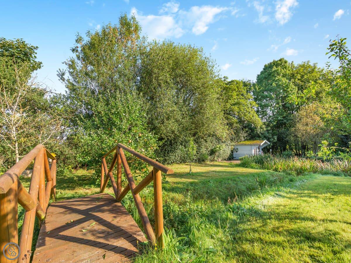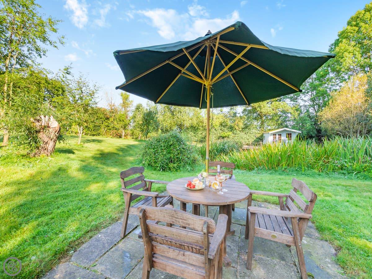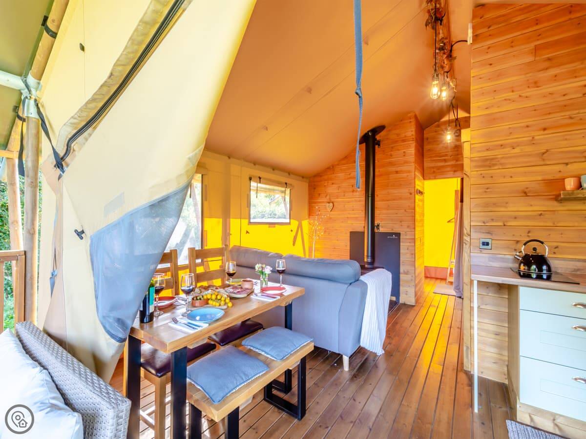 There's a wood burning stove for heating. The kitchen has an electric hob and a microwave. You've got your own deck with seating, and a fire pit and barbecue outside.