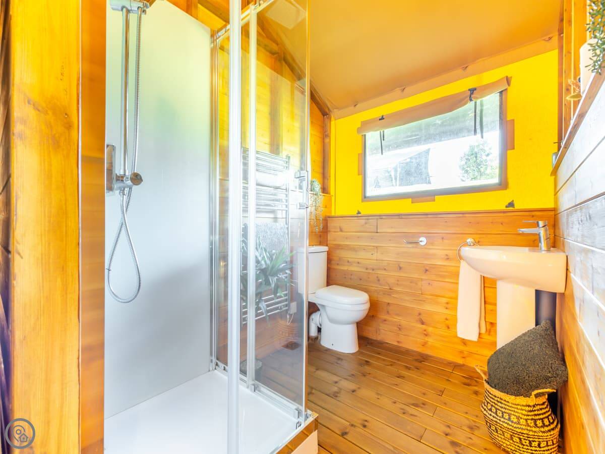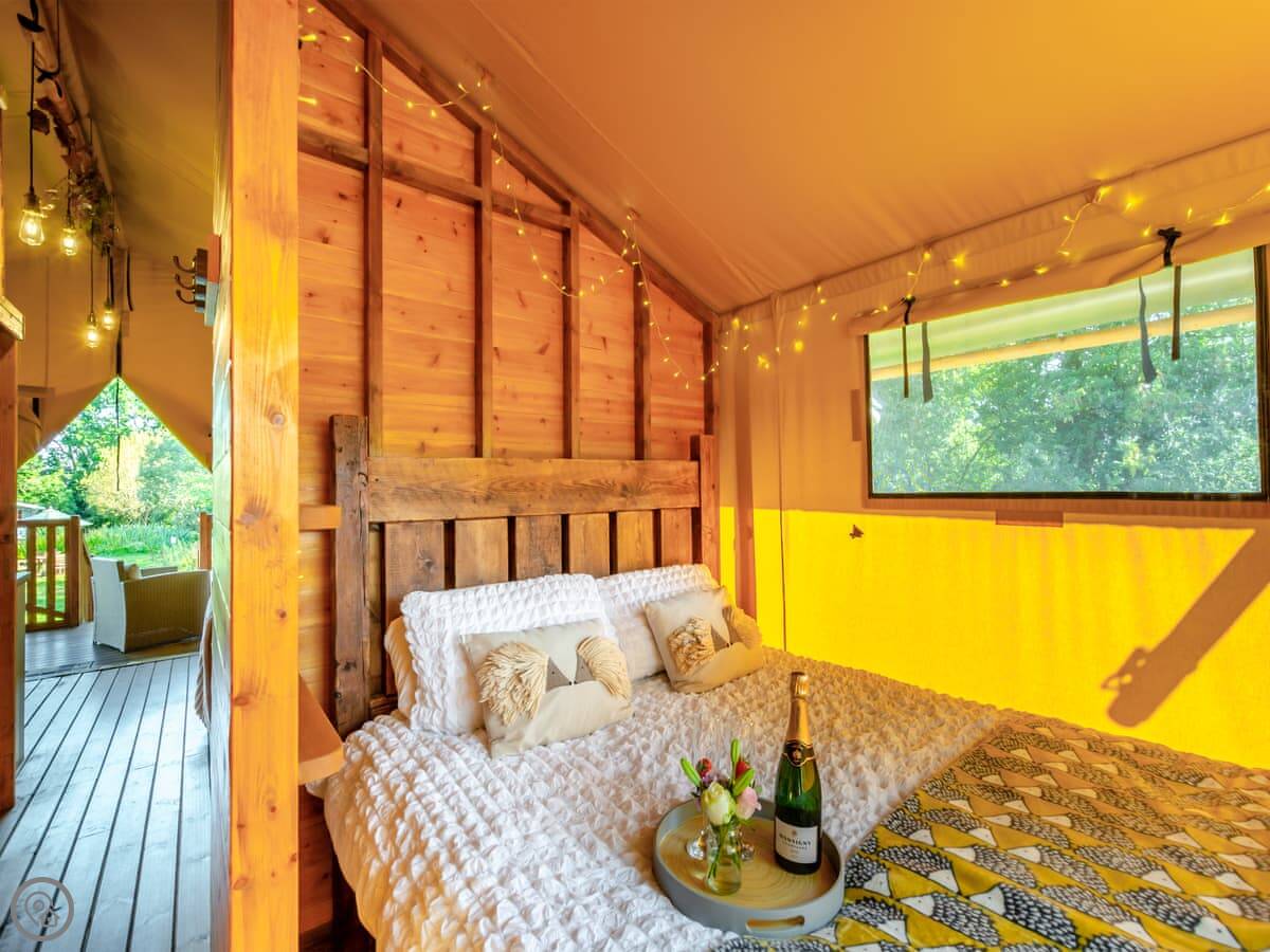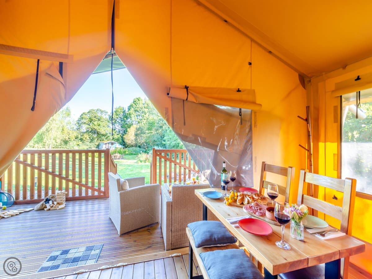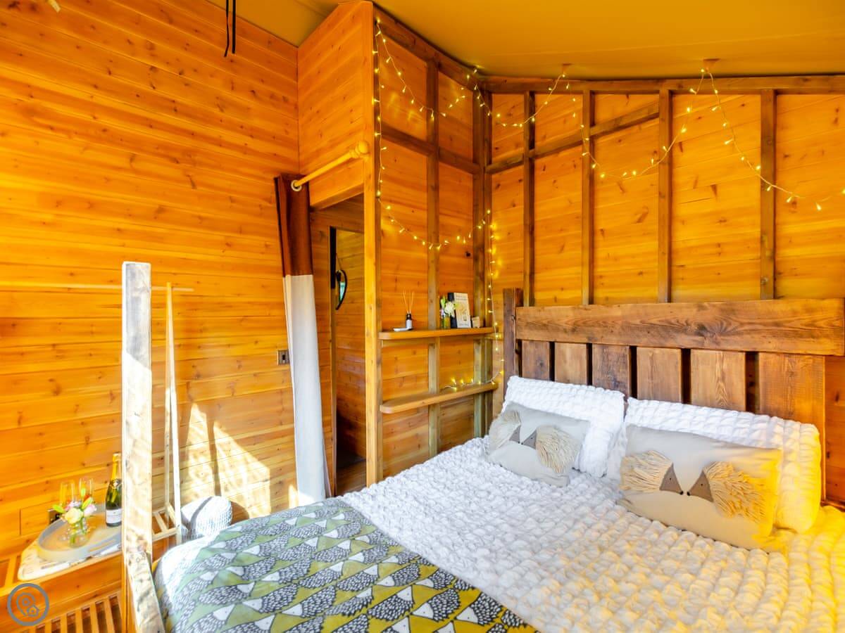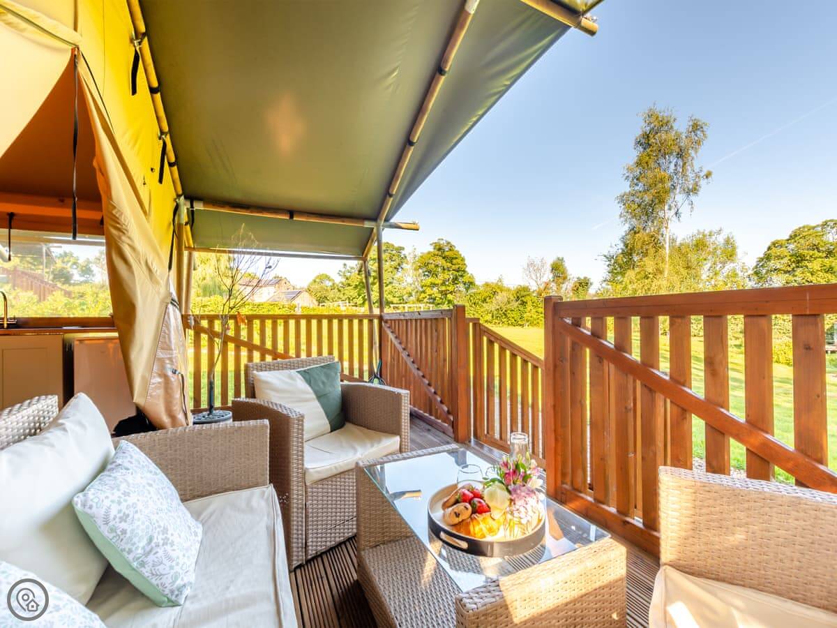 Hedgehogs Hideaway is in Bishop Thornton. It's a safari tent, so it's glamping really. There are three identical ones on the same site. The view is fields.