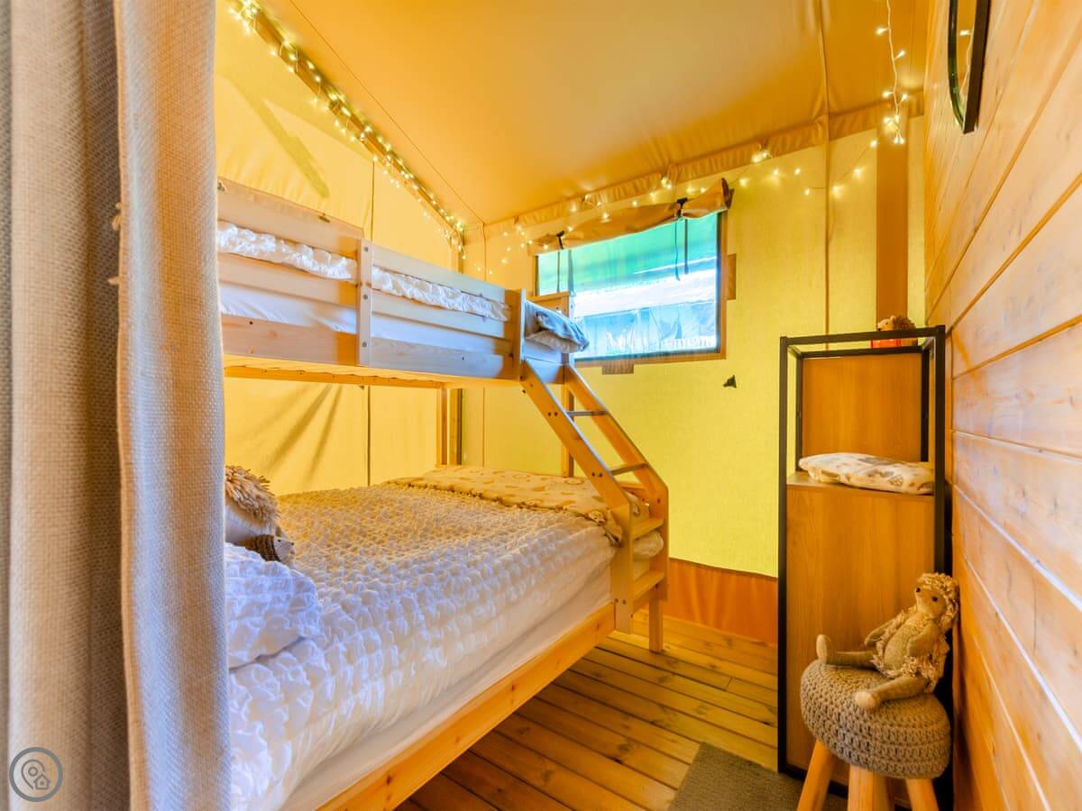 It sleeps five people. Two bedrooms. One has a kingsize bed, the other has a bunk setup with a double on the bottom and a single on top. The bathroom is a shower room. It's all open plan inside.
