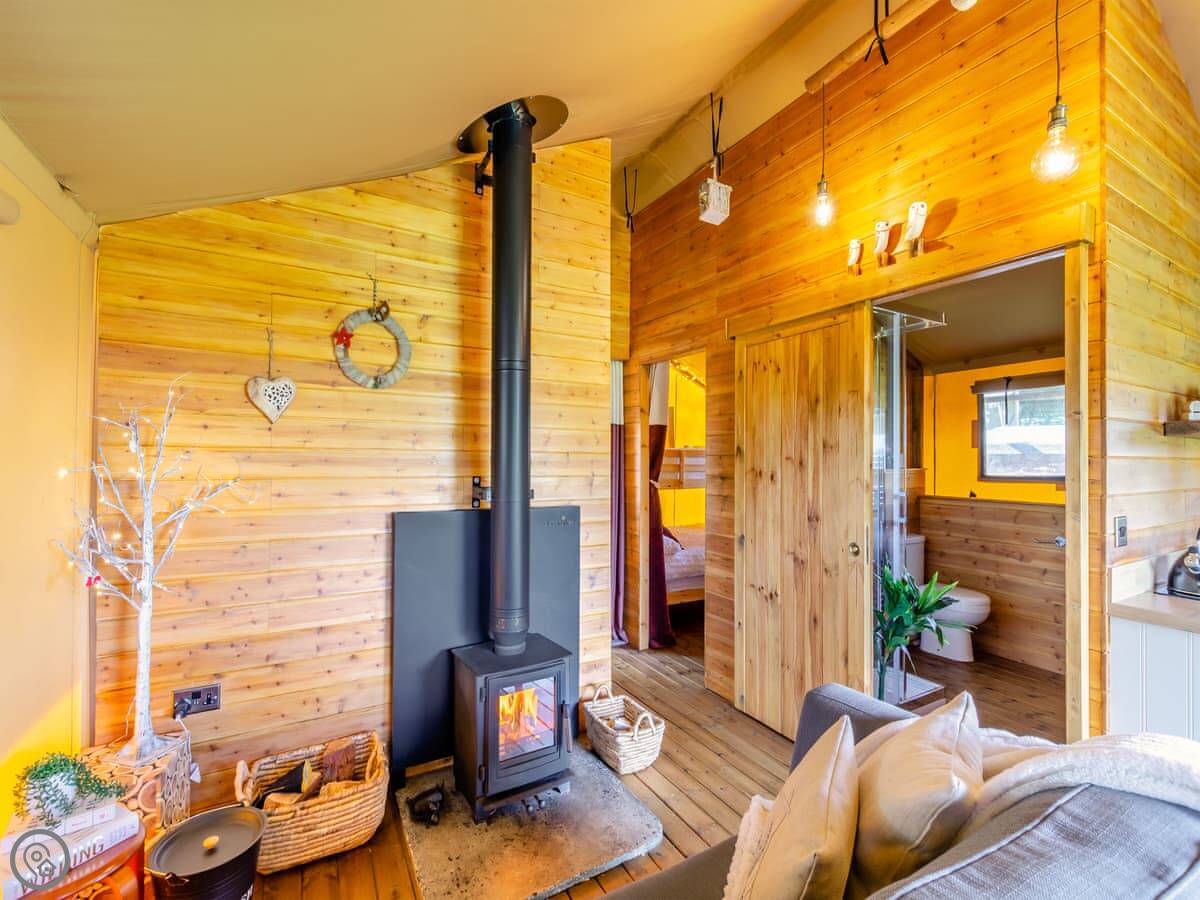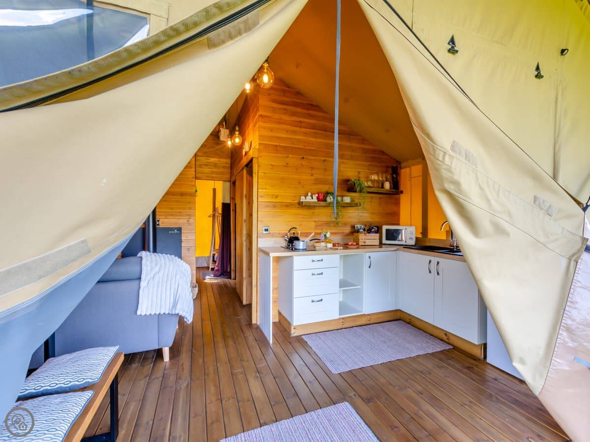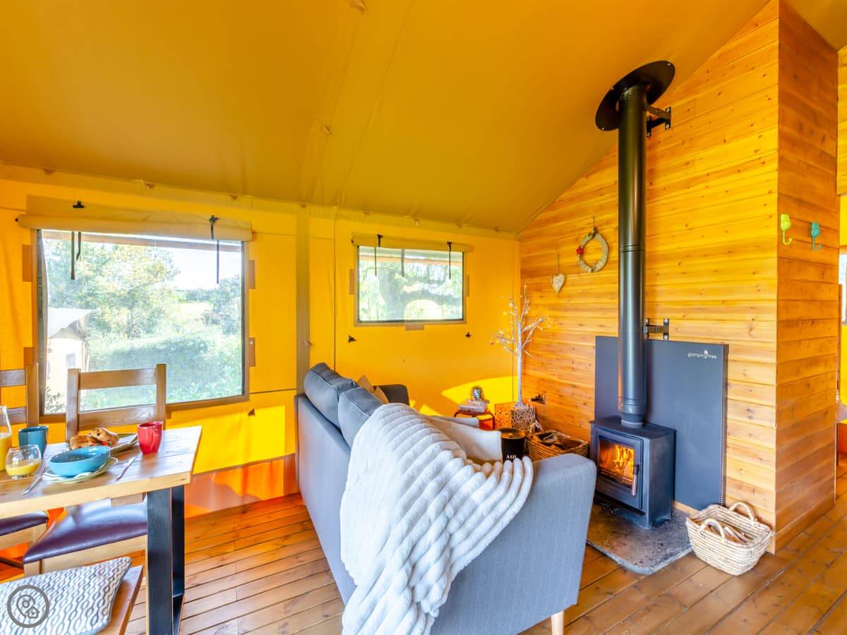 Inside, it’s one open-plan space. There’s a kitchen area with an electric hob and a microwave, a dining table, and a sitting area with a wood burning stove. It’s warm and dry, but it's a tent, so expect canvas walls and the sounds of the field.