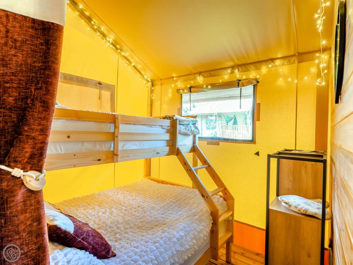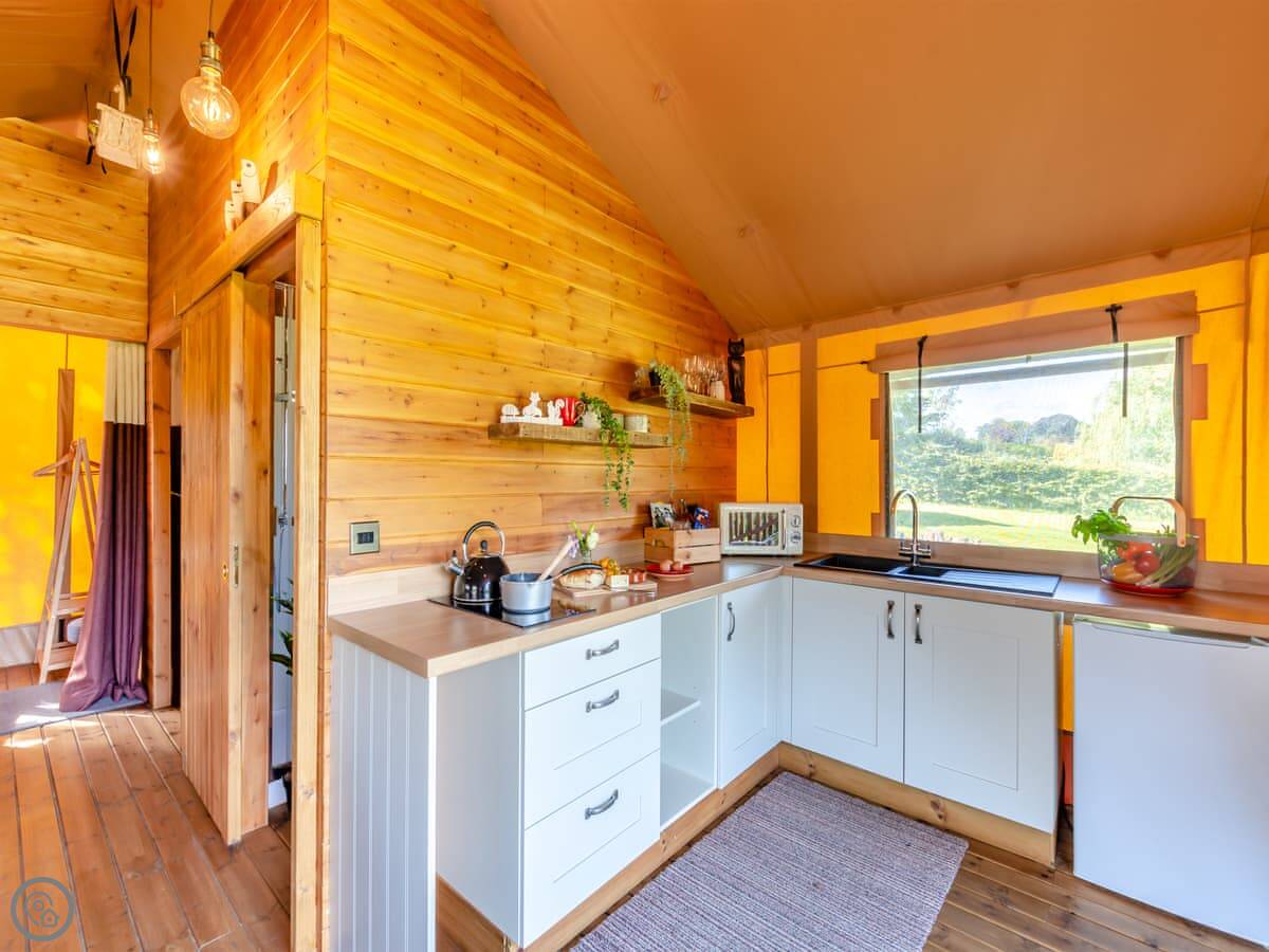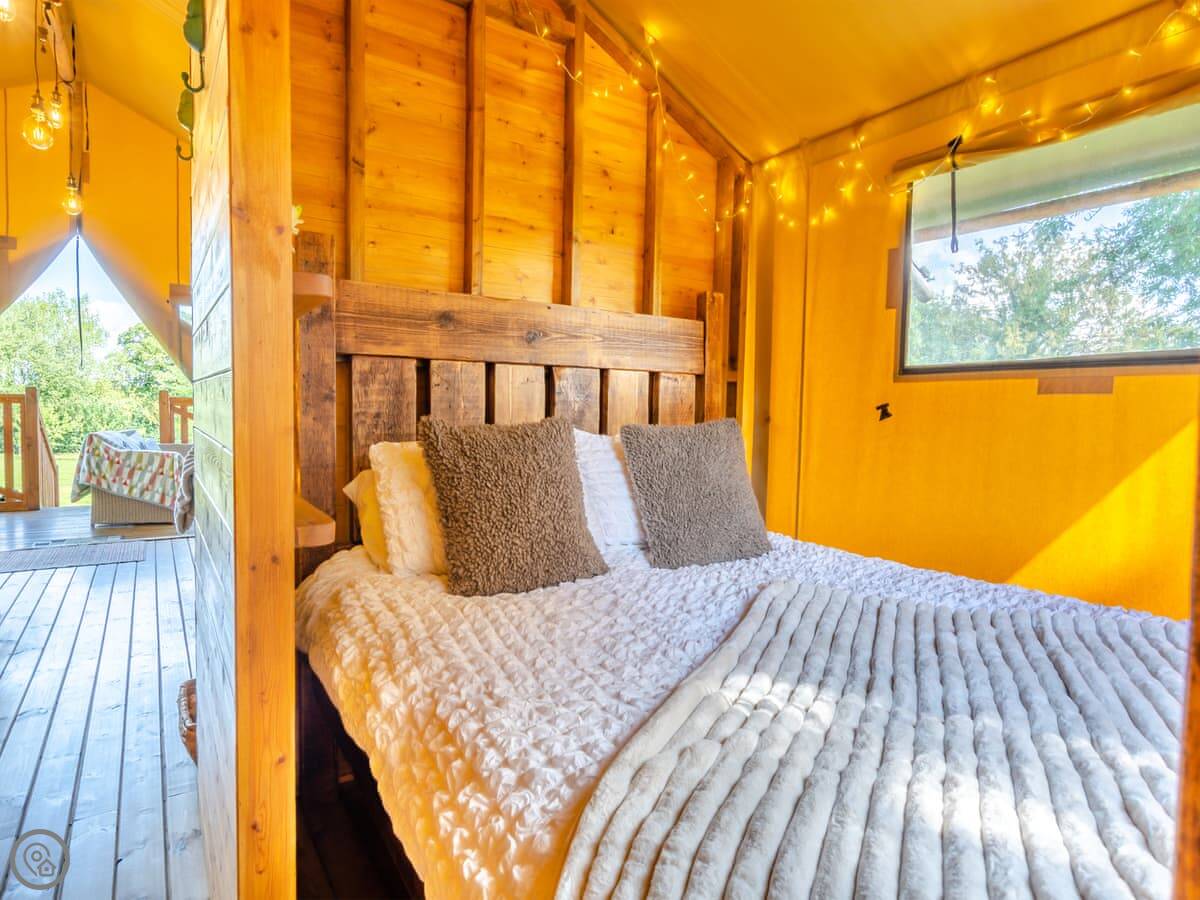 The Owls Hollow is one of three identical safari tents on Little North Field in Bishop Thornton. It’s on the edge of the village, so it’s quiet, but you can walk to the pub.