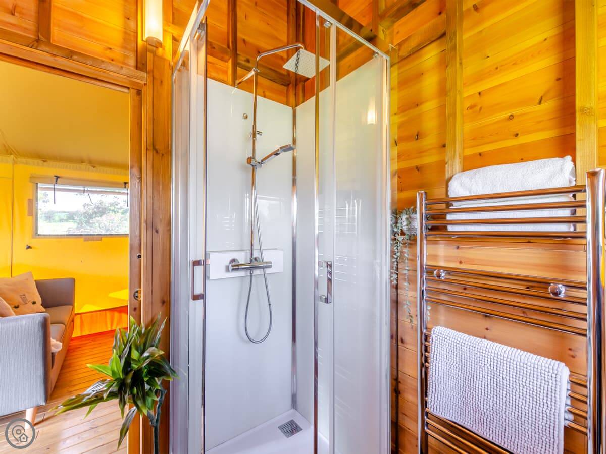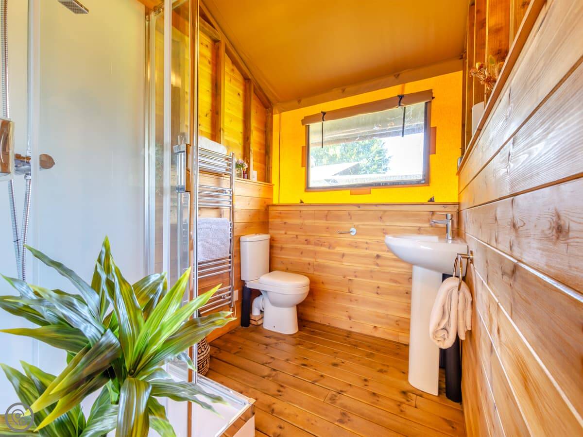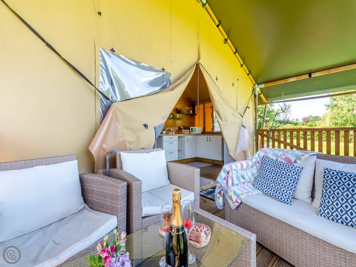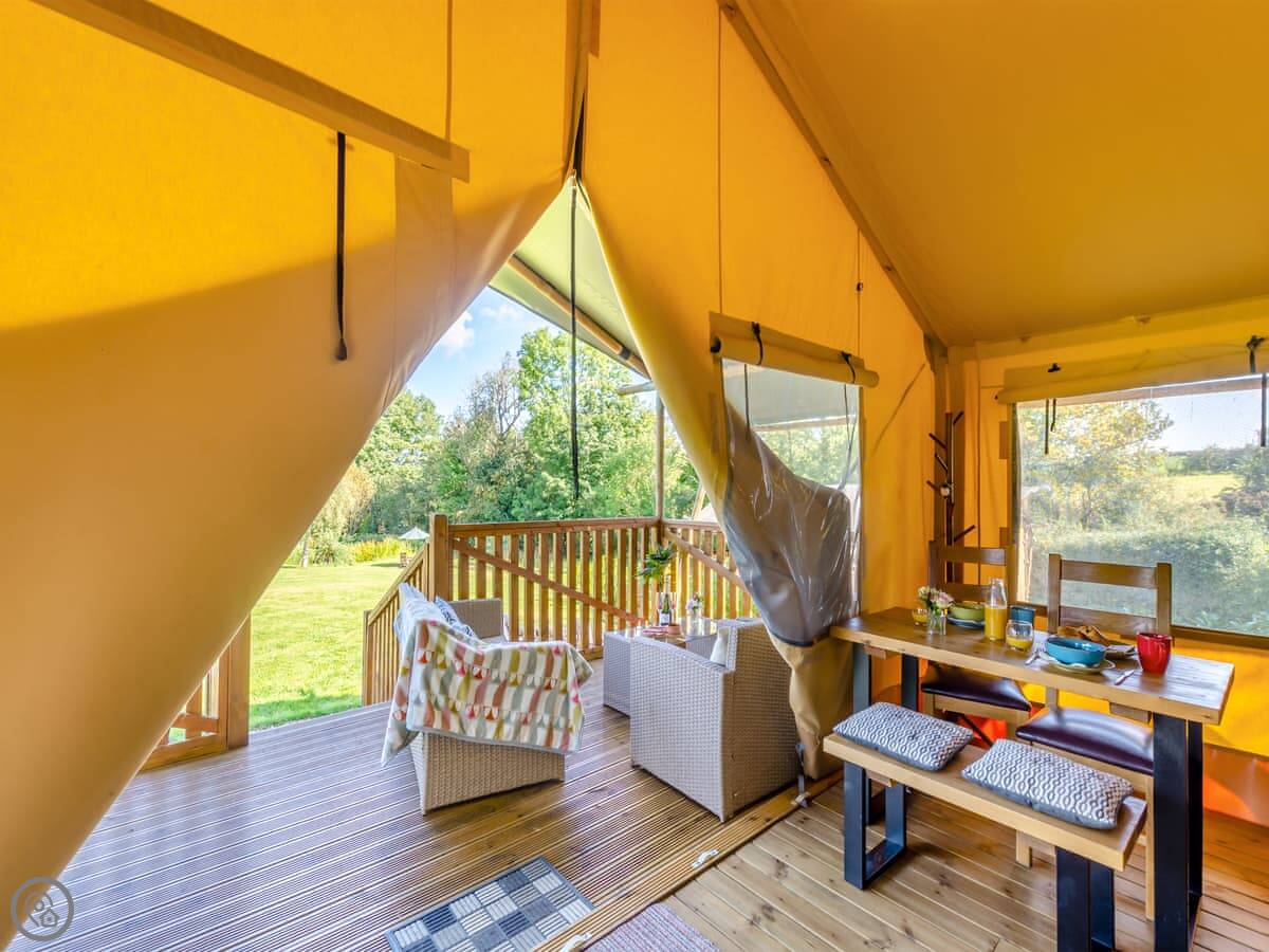 The Owls Hollow is one of three identical safari tents on Little North Field in Bishop Thornton. It’s on the edge of the village, so it’s quiet, but you can walk to the pub.