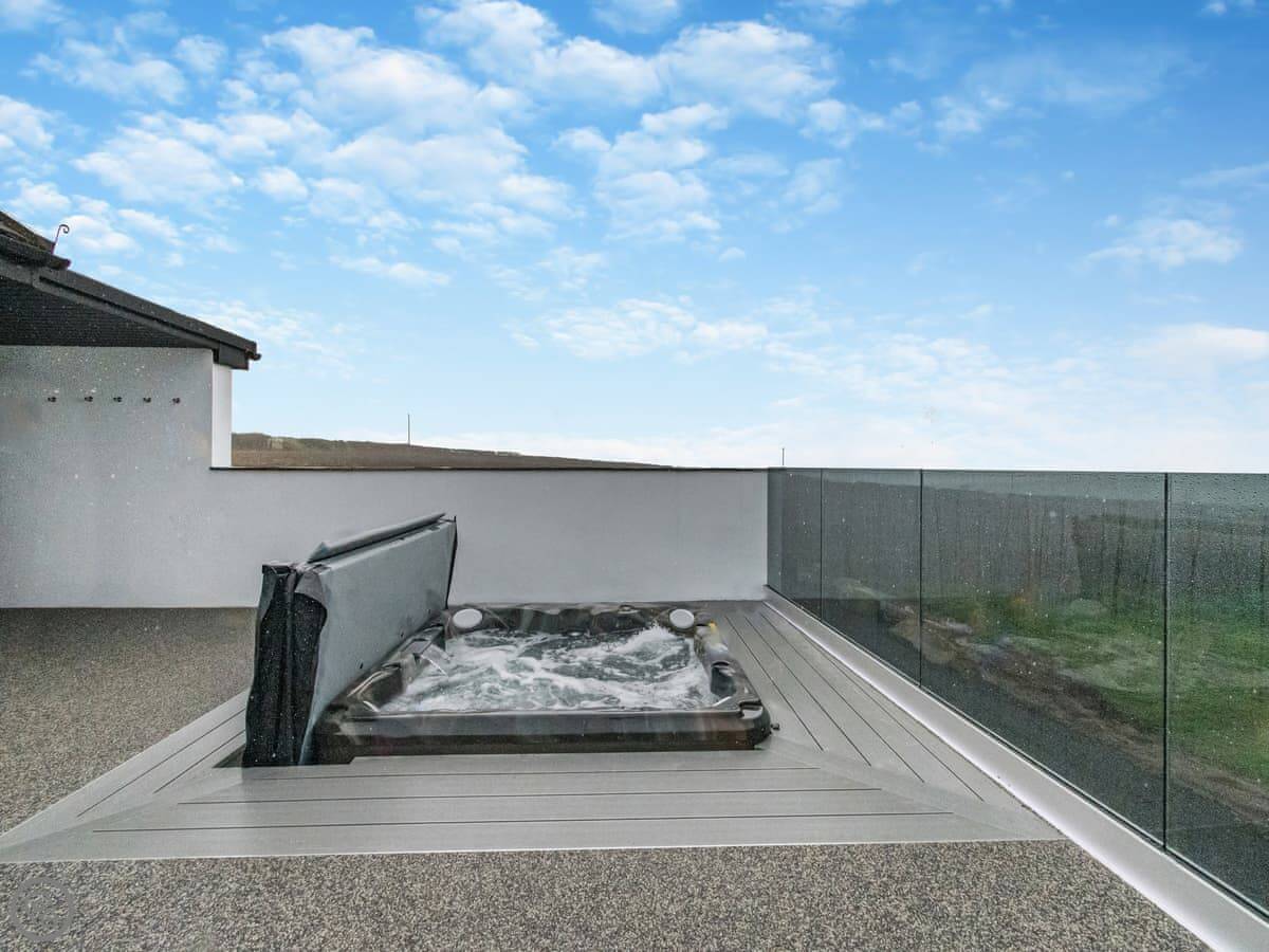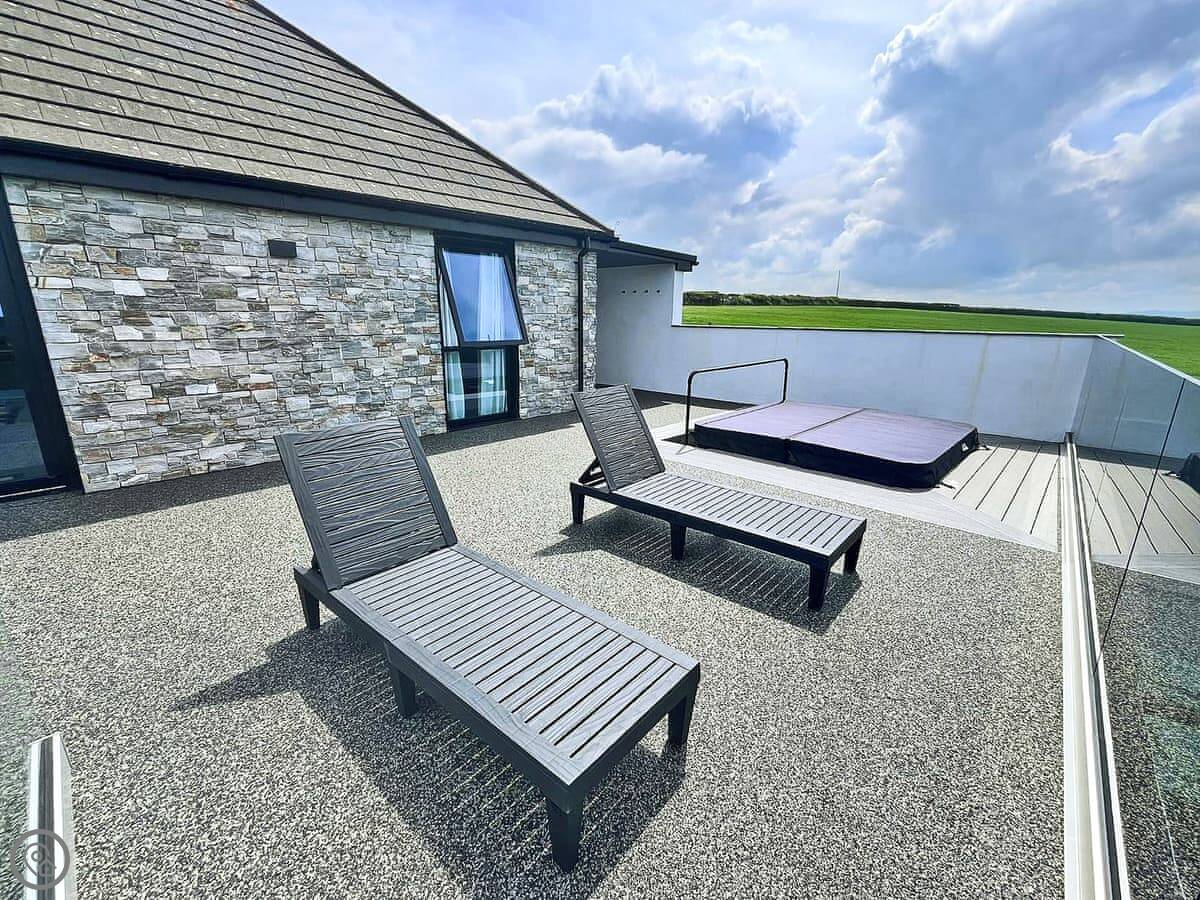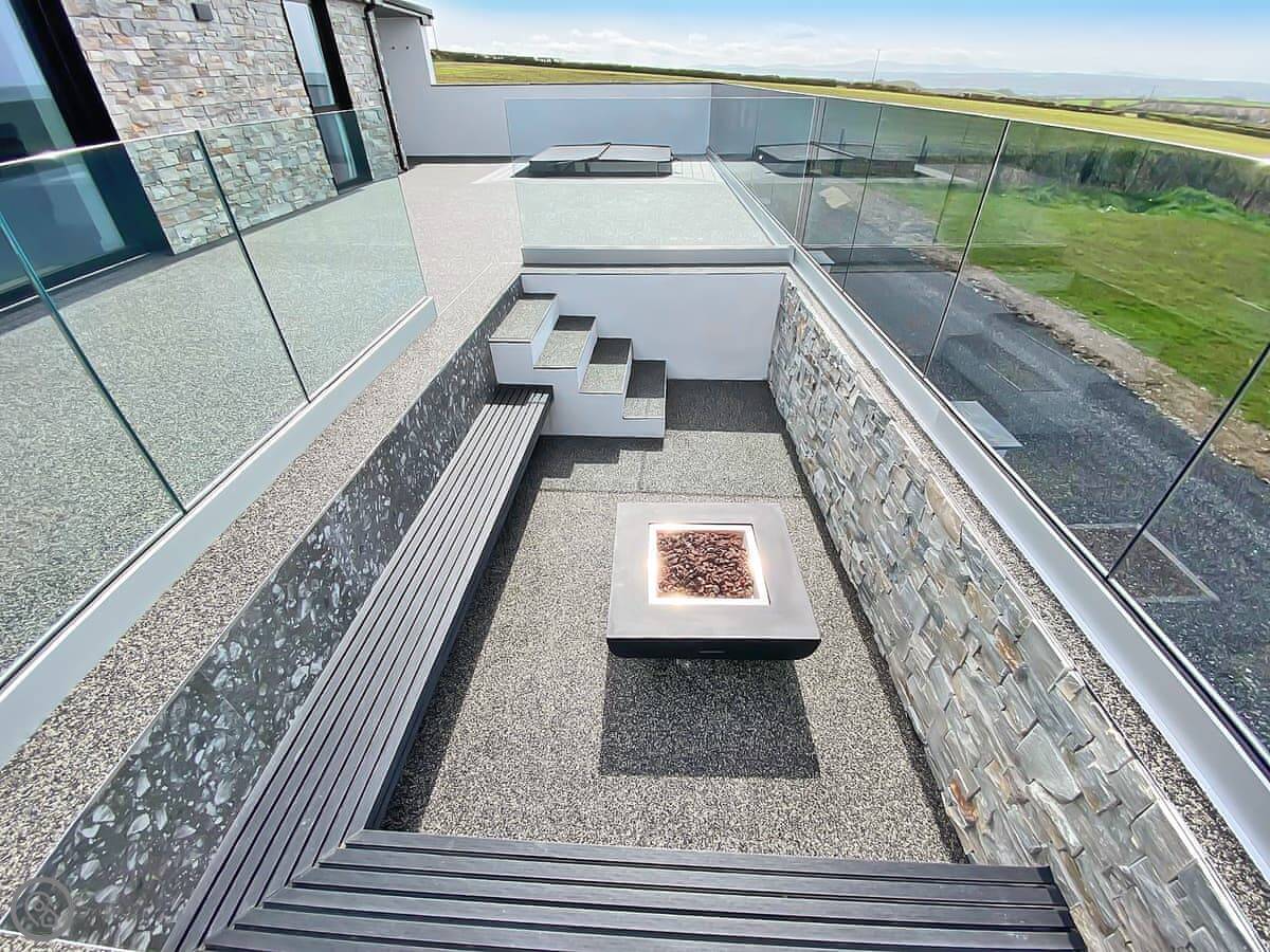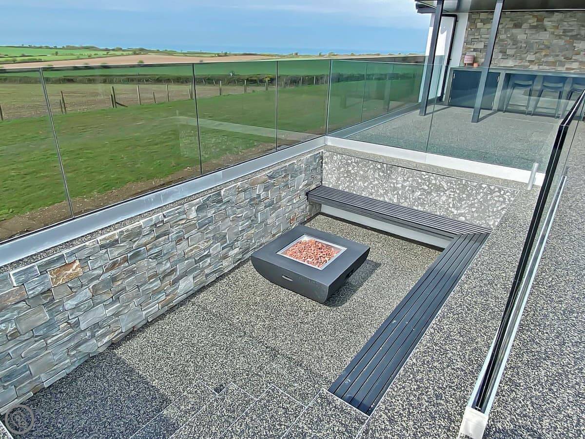 The terrace has a sunken hot tub and a firepit. The views from there are uninterrupted. You look right out to sea.