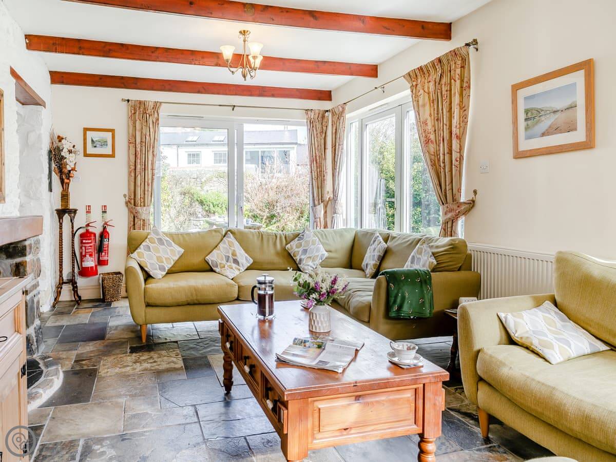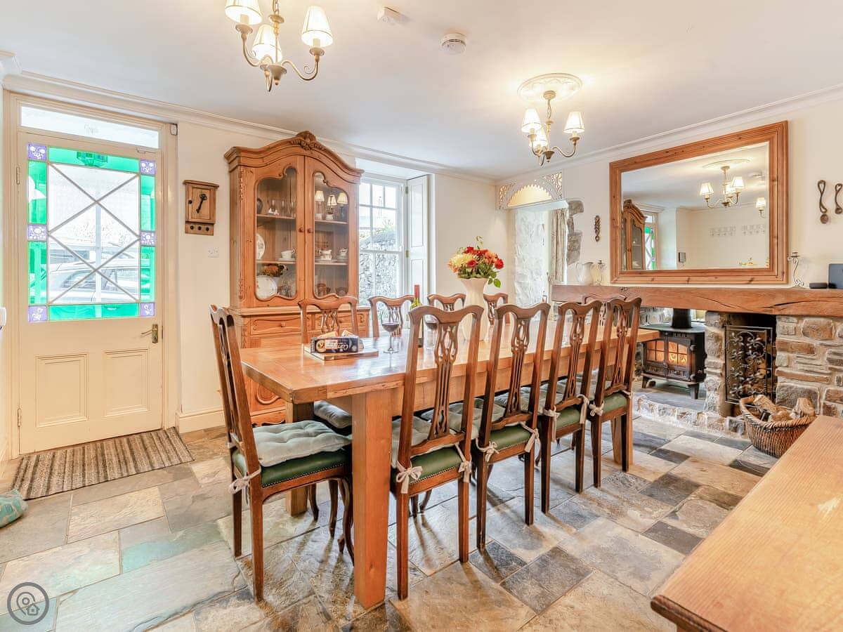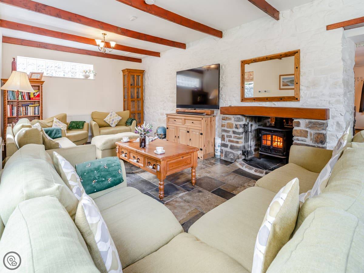 The main room has slate floors with underfloor heating and a double-sided log burner between the sitting and dining areas. There are large patio doors that open to the garden. The kitchen is well-equipped. There's plenty of on-site parking, including an electric vehicle charger.