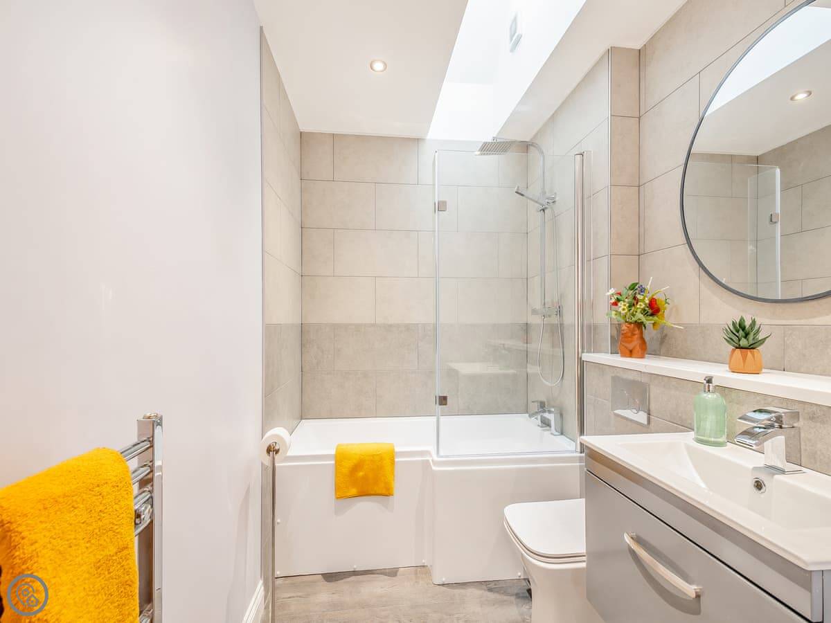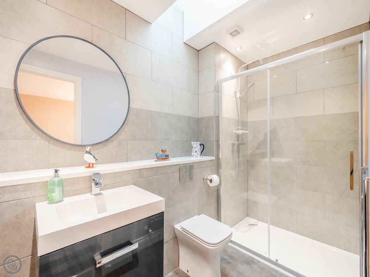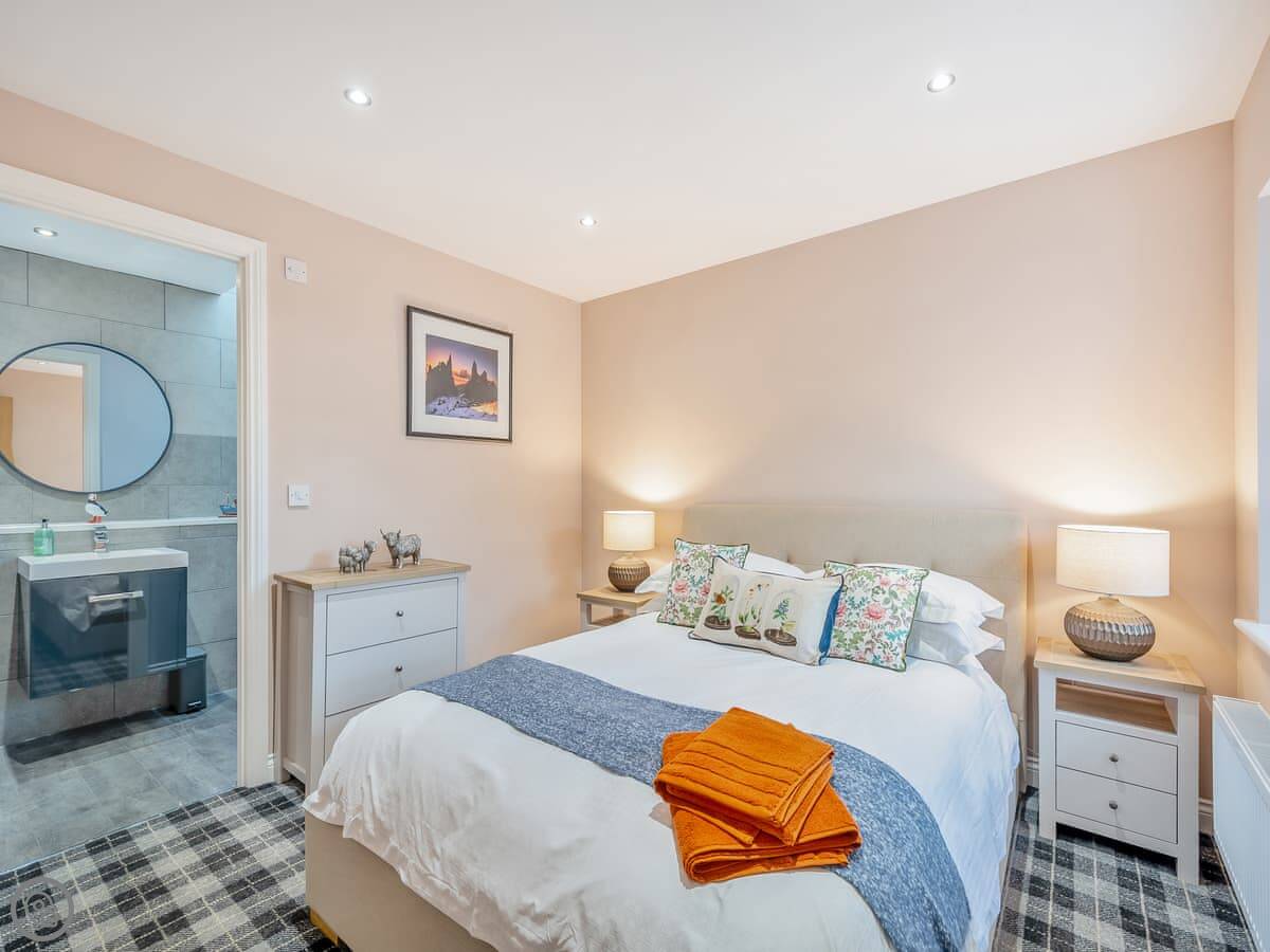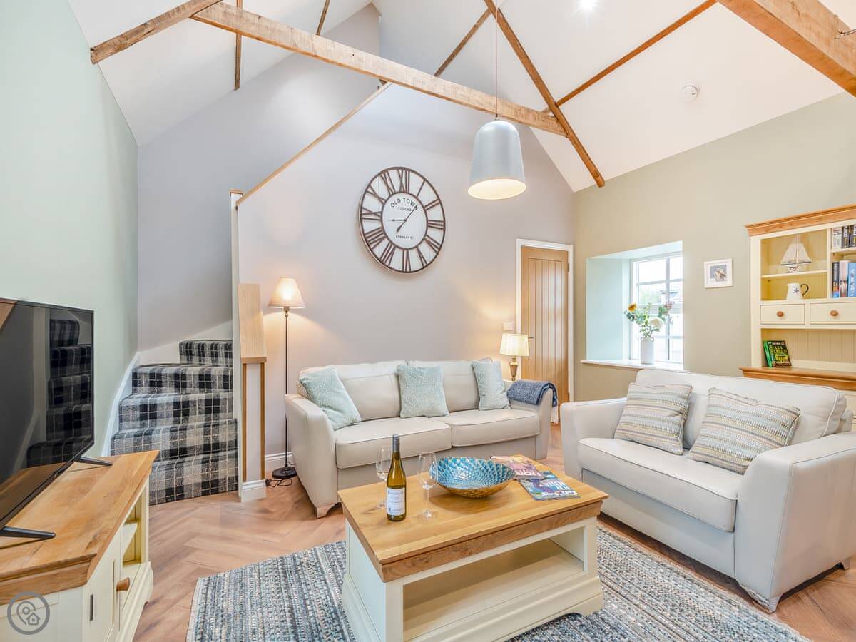 The main room is open plan, with a kitchen, table, and sofa area. The kitchen is modern and has a dishwasher and washing machine. There's an electric vehicle charger on the side of the building if you need it. Outside the back, there's a private, enclosed garden. You look out over fields where we keep sheep and a few cows, so it's a proper farm view.