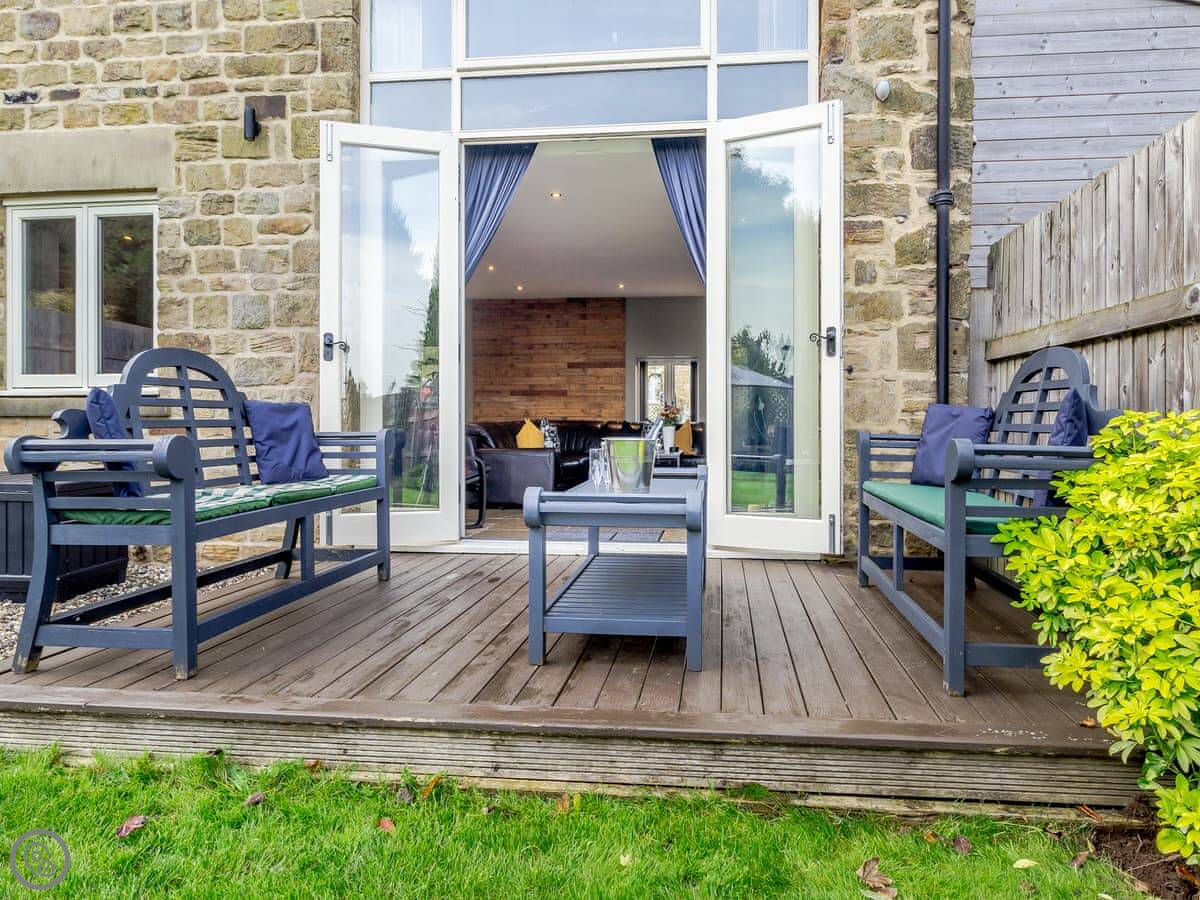 Inside, it's one big room downstairs with the kitchen, dining area, and living space. There's a wood burner. The French doors open right onto the patio. Outside, there's a table and chairs for everyone, a deck, and a brick barbecue. The hot tub is under a shelter so you can use it in any weather.