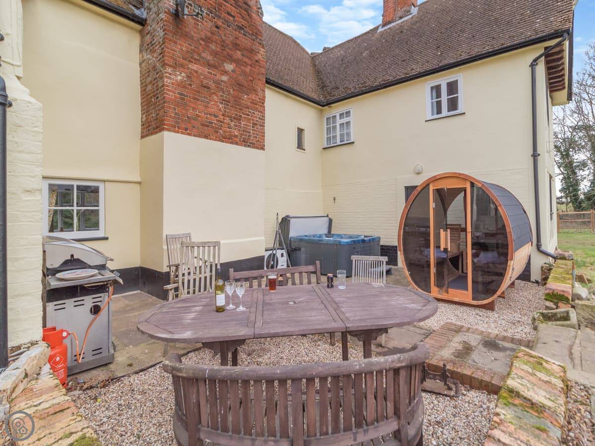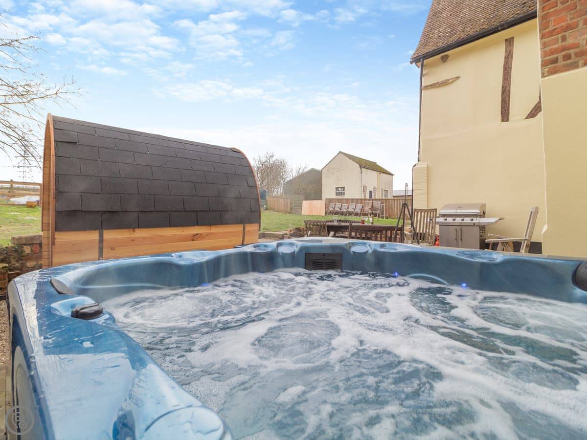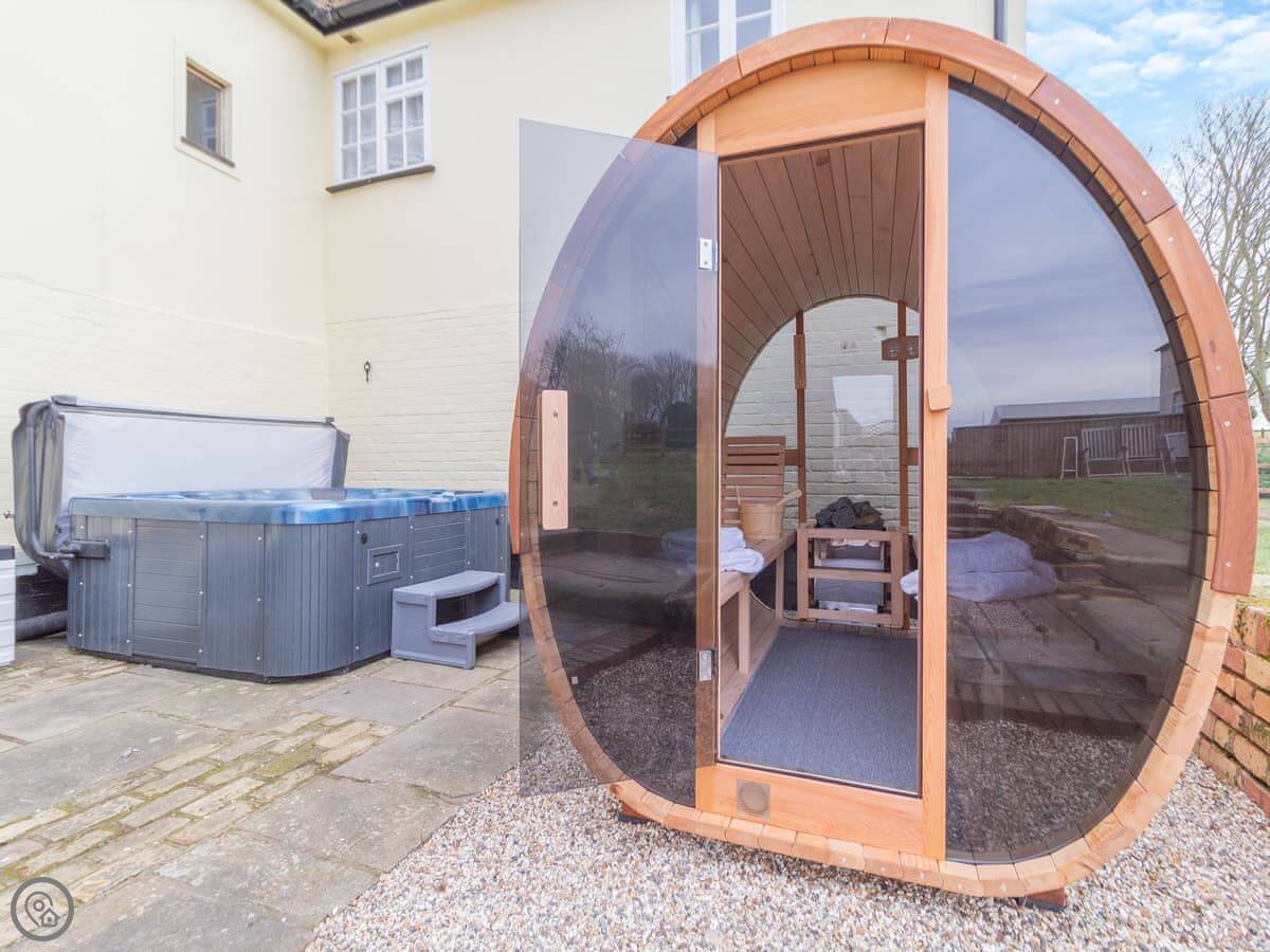 The kitchen is big, with a table for everyone. There's a wood burner in the sitting room. Outside, there's a fenced garden. It has a hot tub and a sauna on the patio. There's also a separate deck with a table under a pergola.