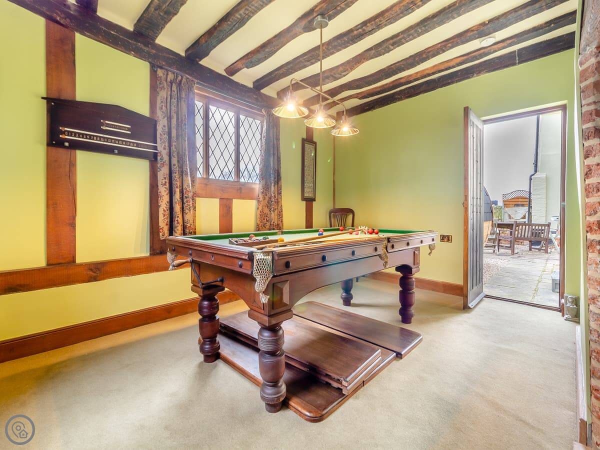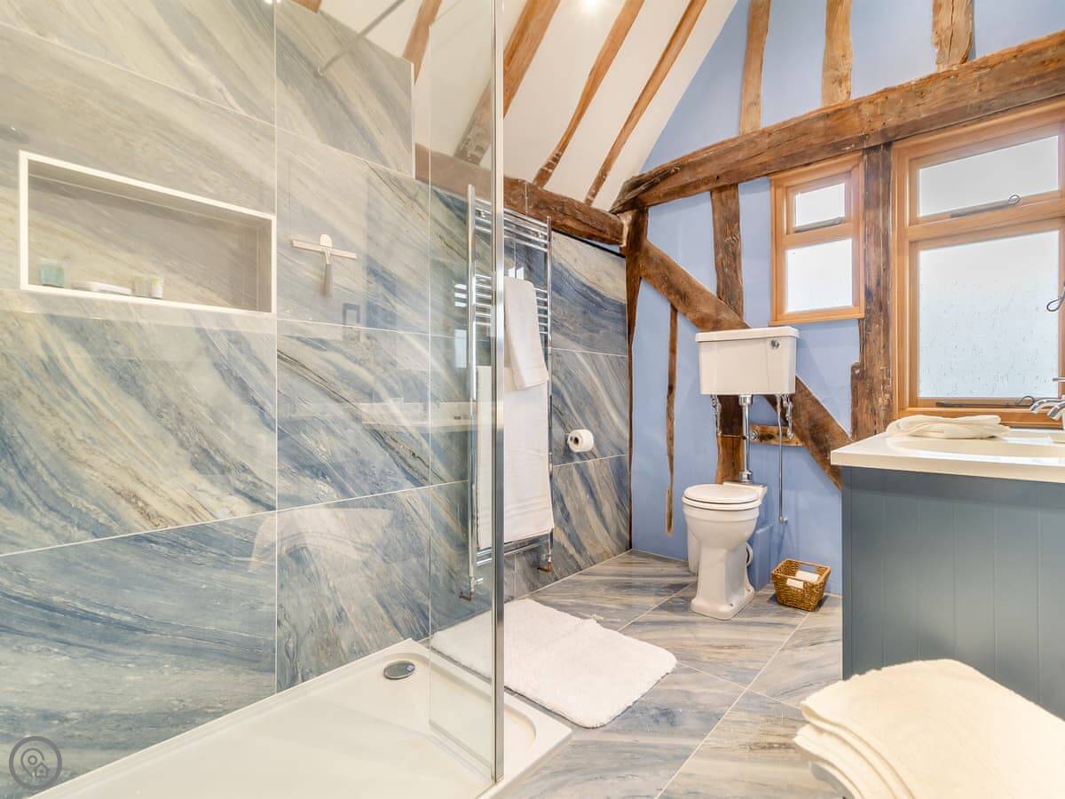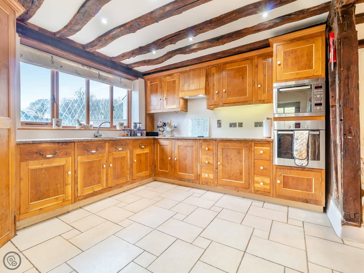 It sleeps eight. Four bedrooms, each with its own bathroom. The rating is 4 Star. It's been done up, but it's still an old place. The ceilings are low in parts and the beams are proper old timber. You'll need to mind your head.