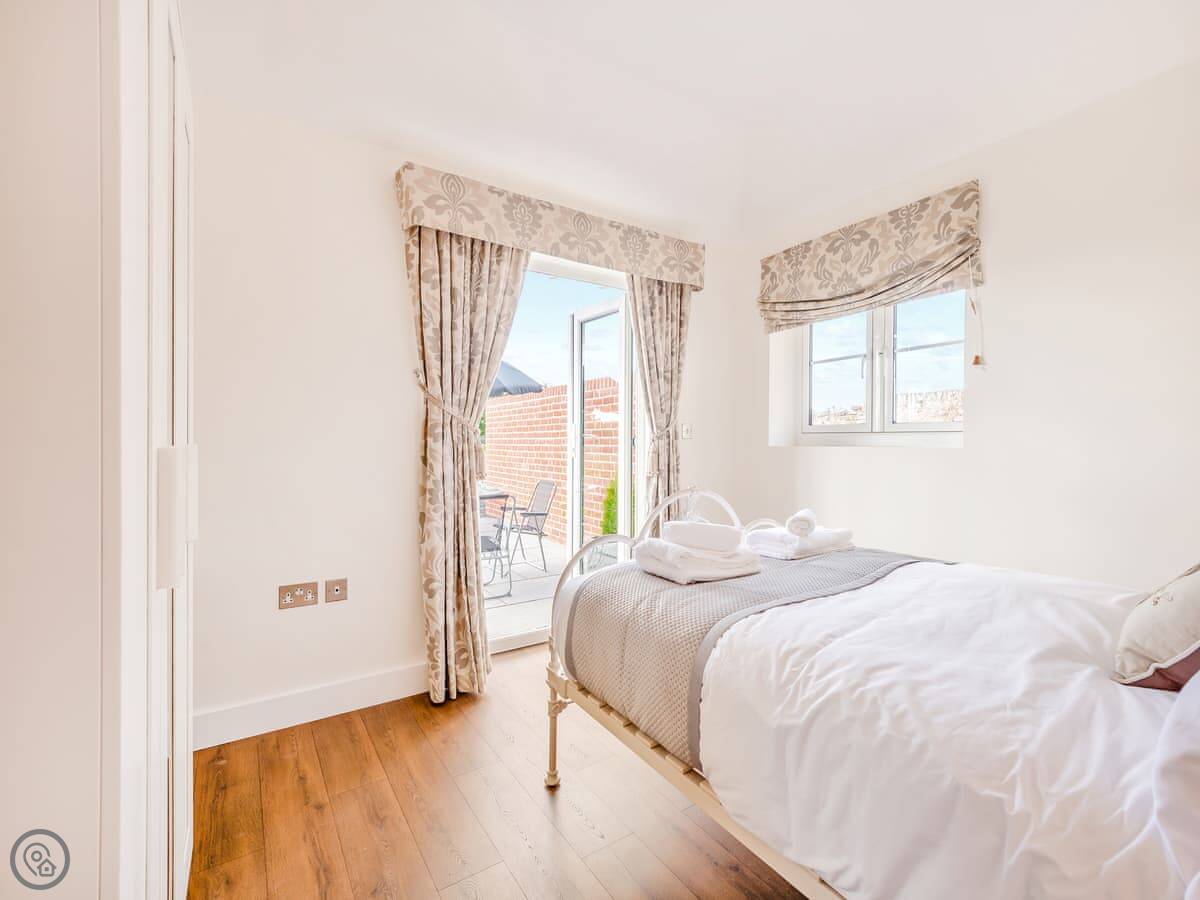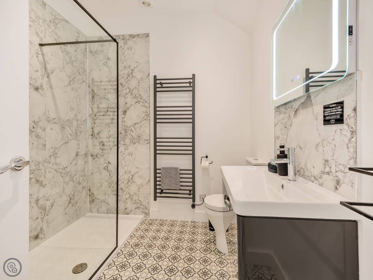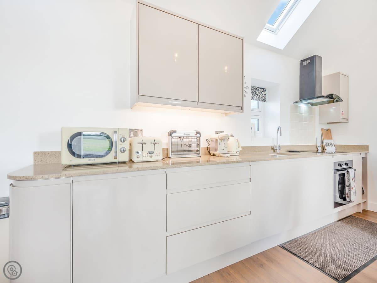 It sleeps four. Two bedrooms, both downstairs. They each have their own shower room, which is handy. It's got a 4 Star rating. It's comfortable and everything is new, but it's not enormous. The main room is open plan, with the kitchen, dining and sitting area all together.