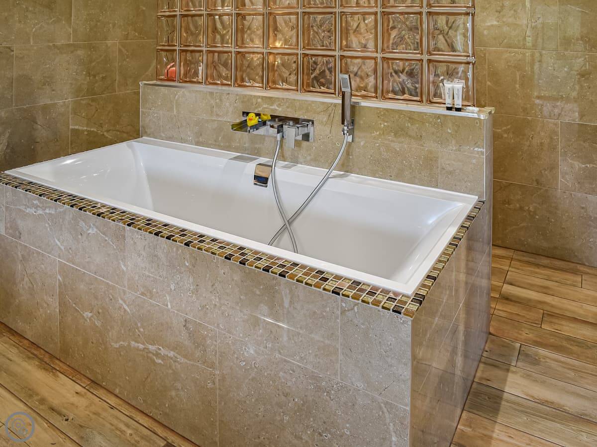 It's got a 4 Star rating. The layout is open-plan downstairs, with the kitchen and living area. Upstairs is just the one bedroom. The bed is a king size. The bathroom is up there too, it's part of the bedroom. It has a bath and a separate shower.