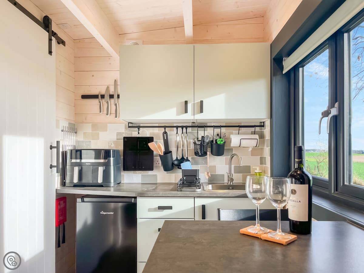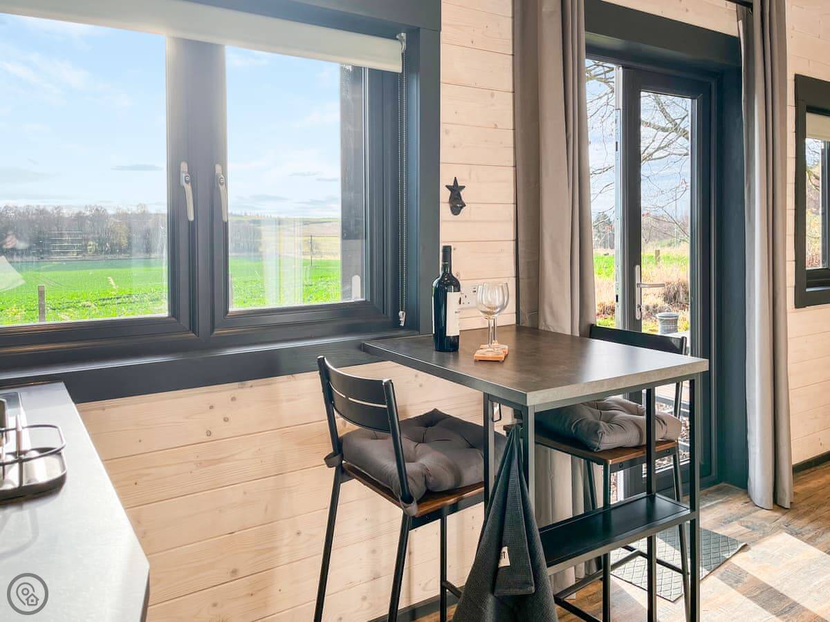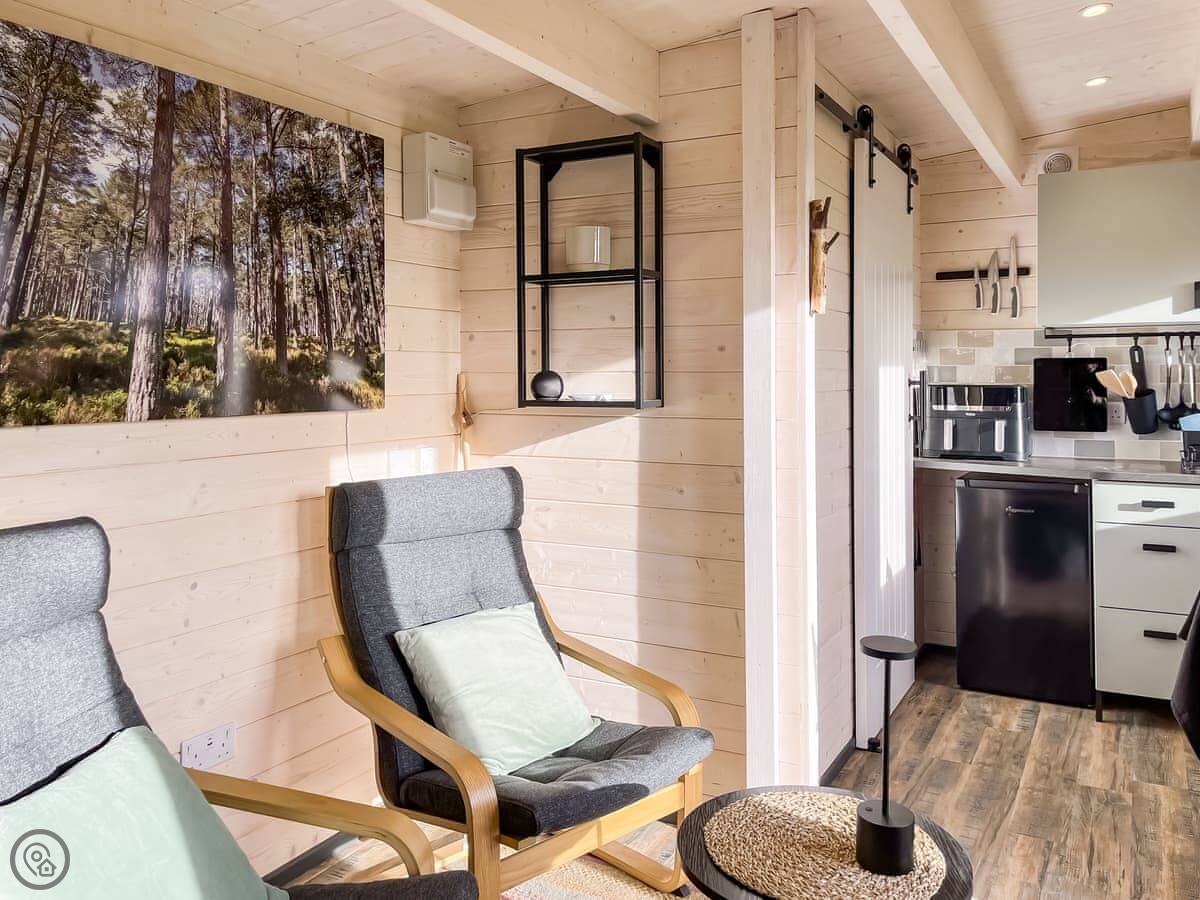The cabin is 6 metres by 3 metres. Inside there's a kitchenette, a table with stools, and a couple of armchairs. It's compact but it's laid out well so it doesn't feel cramped.