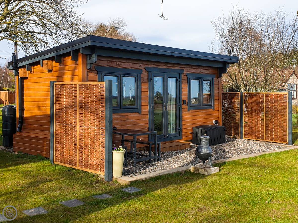 Outside there's a veranda with a picnic table and a chiminea. The garden area is enclosed. You park up by the road and walk down a short gravel path to the cabin. It's lit for the evening.