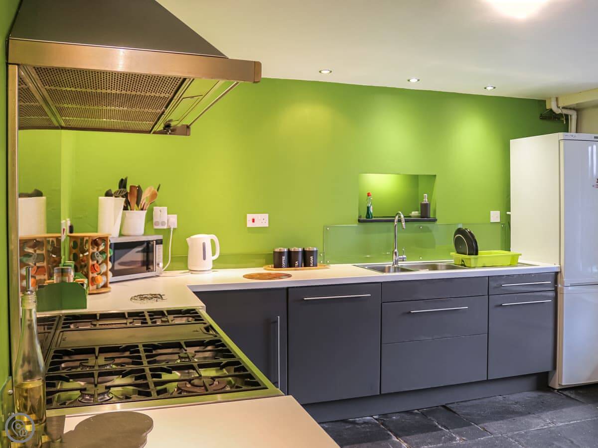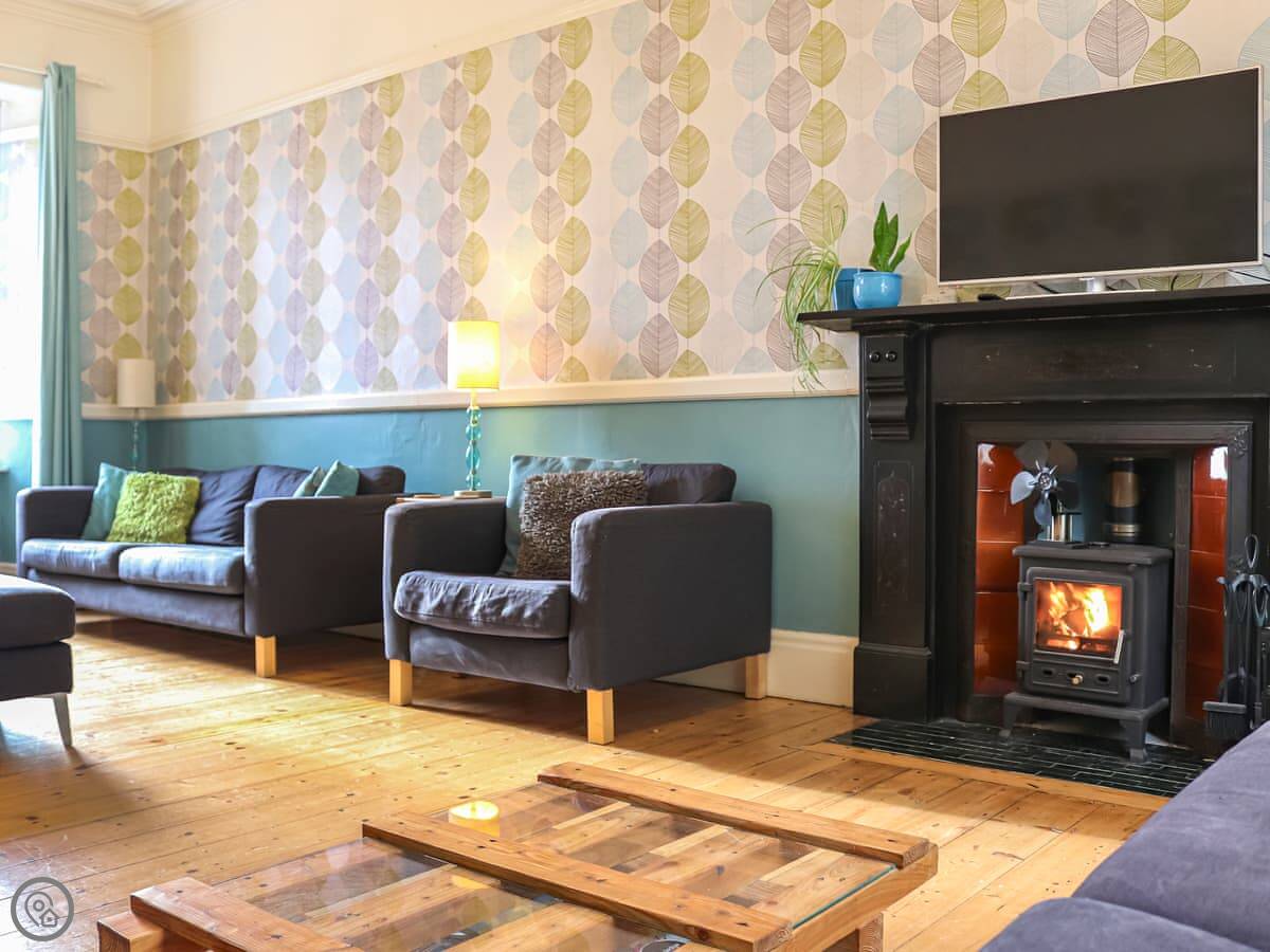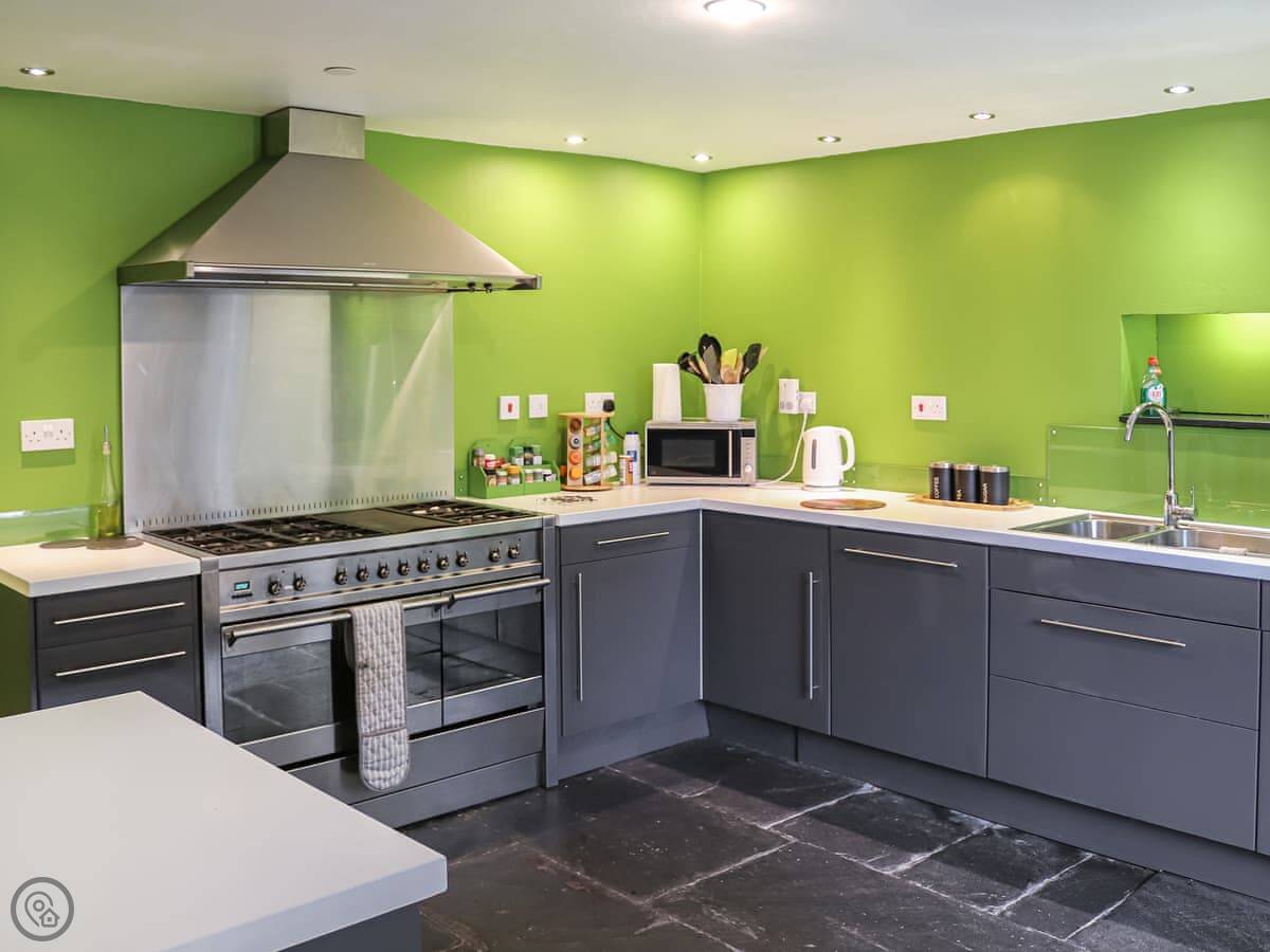 It sleeps fourteen, which makes it good for big groups or families. There are six bedrooms and three bathrooms. It's got a 4 Star rating. The kitchen is big and has what you need. The dining room table is long, so everyone can sit together. There's a woodburning stove in the living room, which is good for cooler evenings.