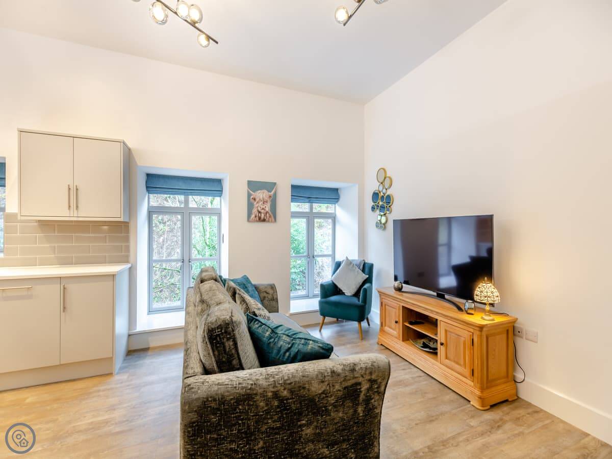 The main space downstairs is all open-plan. Kitchen at one end, sitting area at the other. The ceilings are quite high because of the old loom, so it feels bigger than it is. The stairs going up are steep, like most old cottages here. You get two private parking spaces right outside, and one has an electric vehicle charger.