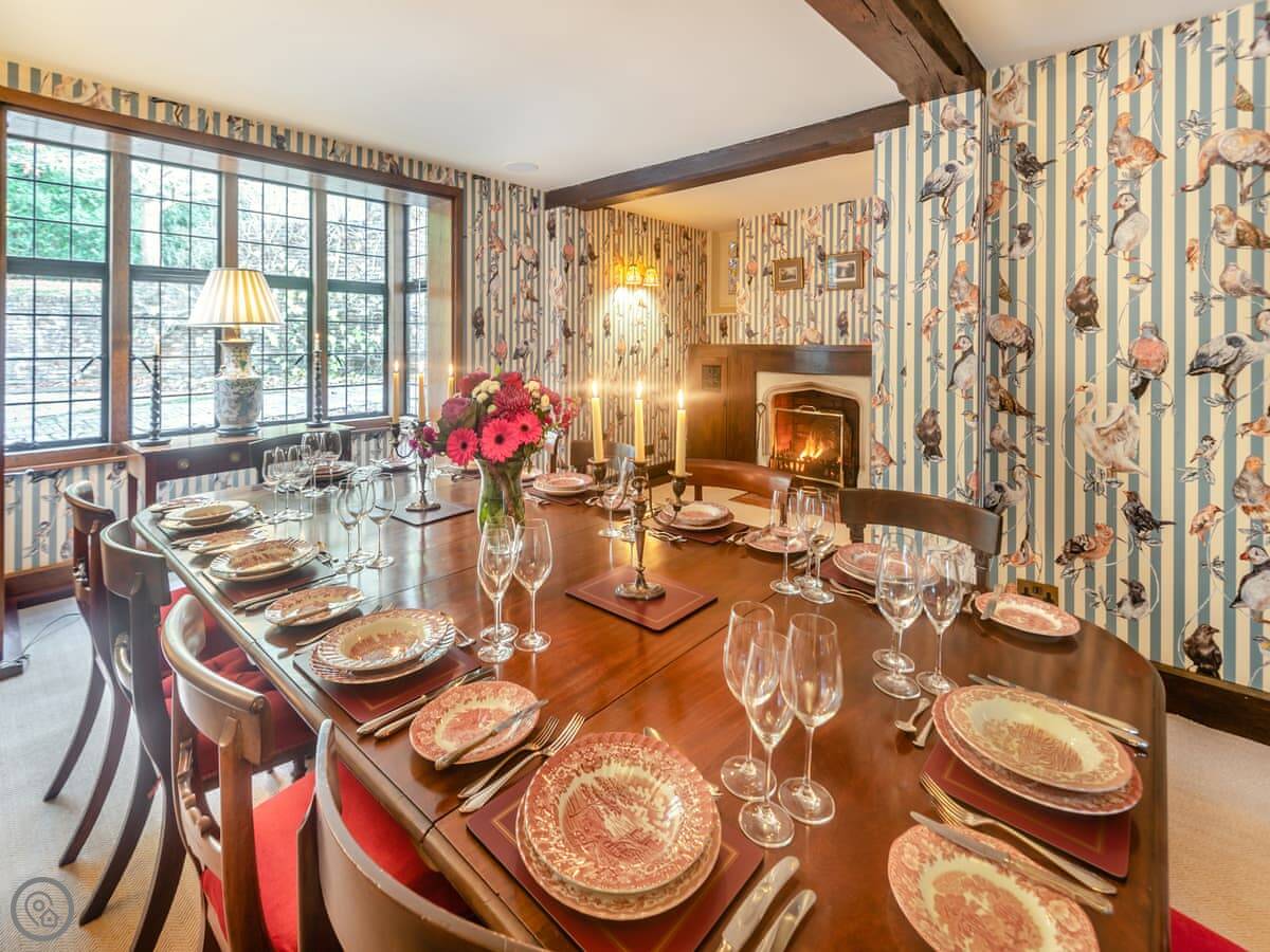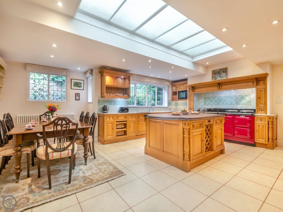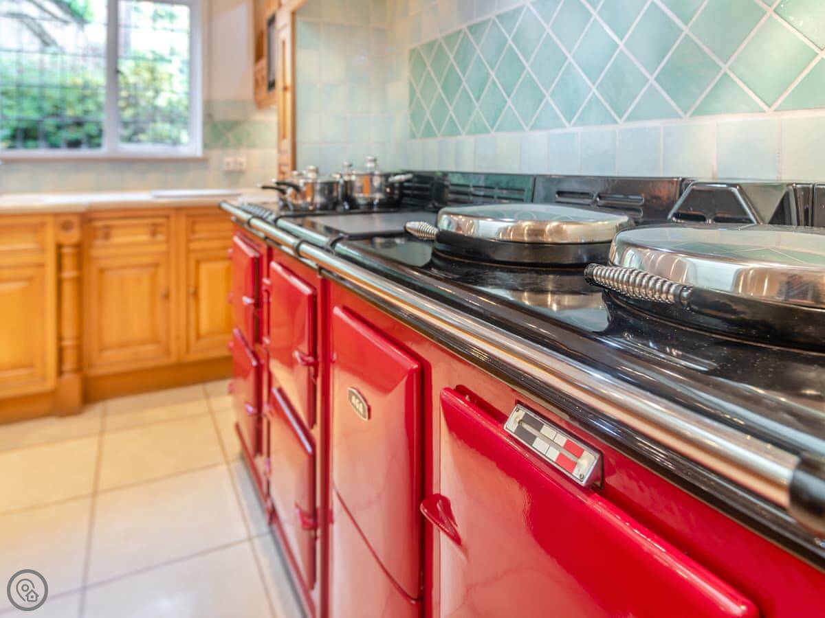 Downstairs, there's a big living room with an open fire. The kitchen has an AGA cooker and a dishwasher. There's a washing machine too. Bedding and towels are included.