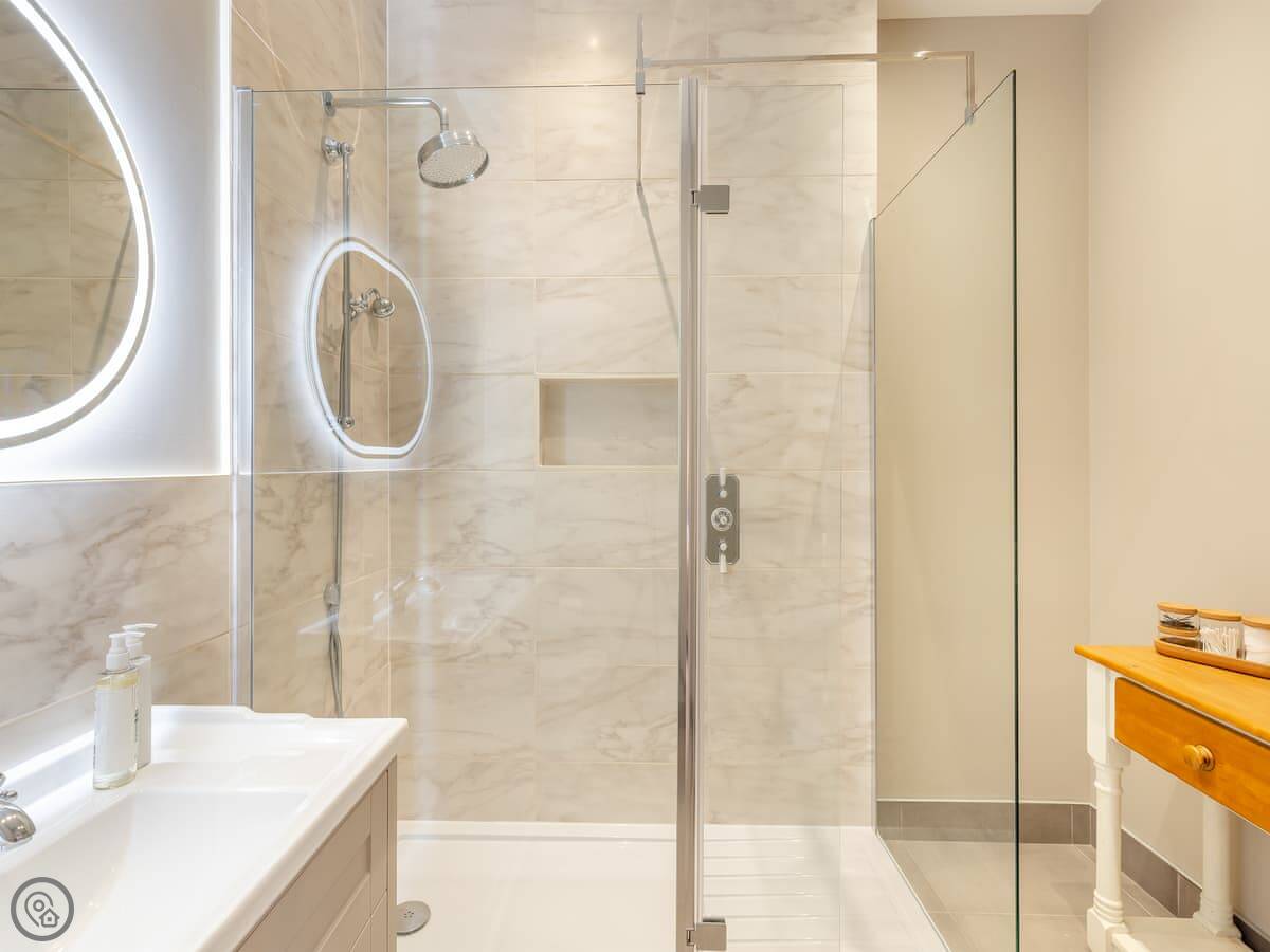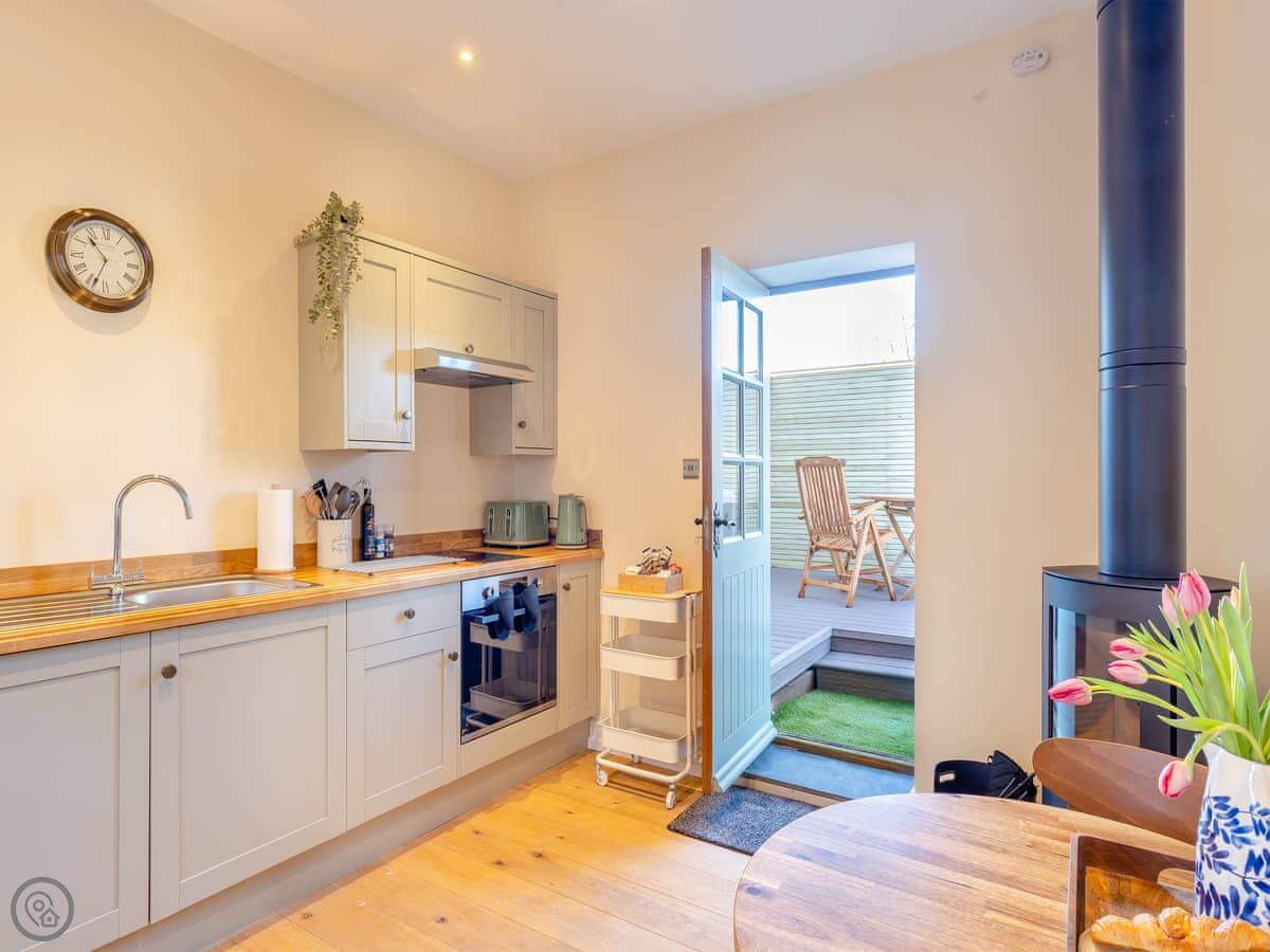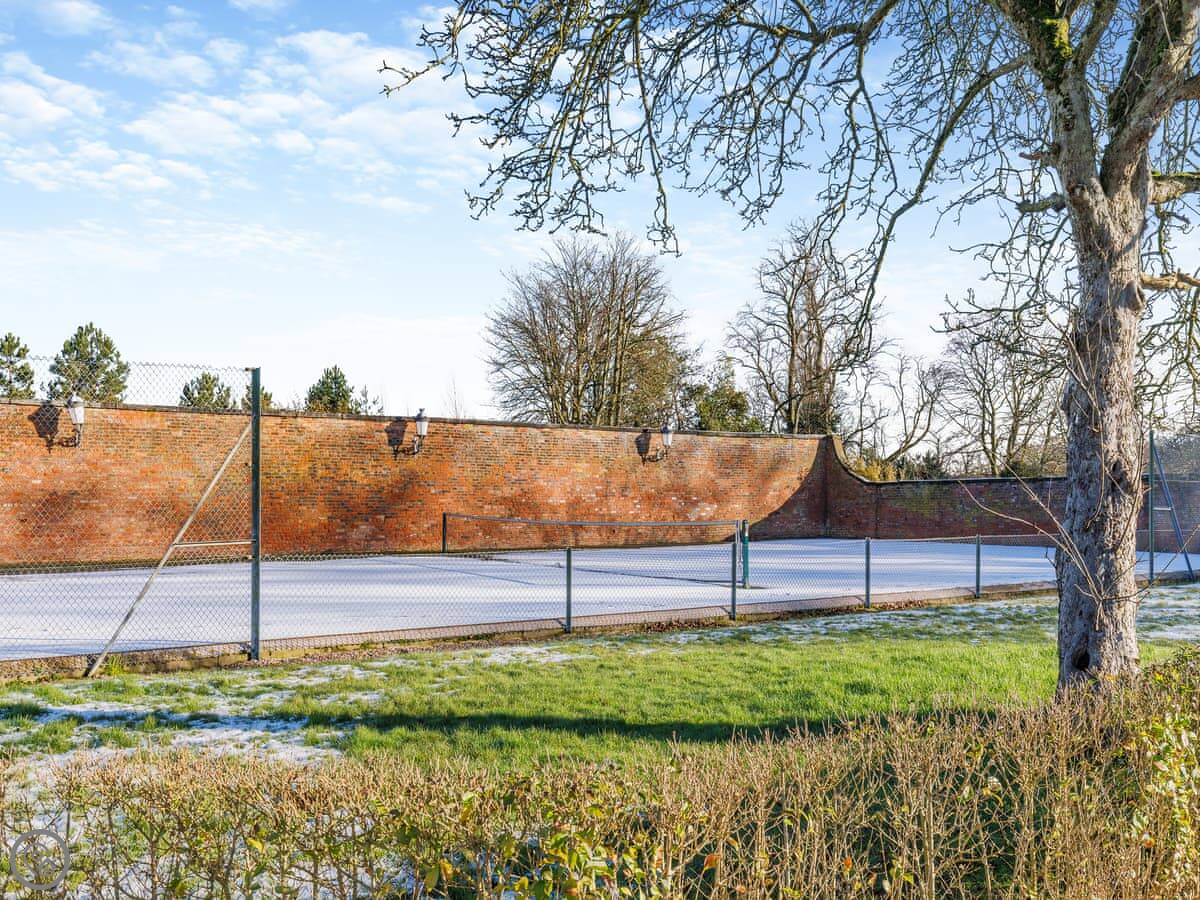You've got your own enclosed garden patio with a hot tub. There's also a shared tennis court on the estate you can use. The cottage is open plan downstairs, with a wood burning stove. There's parking right outside.