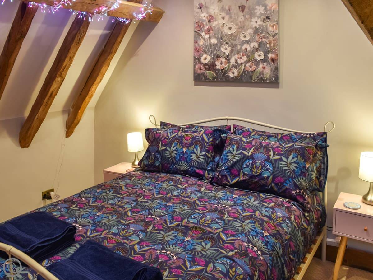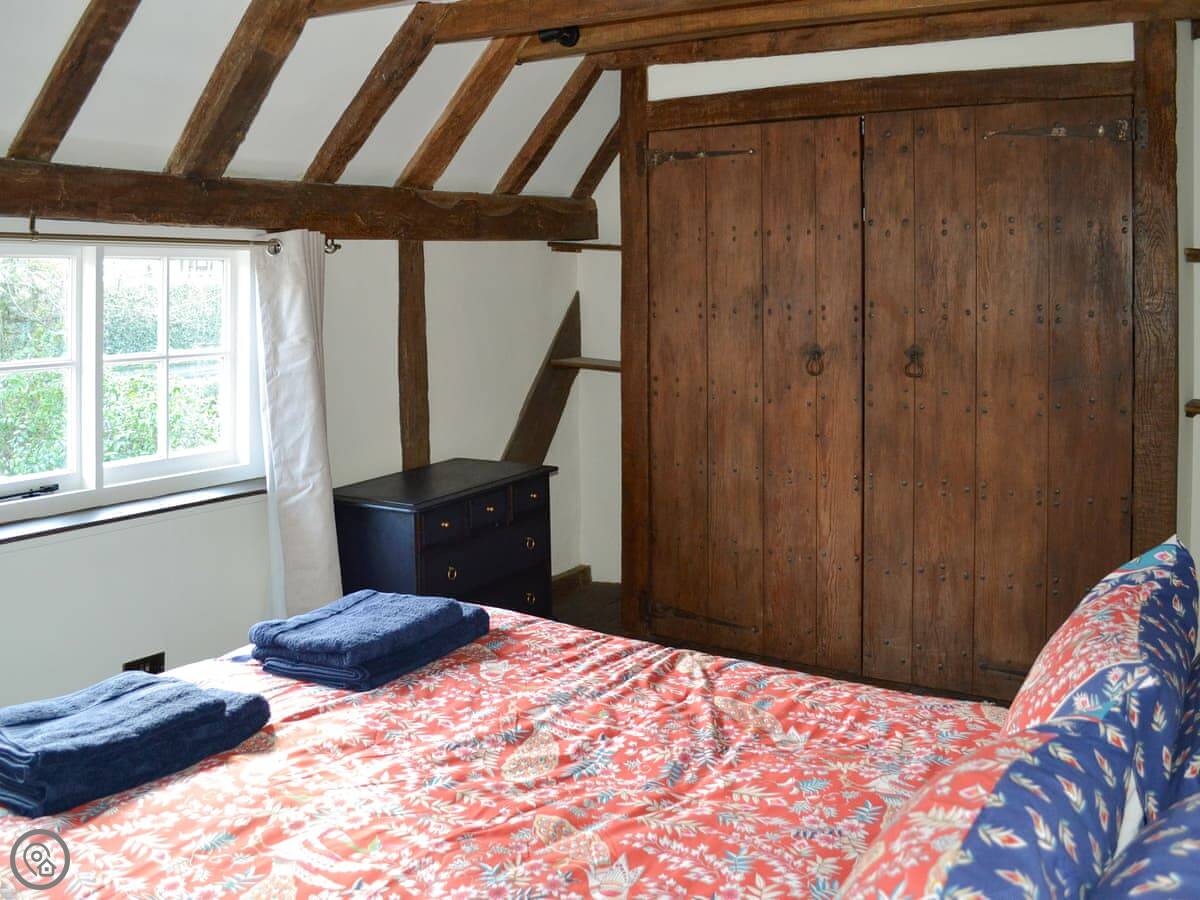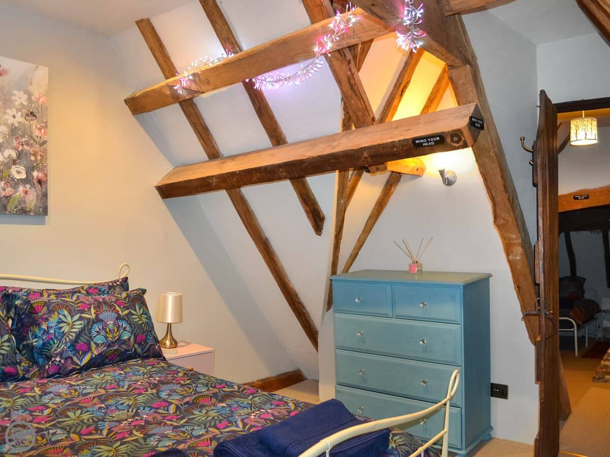 It sleeps eight people in four bedrooms. There are two bathrooms. One is an en-suite off the main bedroom. That bedroom has a super kingsize bed and a floor that slopes a bit. The stairs up to the top floor bedrooms are steep. They're original, so they're narrow and turn a corner. Not great if you have trouble with stairs.