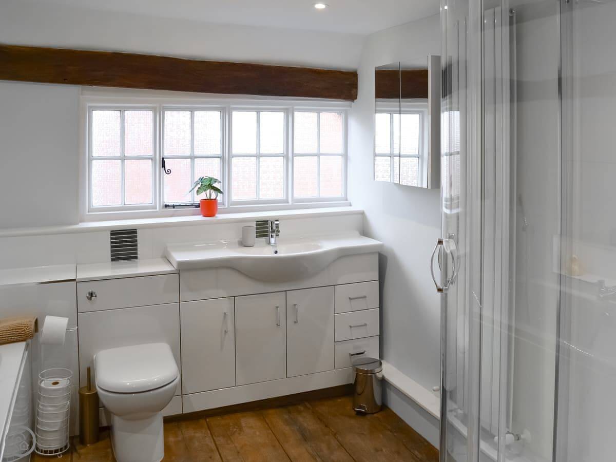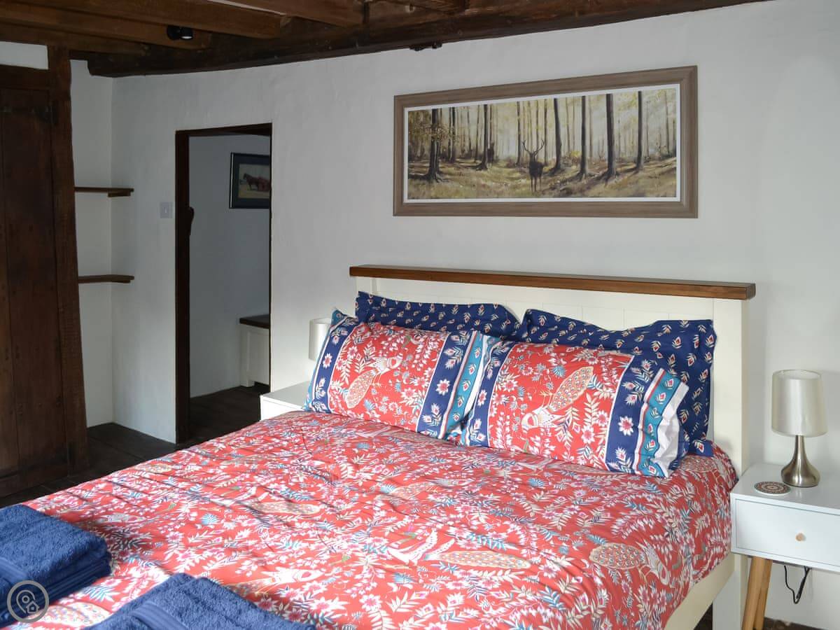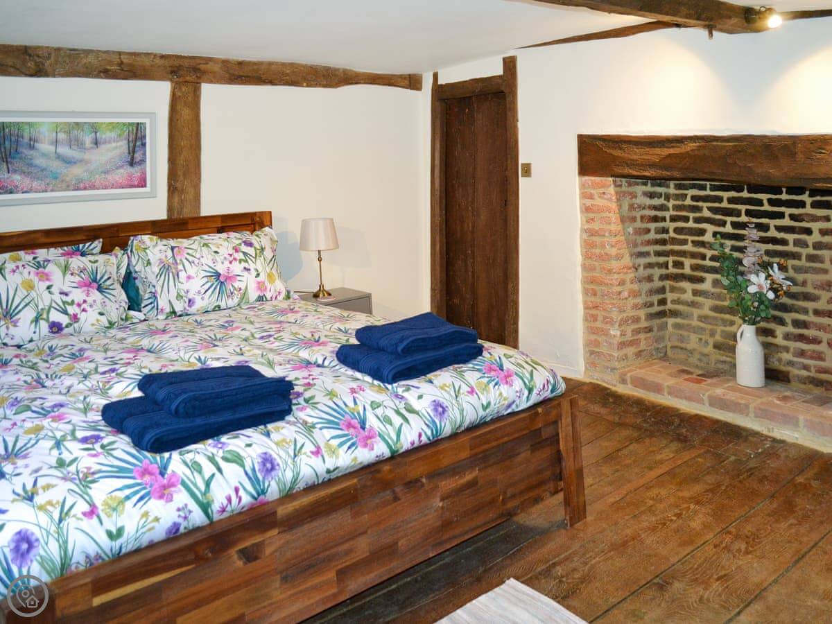 It sleeps eight people in four bedrooms. There are two bathrooms. One is an en-suite off the main bedroom. That bedroom has a super kingsize bed and a floor that slopes a bit. The stairs up to the top floor bedrooms are steep. They're original, so they're narrow and turn a corner. Not great if you have trouble with stairs.