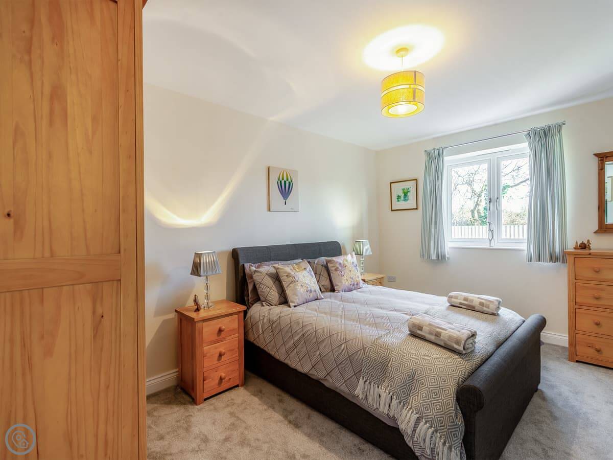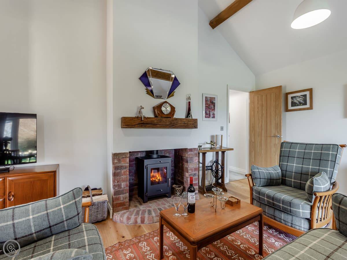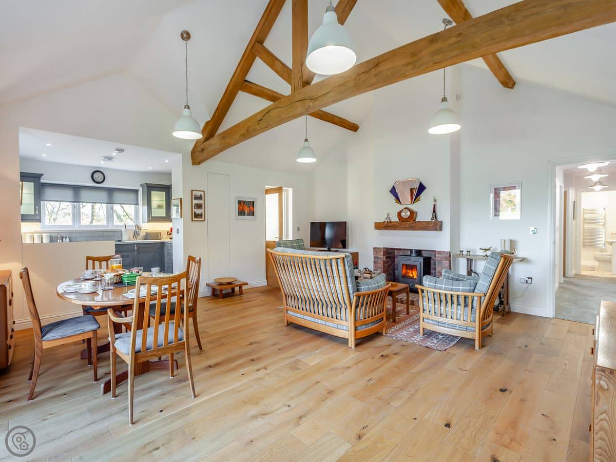 It sleeps four. Two bedrooms and one bathroom, which has a shower over the bath. It's got a 4 Star rating. That means it's comfortable and well equipped. The main room is open plan, so the kitchen, dining and living area are all together. There's a wood burner for cooler evenings.