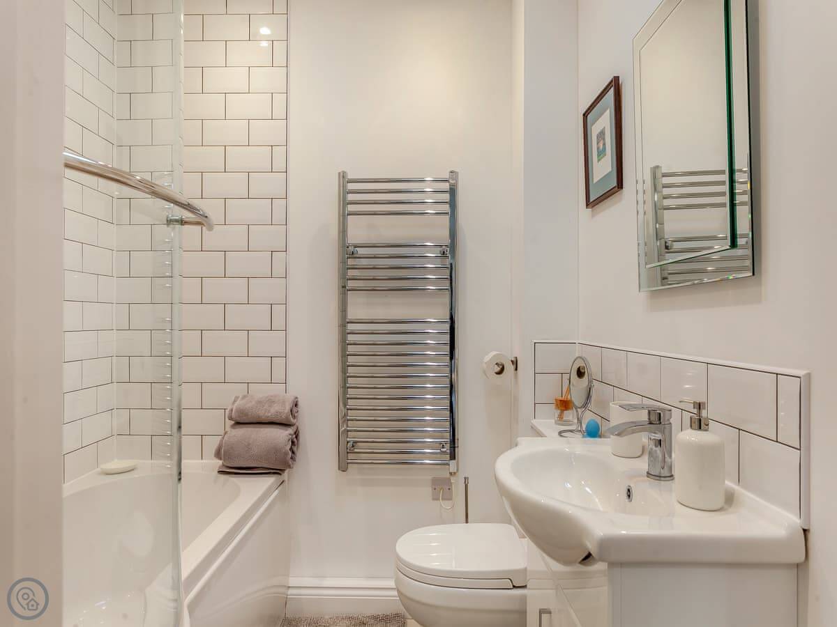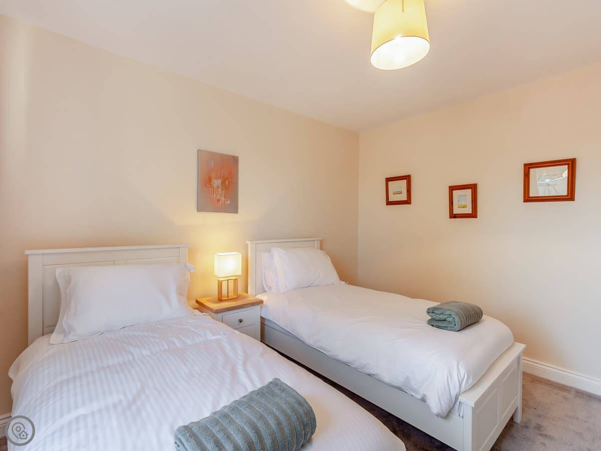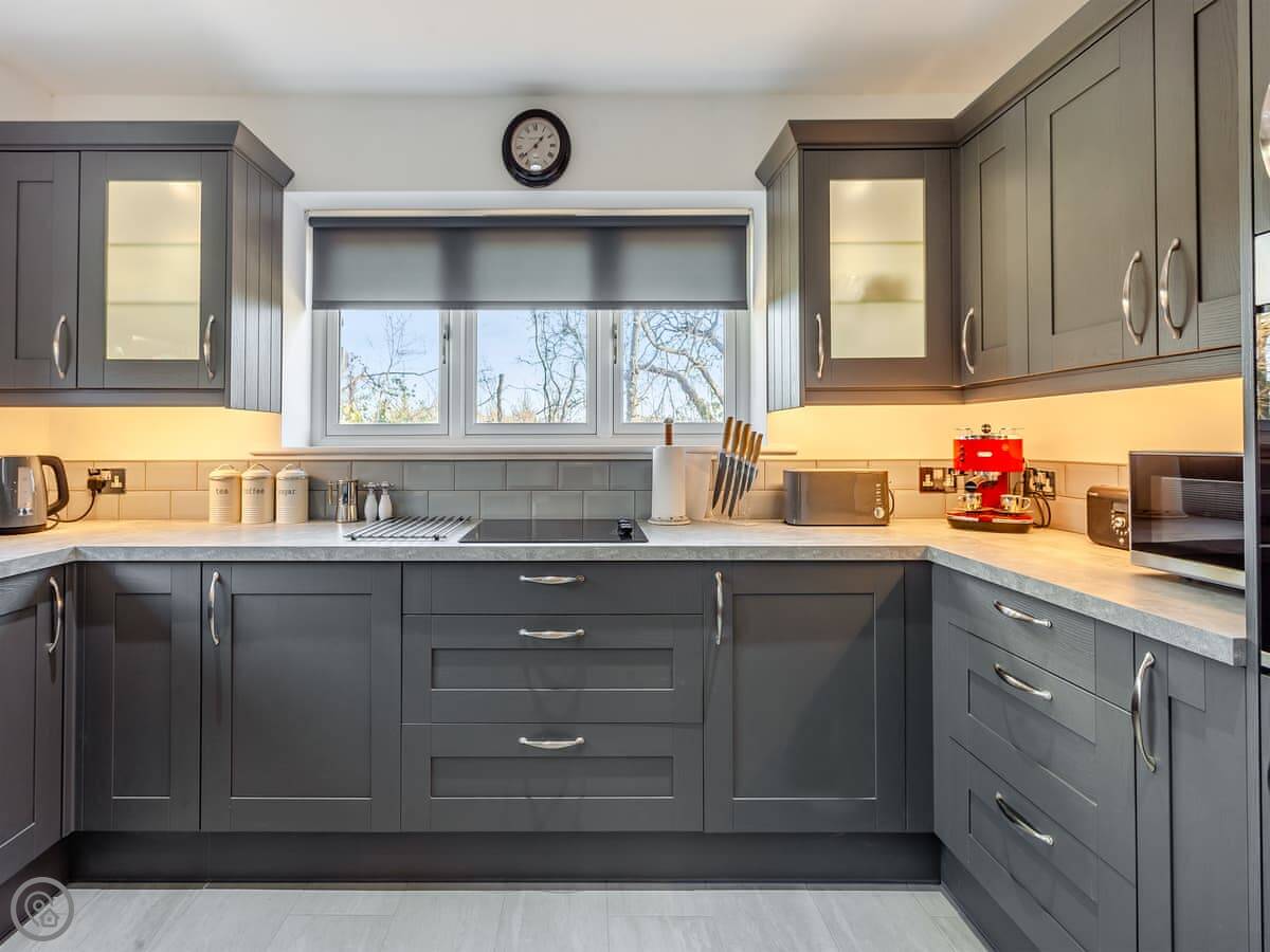 It sleeps four. Two bedrooms and one bathroom, which has a shower over the bath. It's got a 4 Star rating. That means it's comfortable and well equipped. The main room is open plan, so the kitchen, dining and living area are all together. There's a wood burner for cooler evenings.