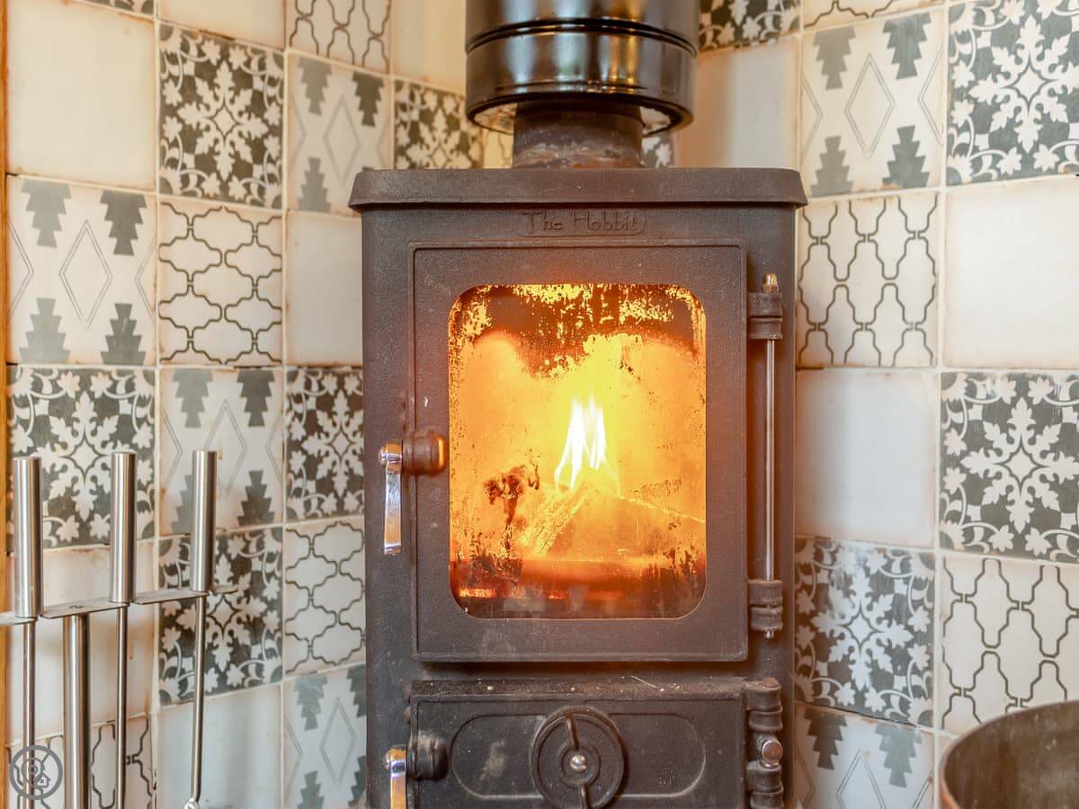 The hut itself is one room with a wood burner, a kitchen area, and a bed. It's all open plan. There's a TV, WiFi, and the bedding is supplied. Outside, there's a deck with seating and a brick BBQ.