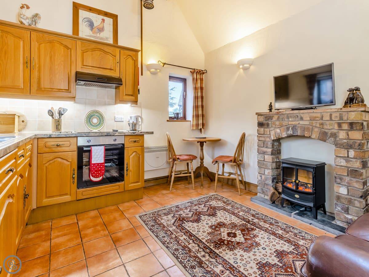 You've got your own patio area with a table and chairs. There's parking right outside the door. Inside, there's an open plan living area with a kitchen, a sofa, and a TV. There's an electric stove that looks like a wood burner. It puts out a decent heat. There's a washing machine too. Bedding and towels are included.
