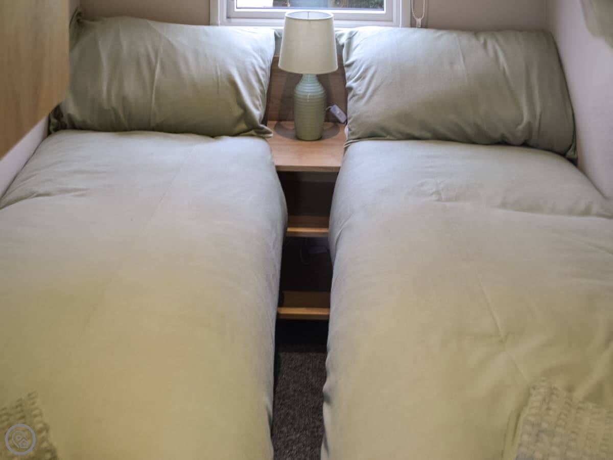 It sleeps six, in three bedrooms. One double, two twins. There's one bathroom with a shower. It's a 4 Star rating, which means it's well-equipped and comfortable, but it's still a mobile home. The layout is open plan.