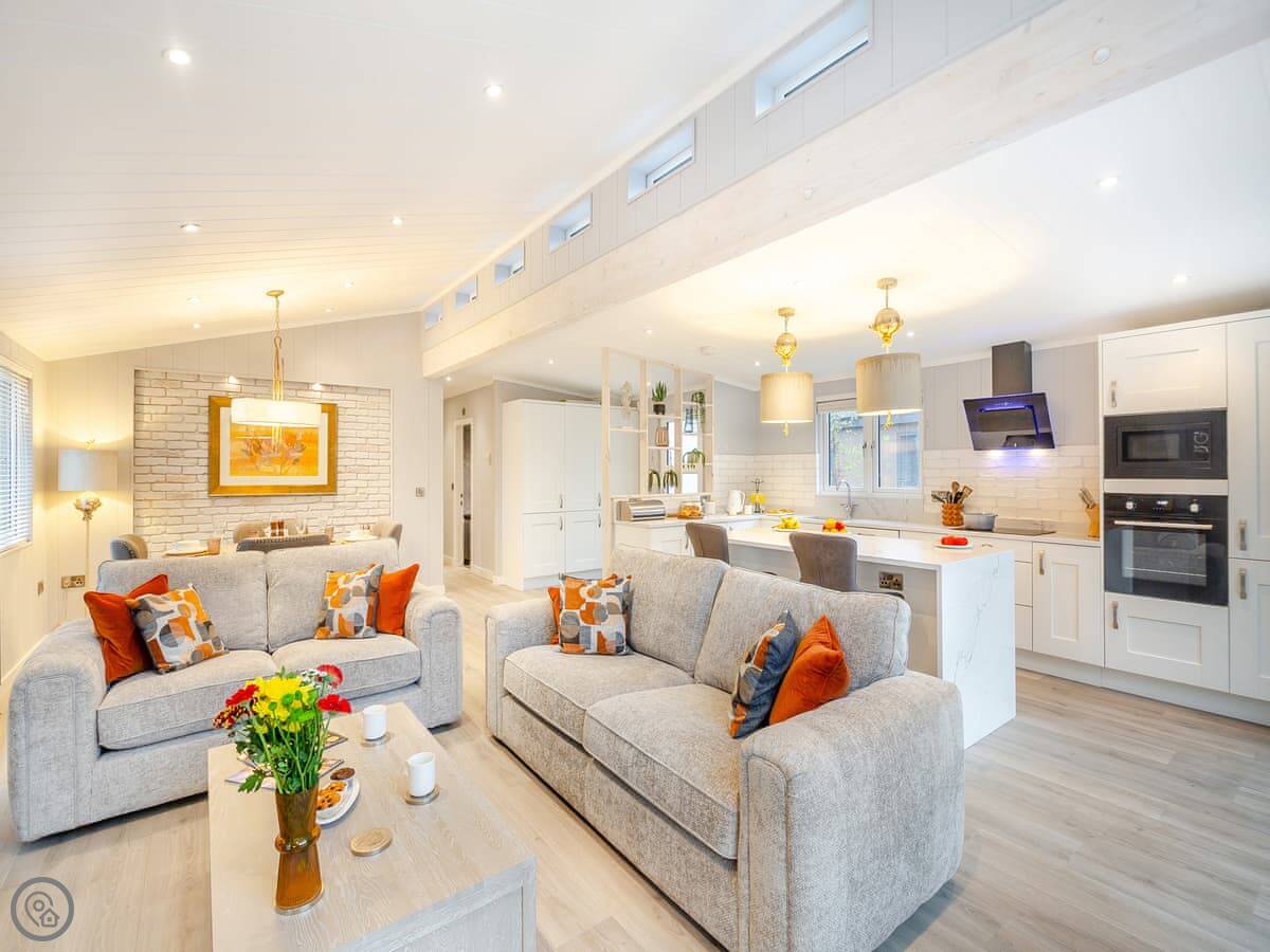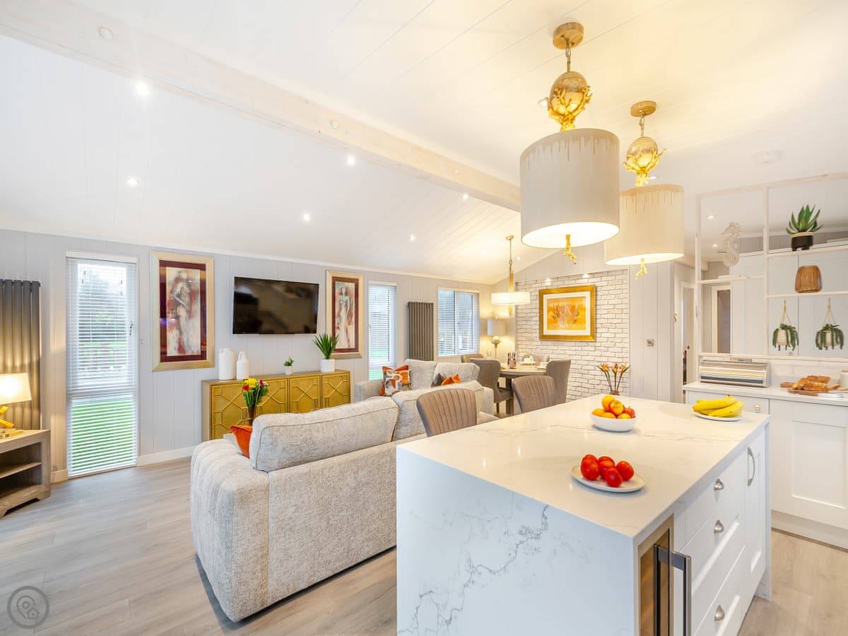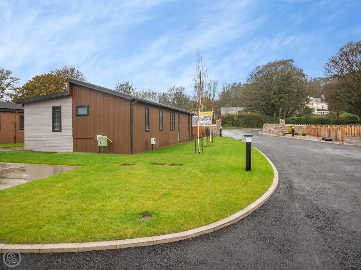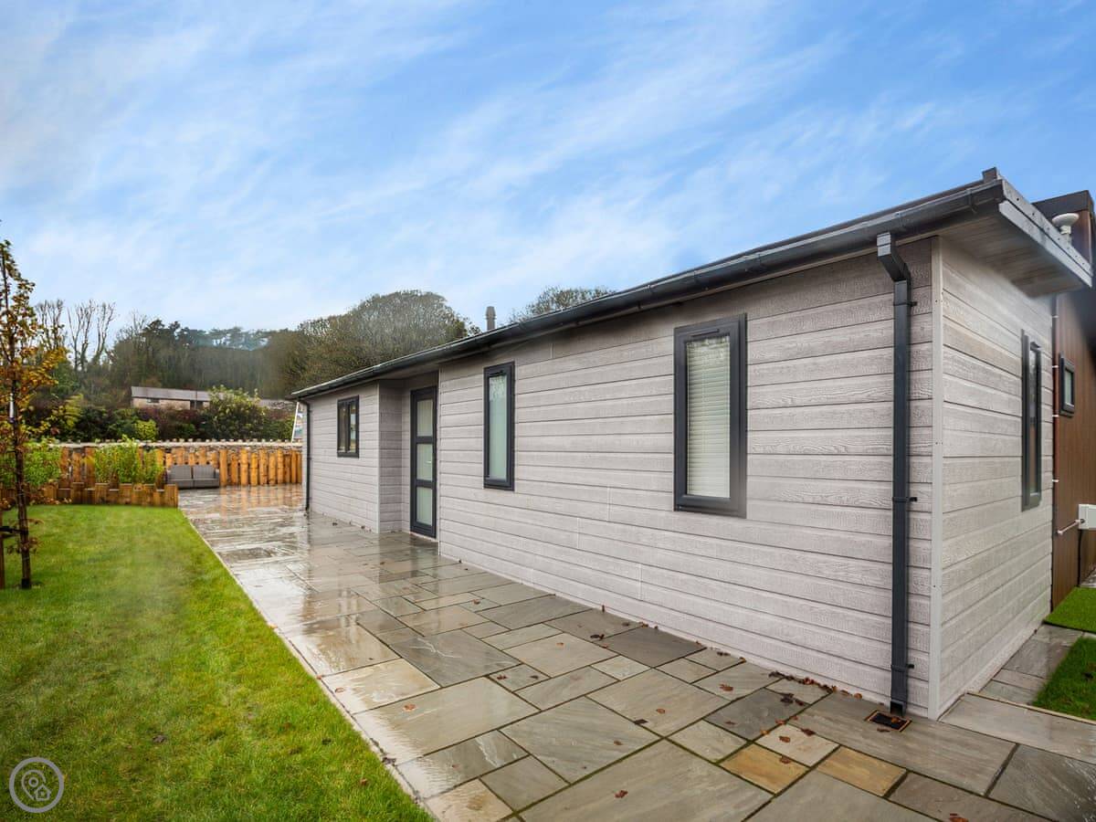 Outside, there's a private patio with a sunken hot tub. You get the space to yourselves. The site is new, so you might see other lodges being delivered while you're there. It shouldn't be too disruptive.