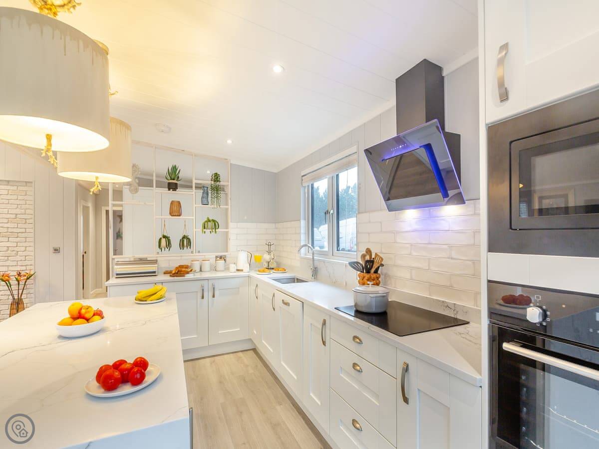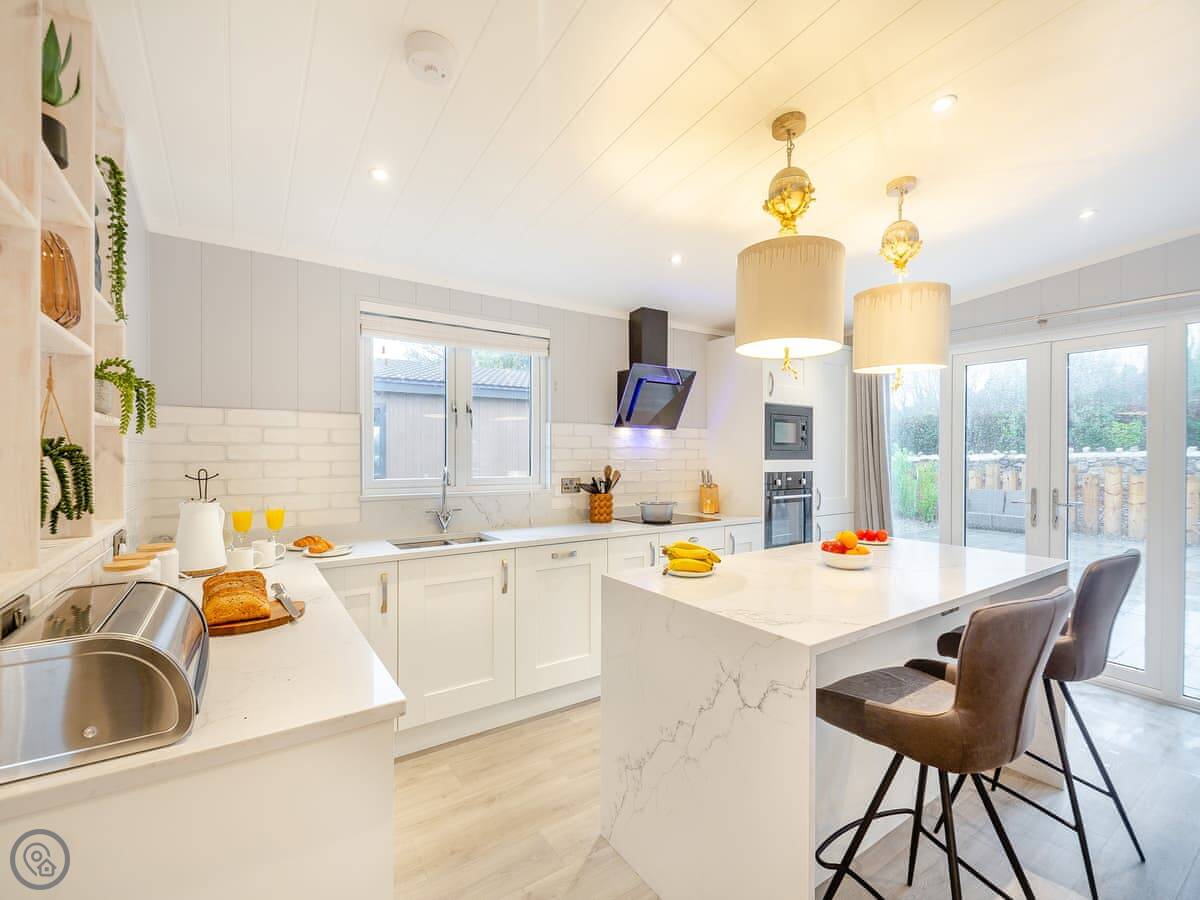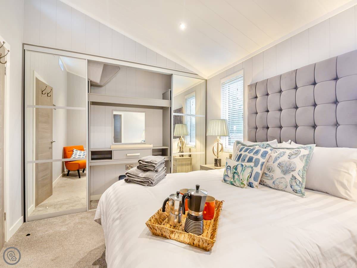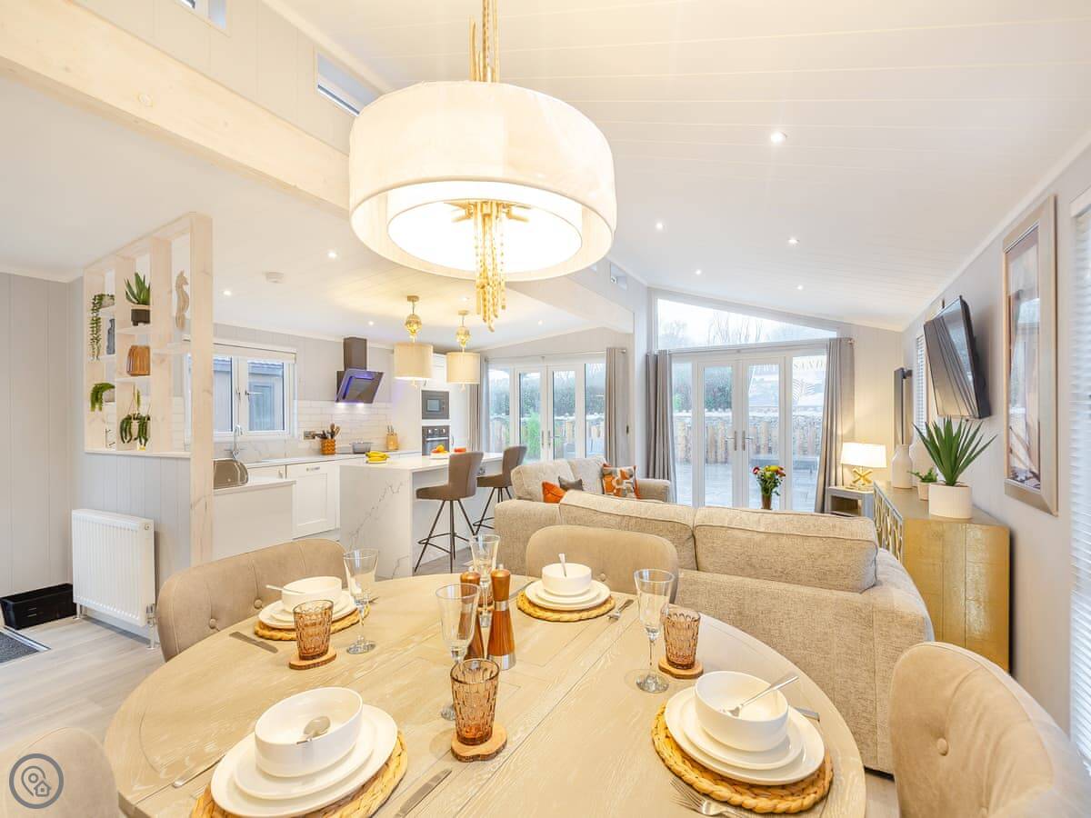 Outside, there's a private patio with a sunken hot tub. You get the space to yourselves. The site is new, so you might see other lodges being delivered while you're there. It shouldn't be too disruptive.