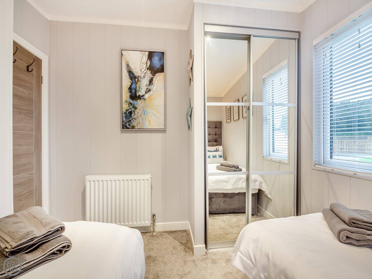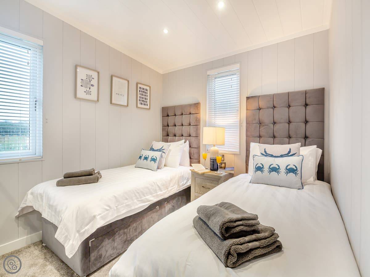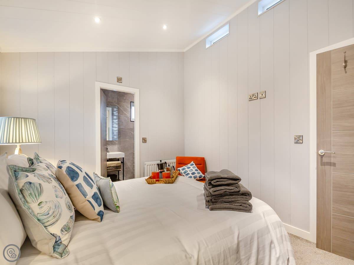 It's got a 4 Star rating. It's a modern, open-plan place. The main bedroom has a king-sized bed and an en suite shower. The second has twin beds, and there's a family bathroom with a bath. Everything's clean and straightforward.