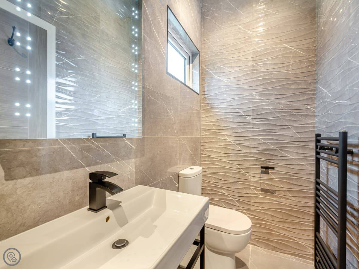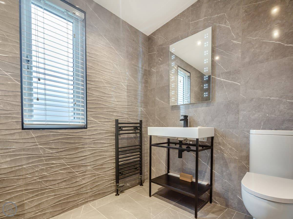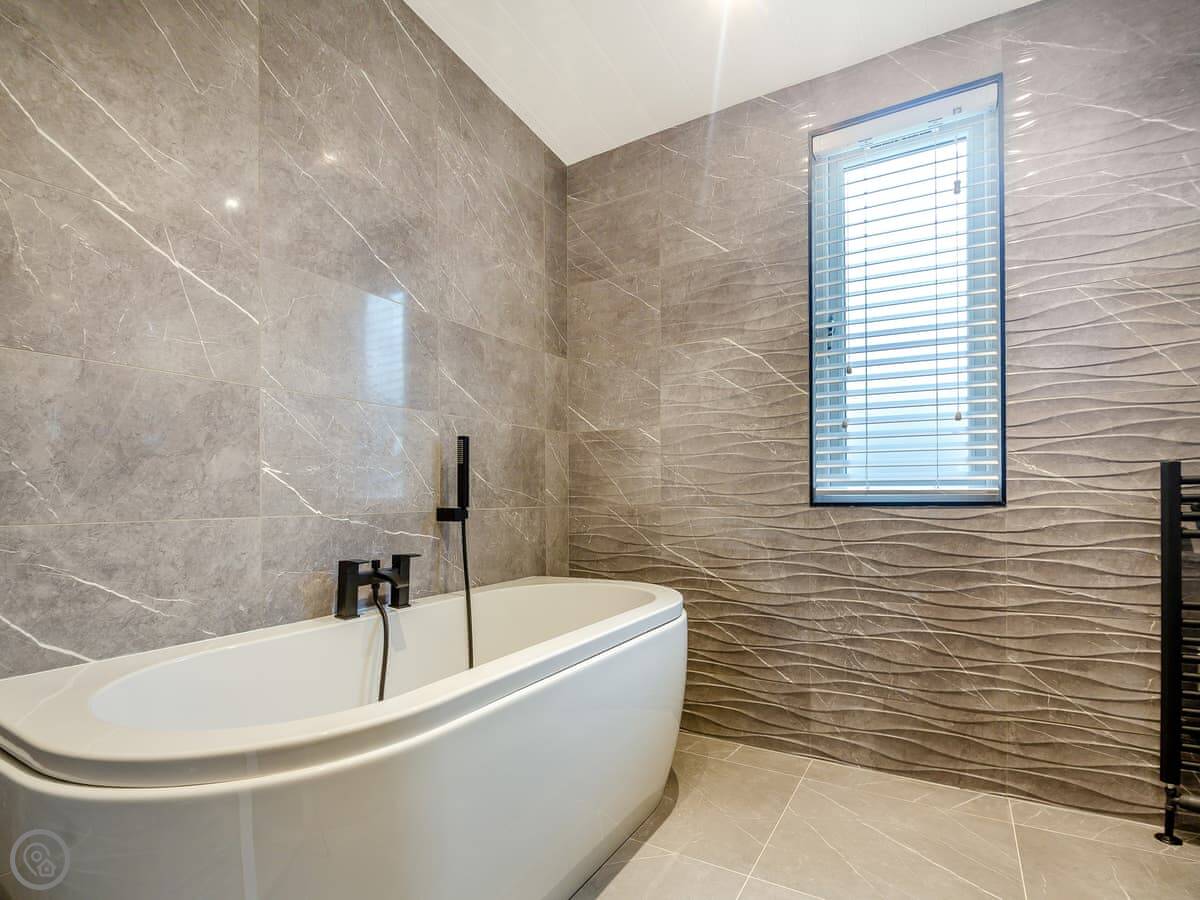 It's got a 4 Star rating. It's a modern, open-plan place. The main bedroom has a king-sized bed and an en suite shower. The second has twin beds, and there's a family bathroom with a bath. Everything's clean and straightforward.