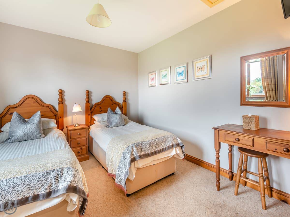 The cottage sleeps five. Two bedrooms, both with their own bathrooms. One has a king bed and a shower room. The other has two singles and a bath with a shower over it. Downstairs is all open plan: kitchen, living area, and dining. French doors lead out to your own patio area. That's where the hot tub is. The patio is partly fenced.