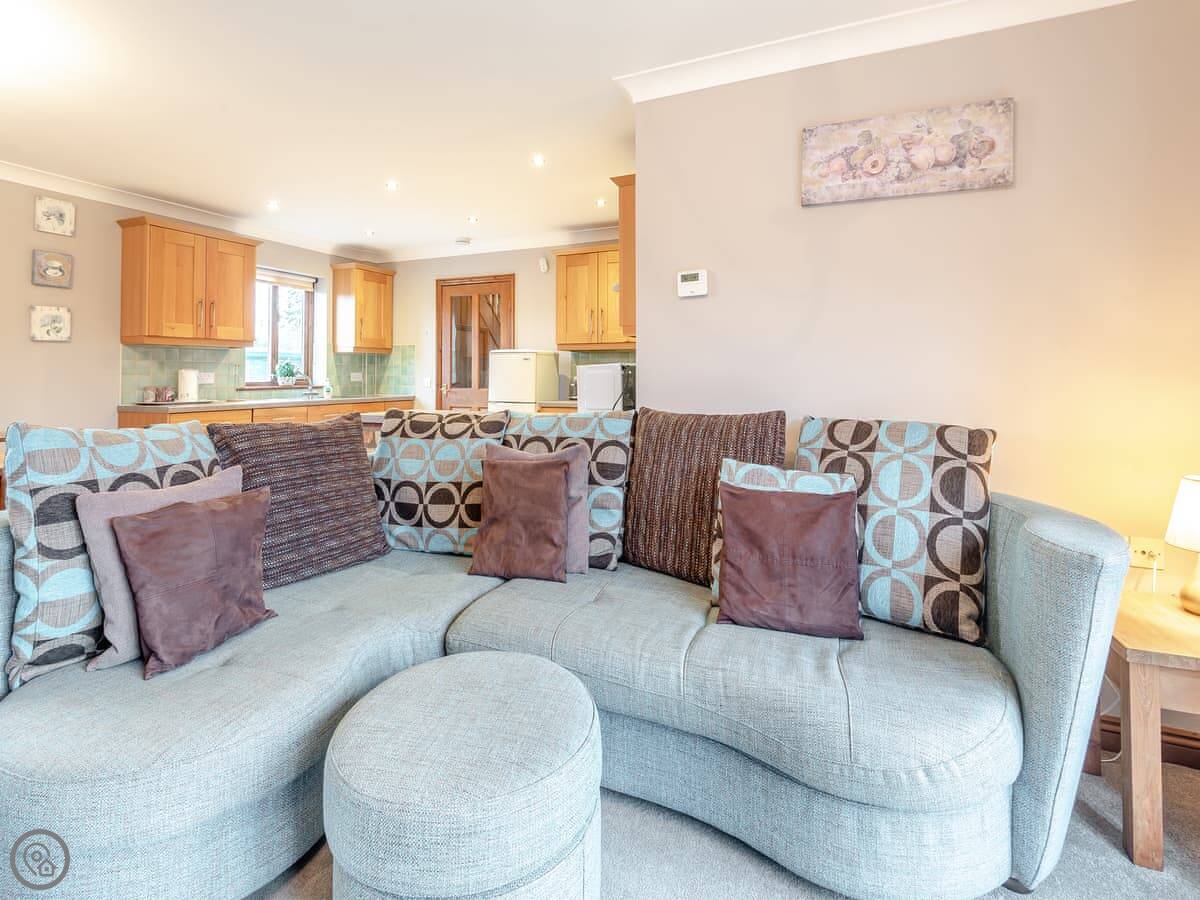 The cottage sleeps eight. Three bedrooms, two bathrooms. It's got a 4 Star rating. It's modern inside, clean and in good order. The kitchen is open plan with the living area, so everyone's together. It's got a solid oak kitchen with a dishwasher and that. All the bedding and towels are included.