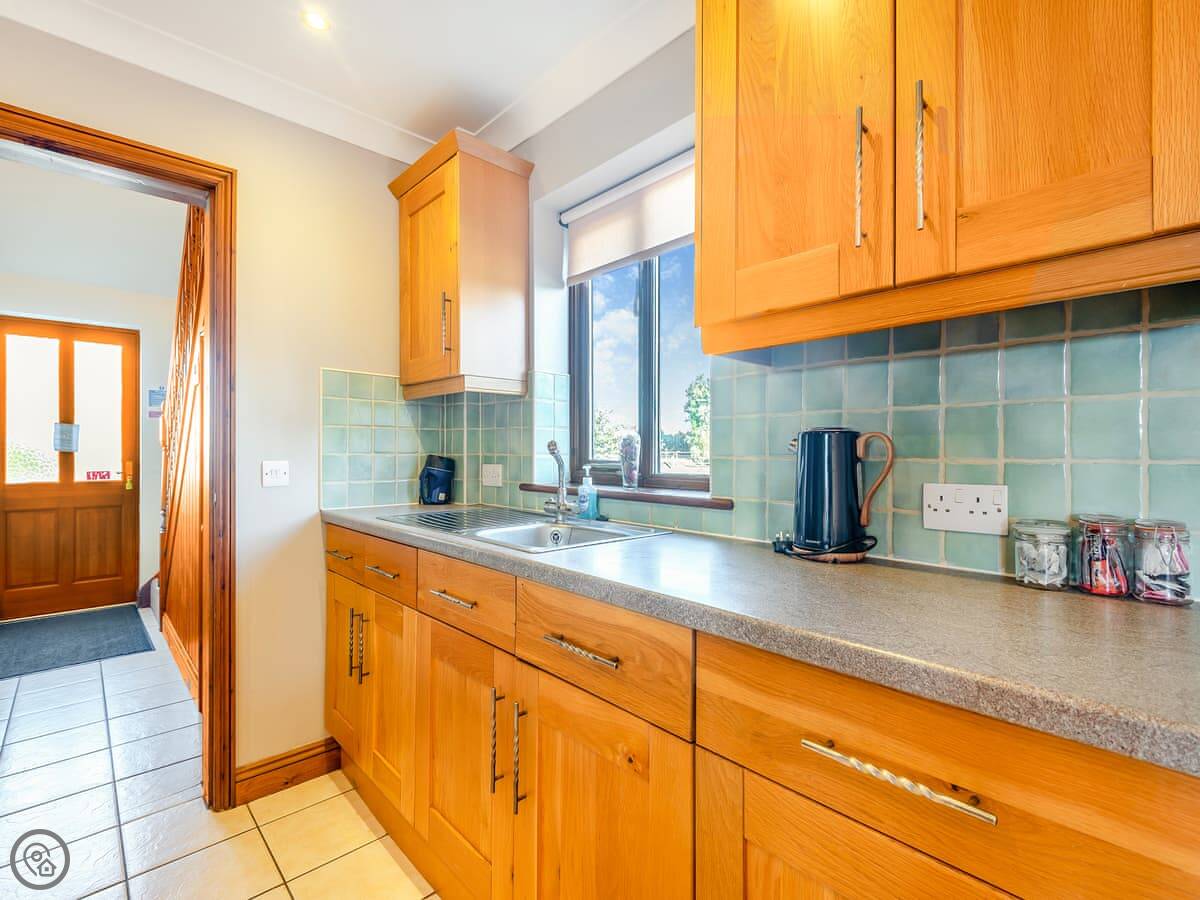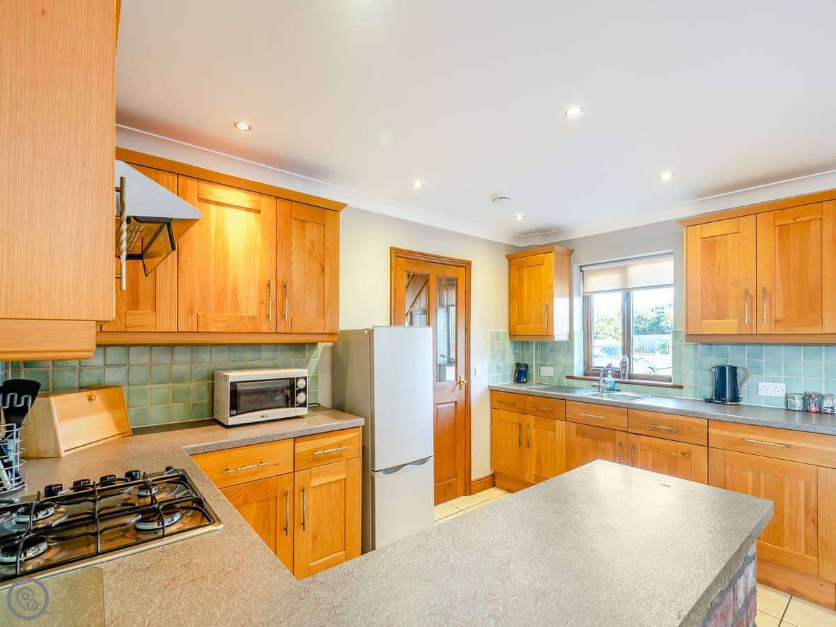 The main living space is open plan: kitchen, dining area, and sitting area all together. The kitchen has what you'd need: oven, fridge-freezer, microwave, dishwasher. There's a shared laundry room in the courtyard for the washing machine.