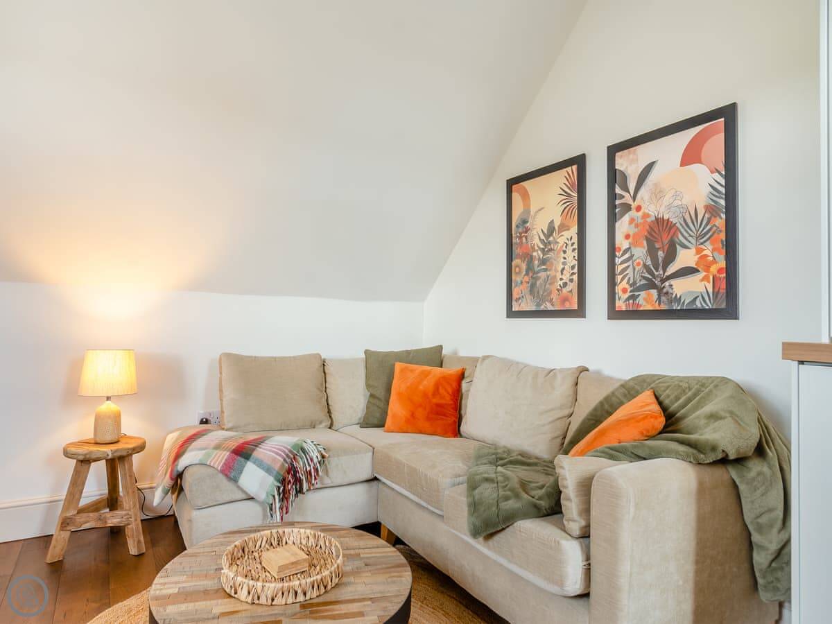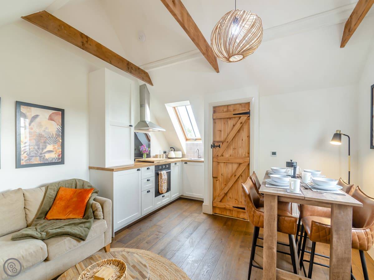 The living area is upstairs. That's so you get the view over the fields. It's open plan, with the kitchen and sitting room all together. There's a wood burner, which is nice in the colder months. The beams are original. The garden is out the front, with a table and chairs.