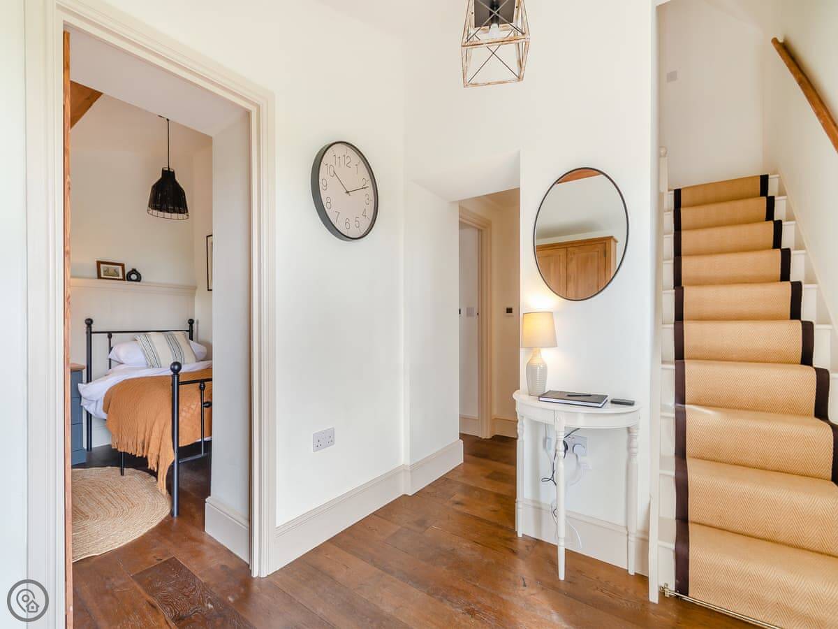 The Croft is a converted barn near Seaton. It's a 4 Star place that sleeps four, with one king size and one twin room downstairs, and the bathroom is down there too. The stairs are a normal staircase, not a ladder.