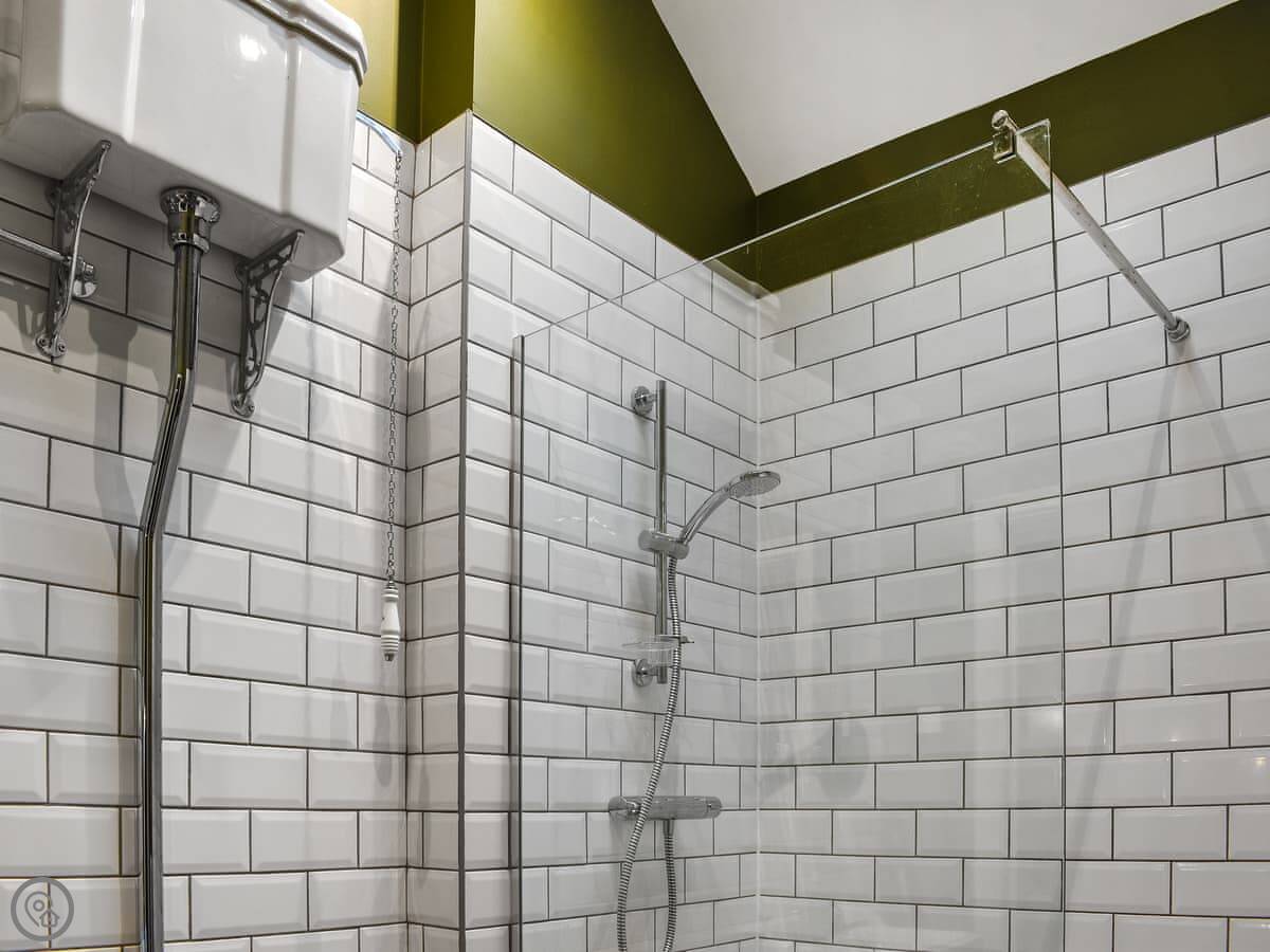 The living area is open plan. Big glass doors open onto the patio. There's a wood burner. Kitchen has a breakfast bar. The bathroom has a large walk-in shower. There's a separate toilet as well.