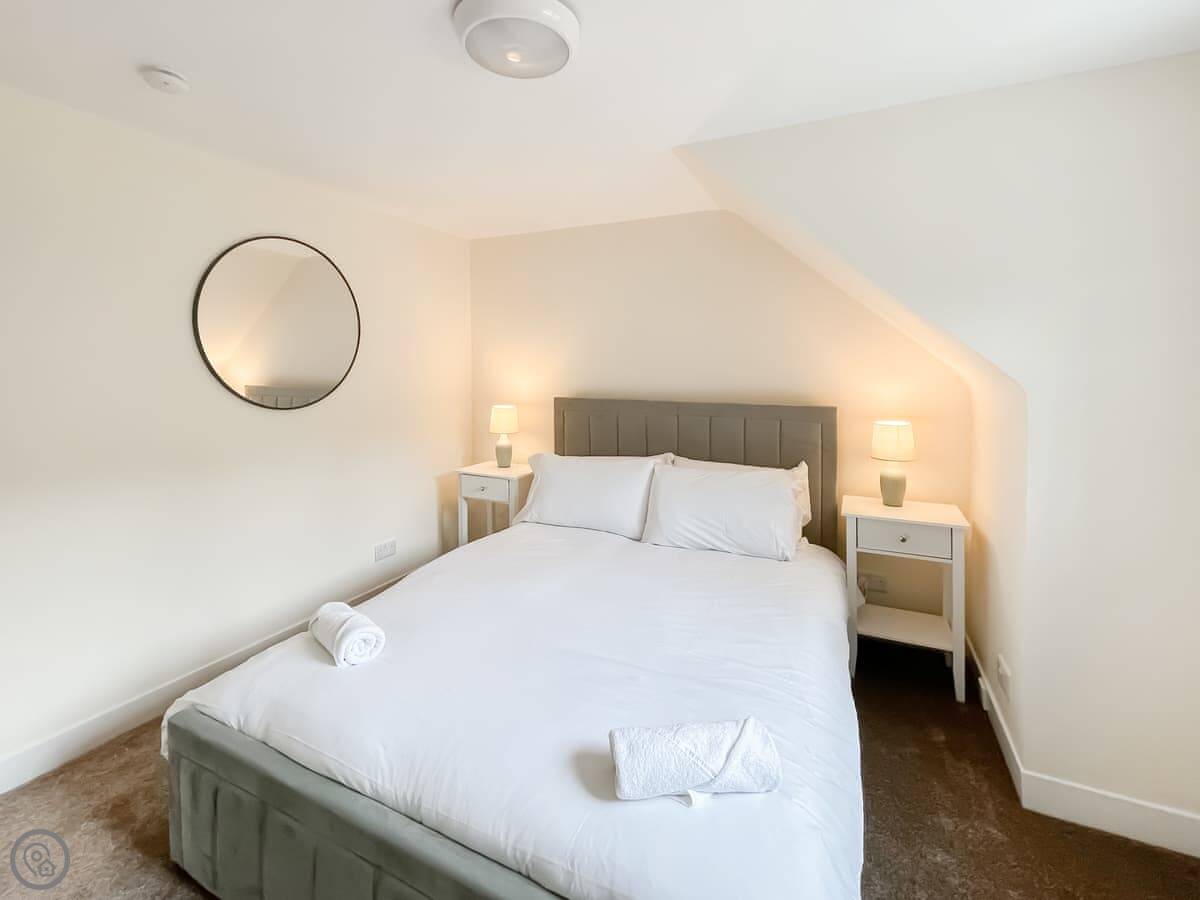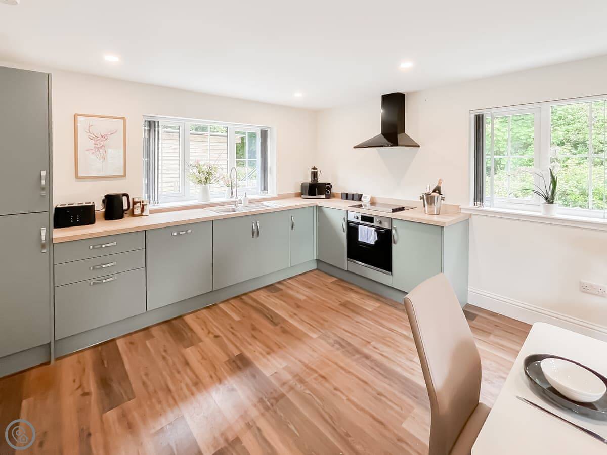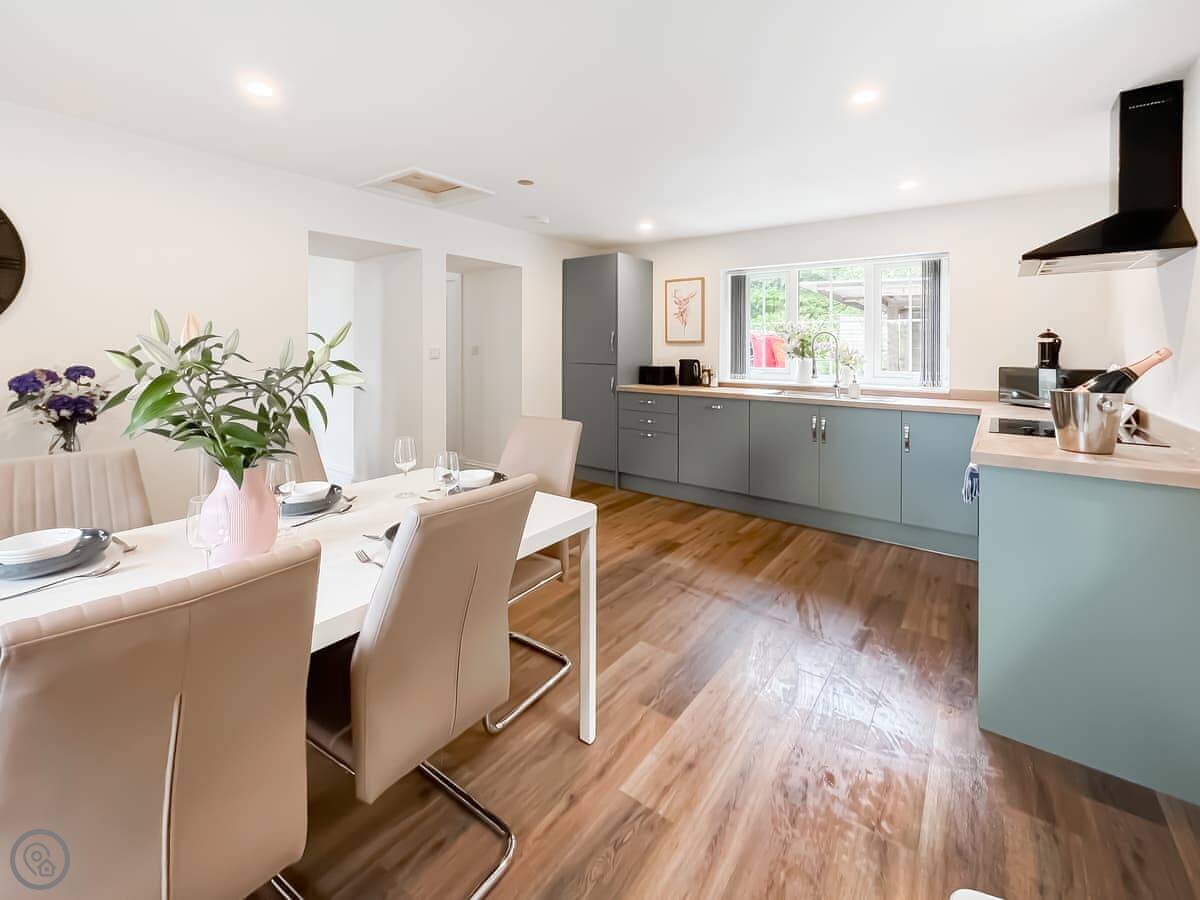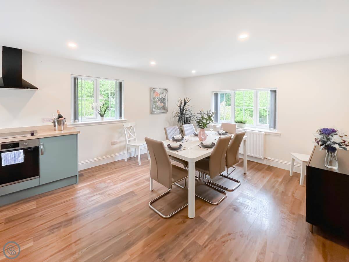 It sleeps ten. There are four bedrooms and three bathrooms. It's a 5 Star place, so everything is in good order. The downstairs feels spacious. There's a fireplace in the sitting room and the kitchen area is big enough for everyone to eat together.