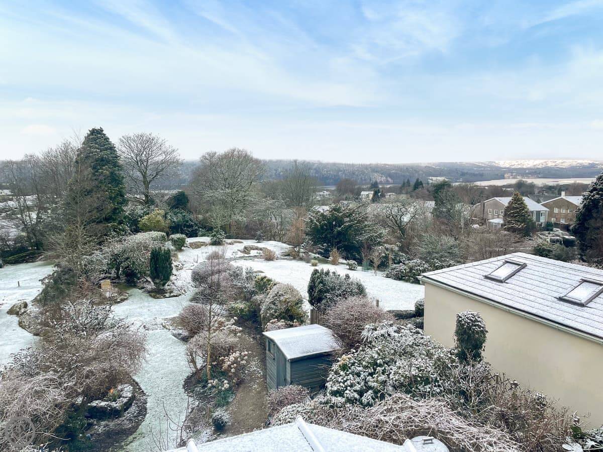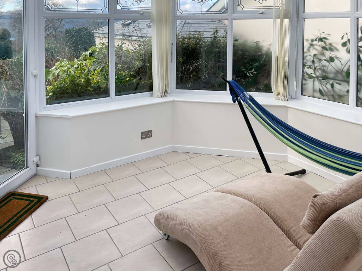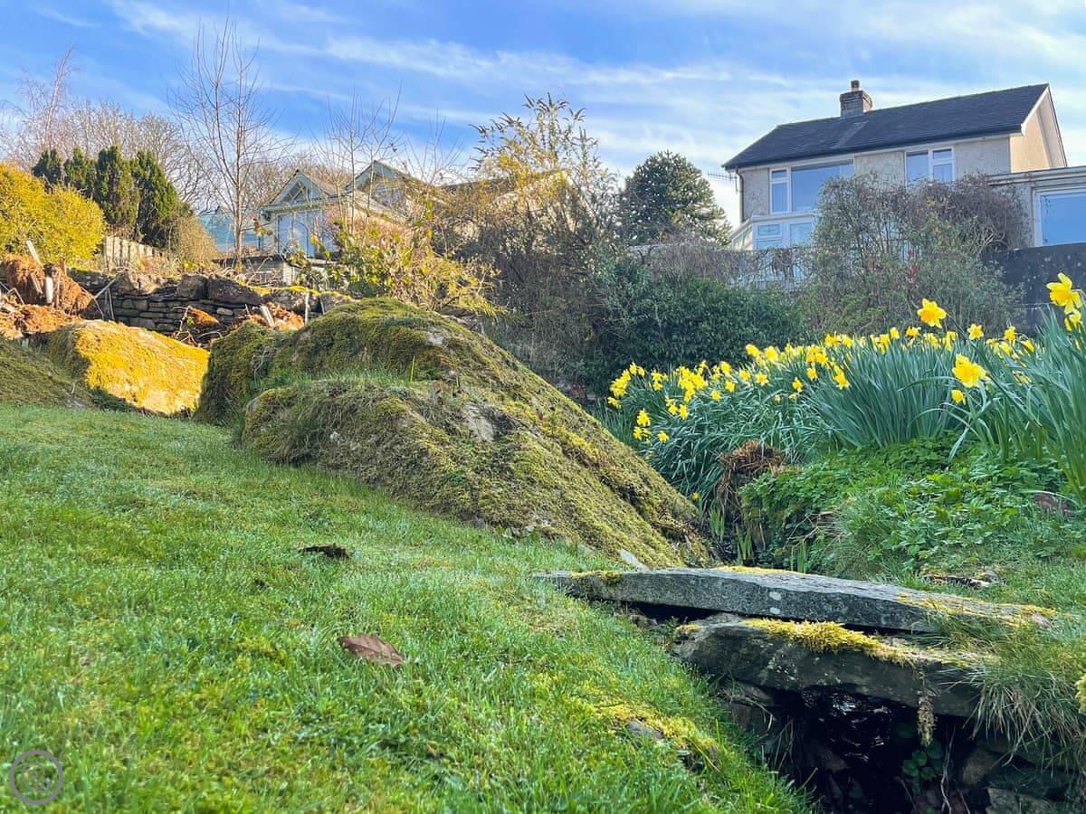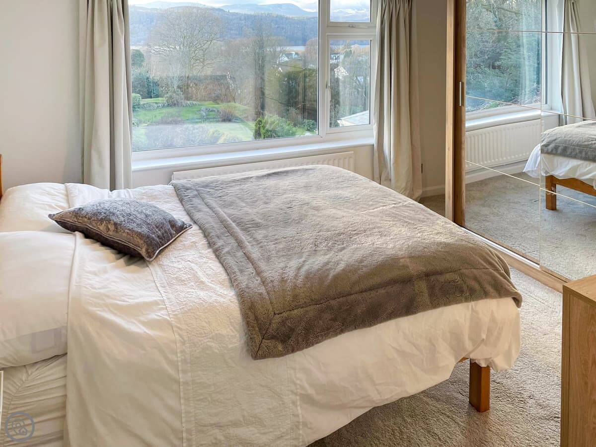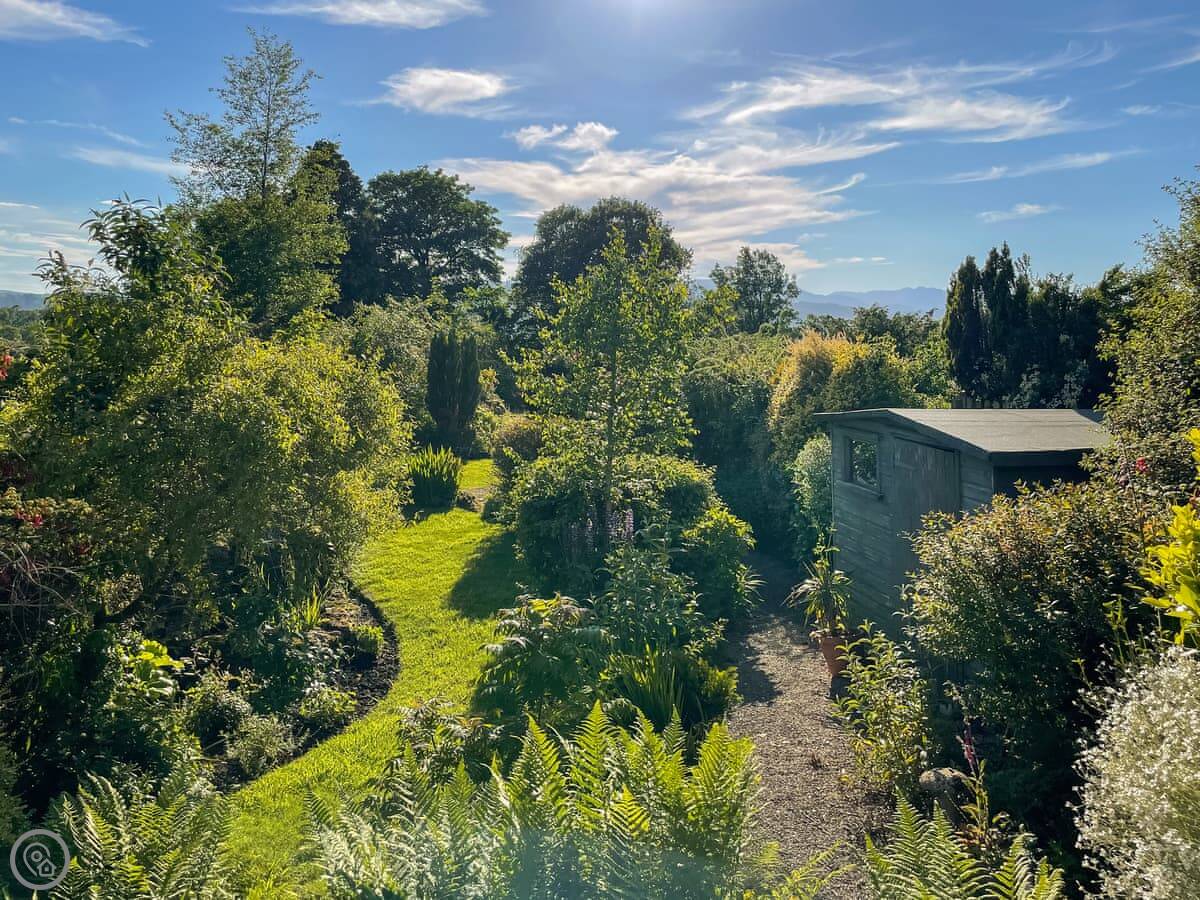 The main thing is the view. You look straight out over Lake Windermere towards the Langdale Pikes. The garden is large and goes down towards the fells. You can walk straight out from the back onto public footpaths. There are steps from the house to the garden, and more steps from the garden down to the path. The garden is quite natural, with some slopes and a small pond. It's not fenced off from the neighbours' gardens, so you'd need to keep an eye on children or dogs. The owners sometimes need access to it as well.