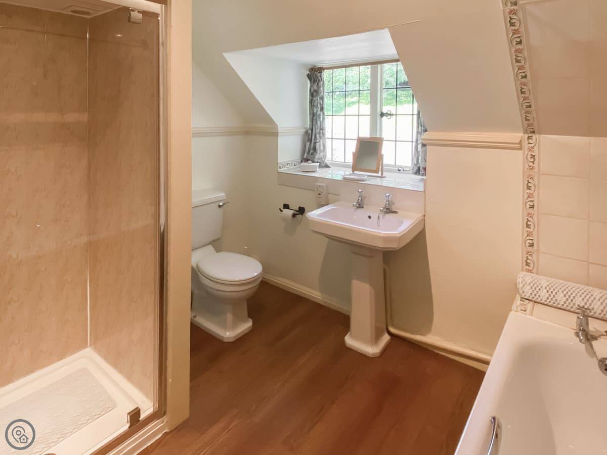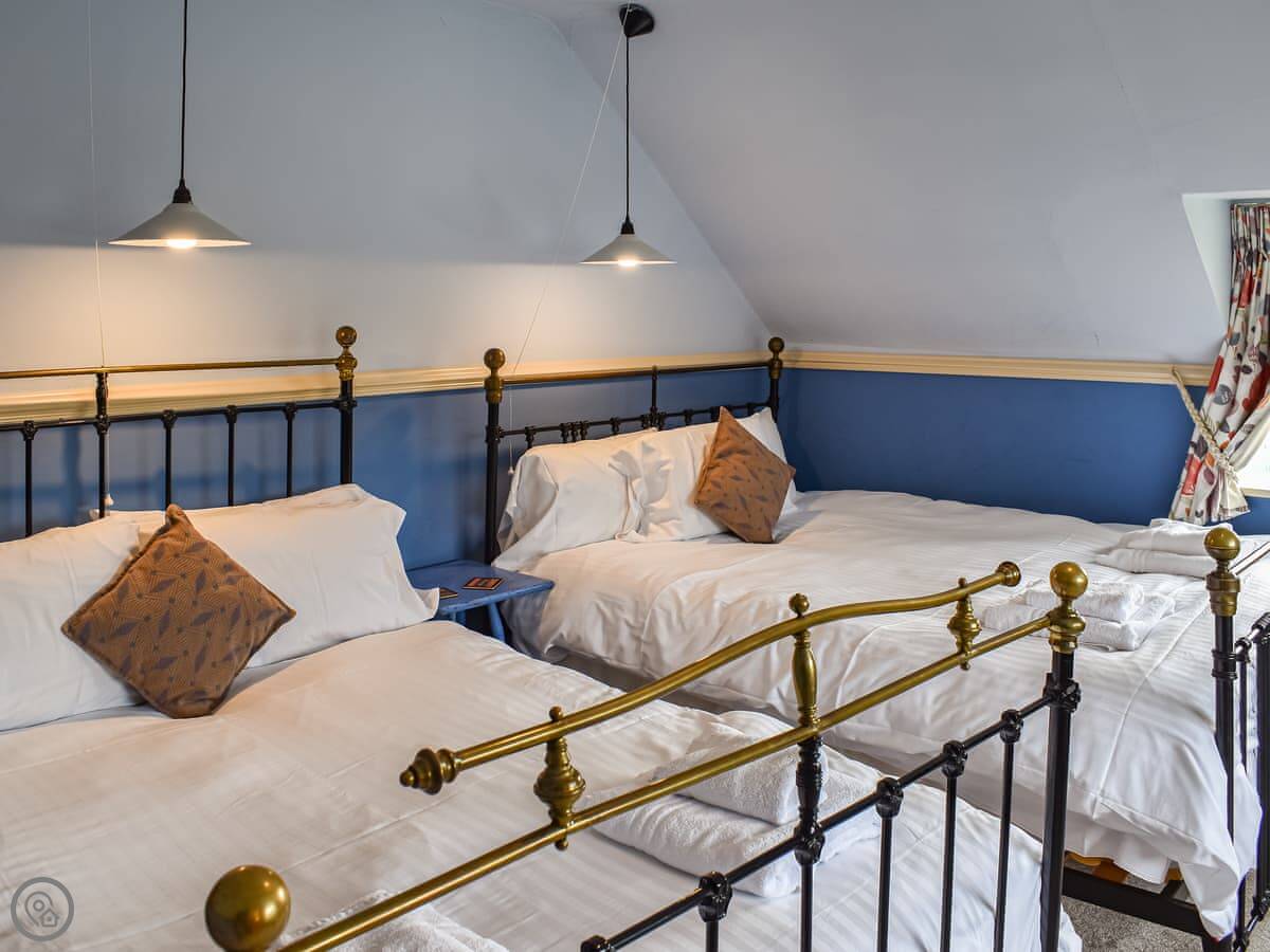 It sleeps four. Two bedrooms, one bathroom. It's got a 4 Star rating, so it's well equipped. The main bedroom has two double beds. The second bedroom has a kingsize. There's a family bathroom upstairs with a bath and a separate shower cubicle, and a downstairs loo.
