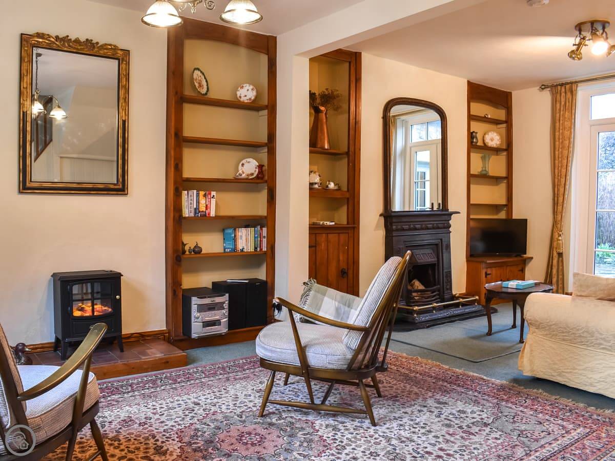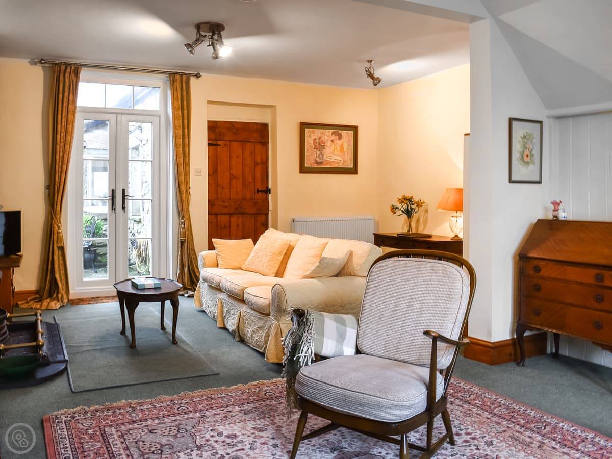 You come in at the front into the living room. It's open plan. There's a couple of armchairs by an electric stove, and a sofa at the other end with a TV. French doors go straight out to the garden from there. The kitchen is at the back. It's got what you need and a table for four, looking out the back.