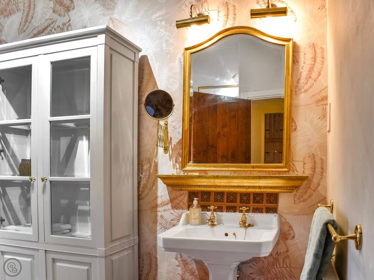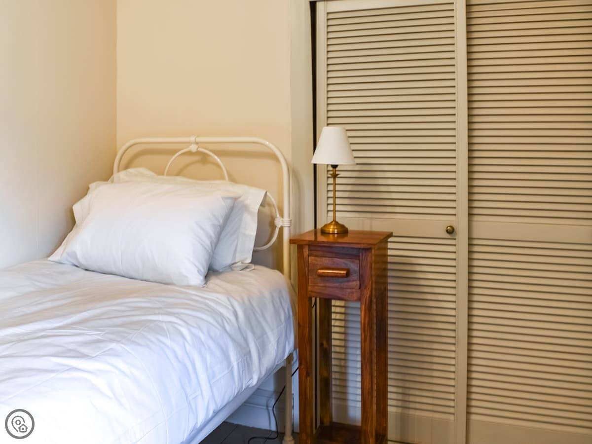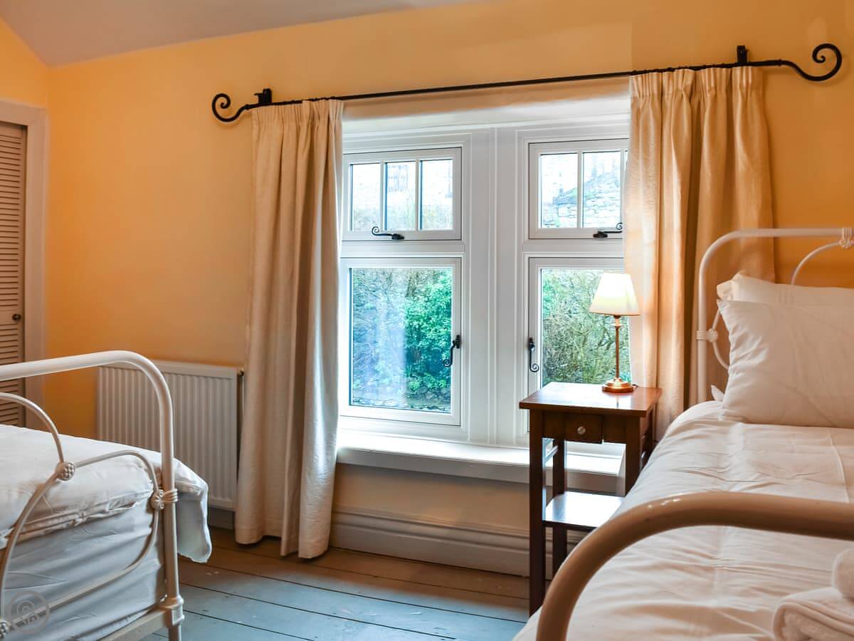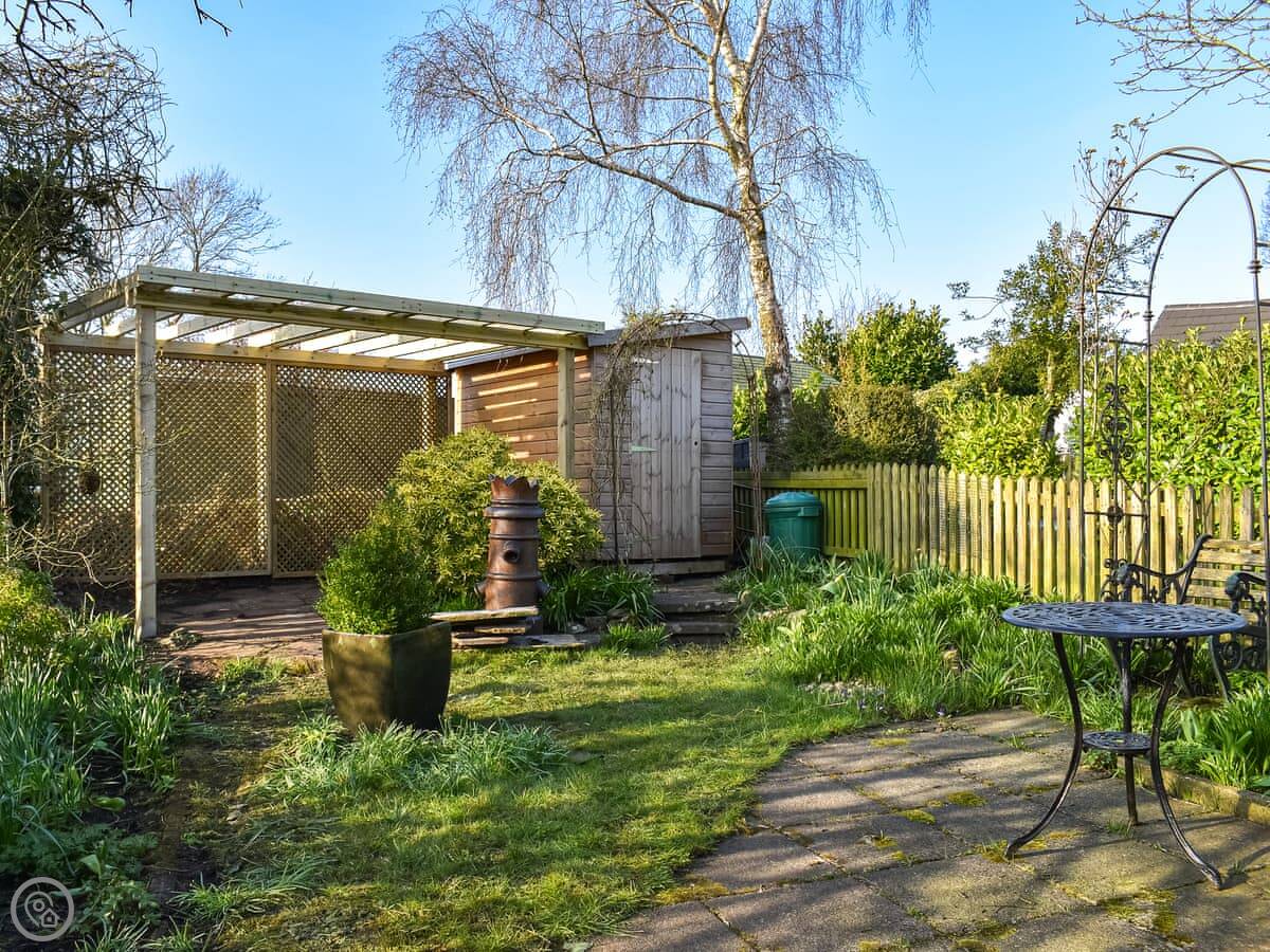 Upstairs, one bedroom has a double bed, the other has twins. The bathroom has a bit of storage. The garden is enclosed. There's a pergola with some flowers on it. It's private.