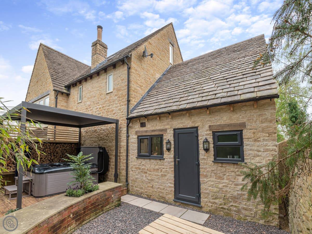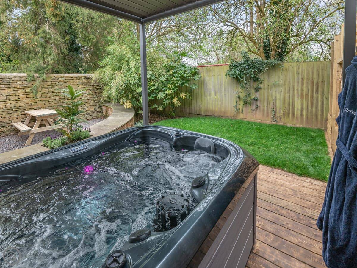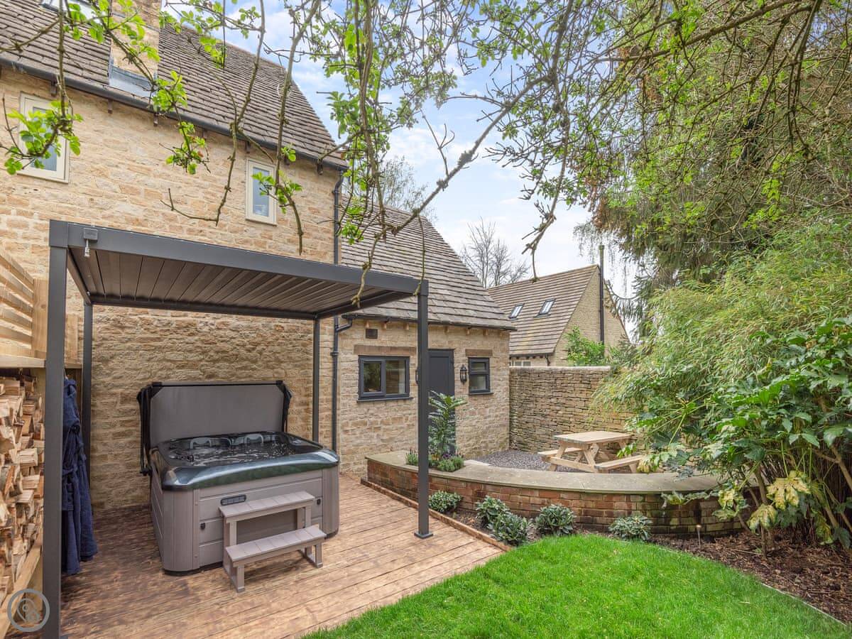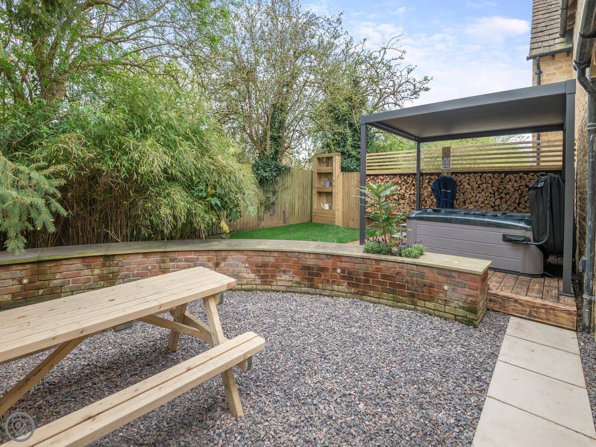 Outside, there's a private, enclosed garden with a patio area. It has a hot tub. Parking is for one car, in a designated space at the front.