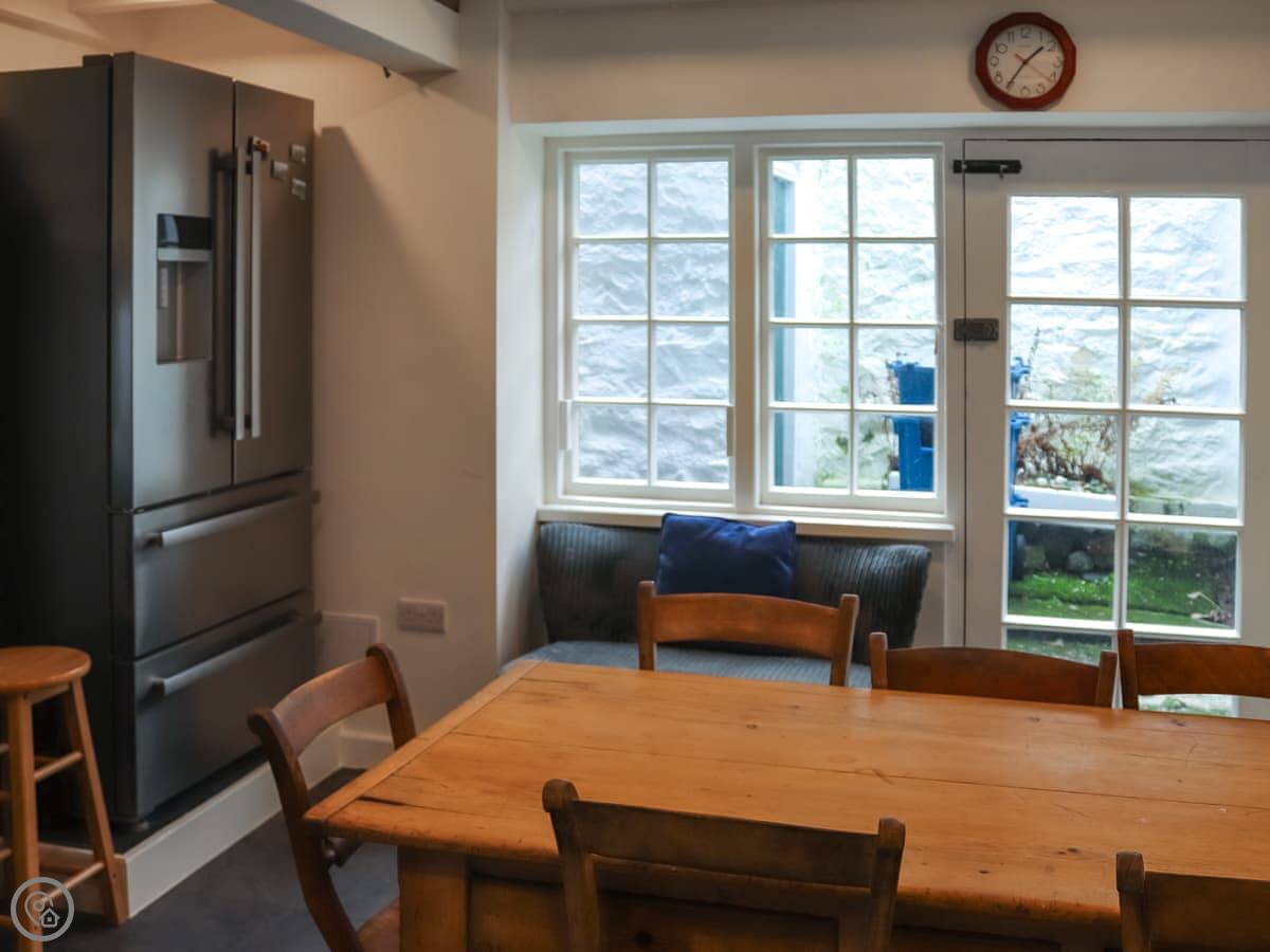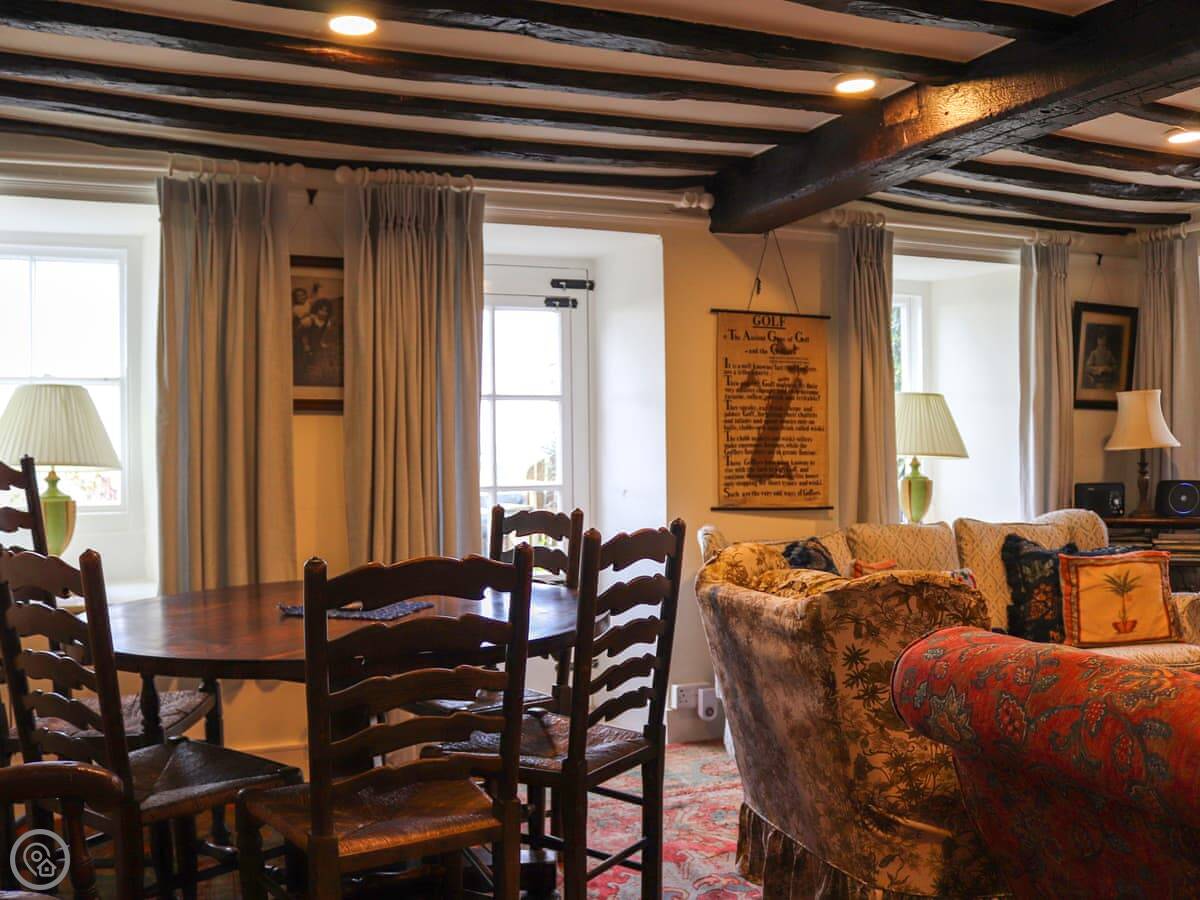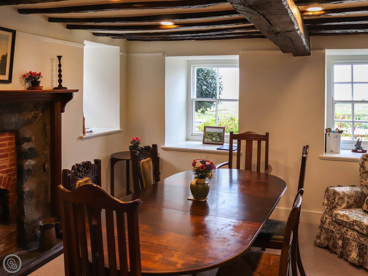 It's detached and made of stone. You can see the sea and the dunes from the front windows. I wouldn't say breathtaking, but it's a very good view. The lounge has an open fire. There's a dining table that seats everyone.