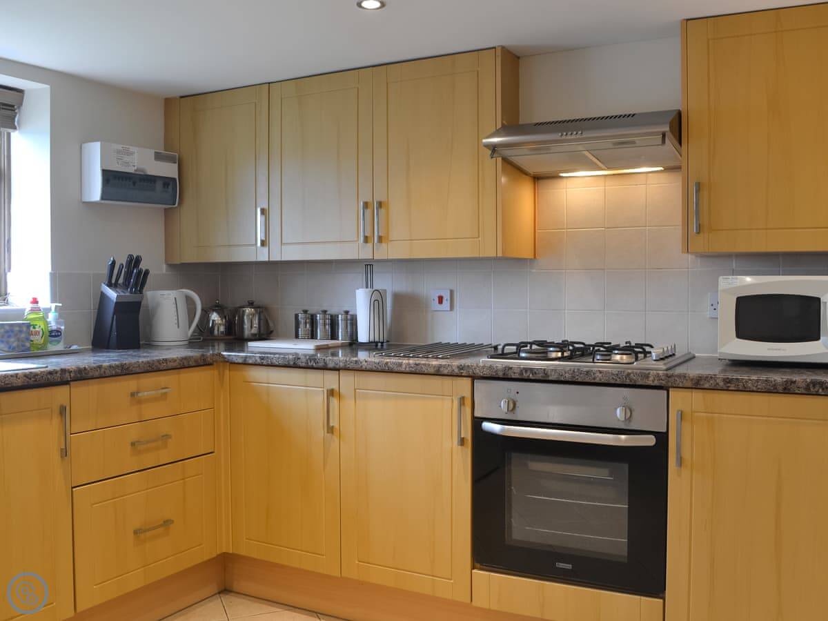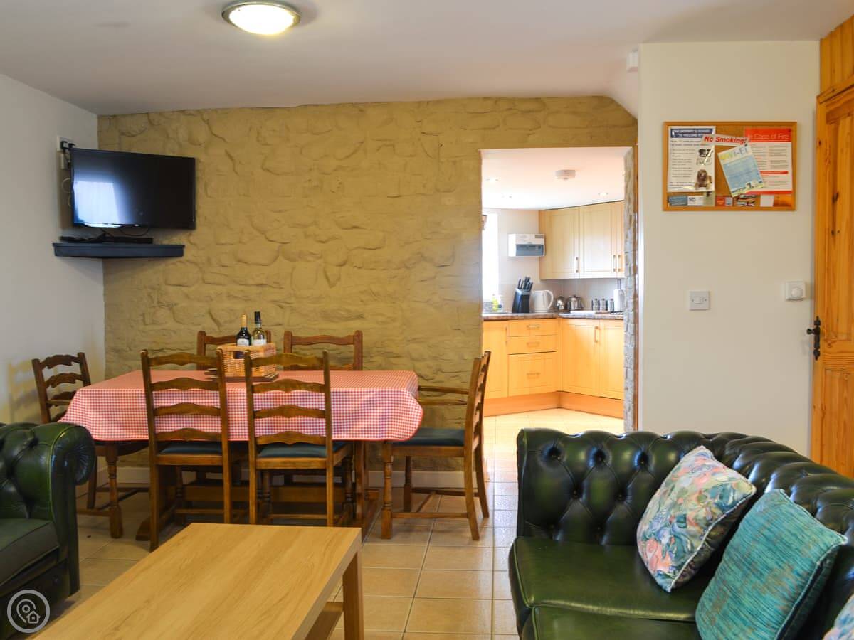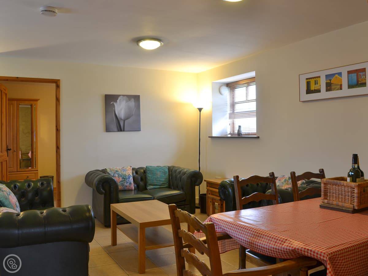 Inside, there's a big living room with a dining table. The kitchen is off that. It's got a dishwasher and a washing machine. There's underfloor heating downstairs, which is good when it's cold. It's a 3 Star place, so it's clean and comfortable.