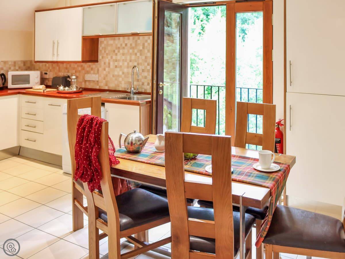 In the lodge, there's a dishwasher and washing machine. Bedding and towels are included. There's a patio area and parking right outside. One well-behaved dog is allowed. It's got a 4 Star rating.