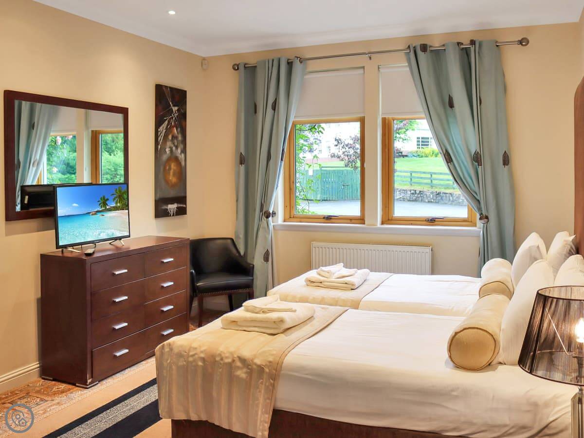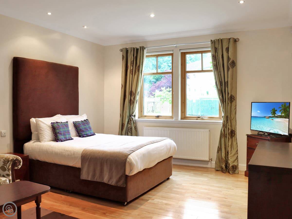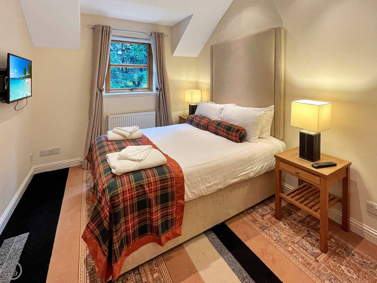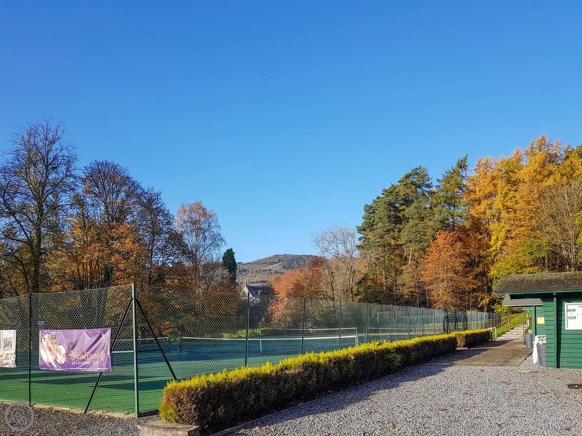 This is Lodge Number One. It's one of the old hunting lodges on the Atholl Palace estate in Pitlochry. You're right in the grounds, so you get the views and you can use the hotel facilities. It's a three-bedroom lodge that sleeps six.