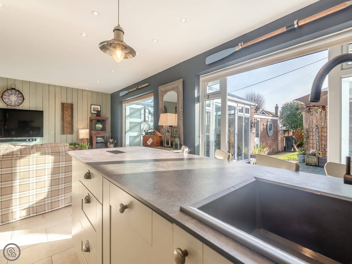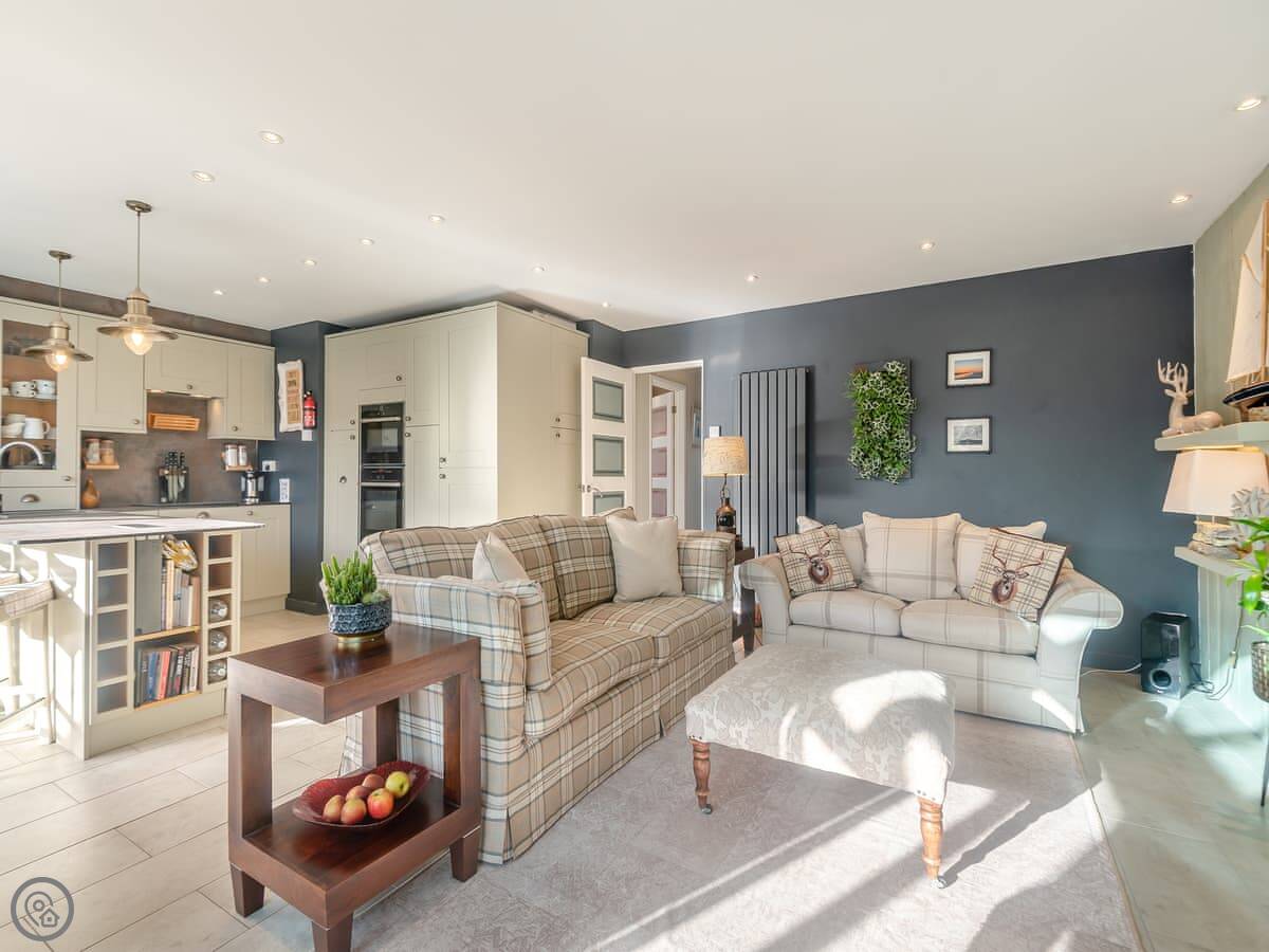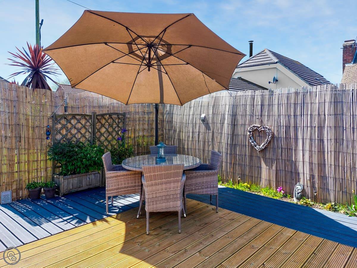 The main living area is open plan. The doors open out onto a decked garden area. It's enclosed, which is good for dogs or kids. There's a table out there, a BBQ, and a pizza oven. You can park two cars off the road next to the house.