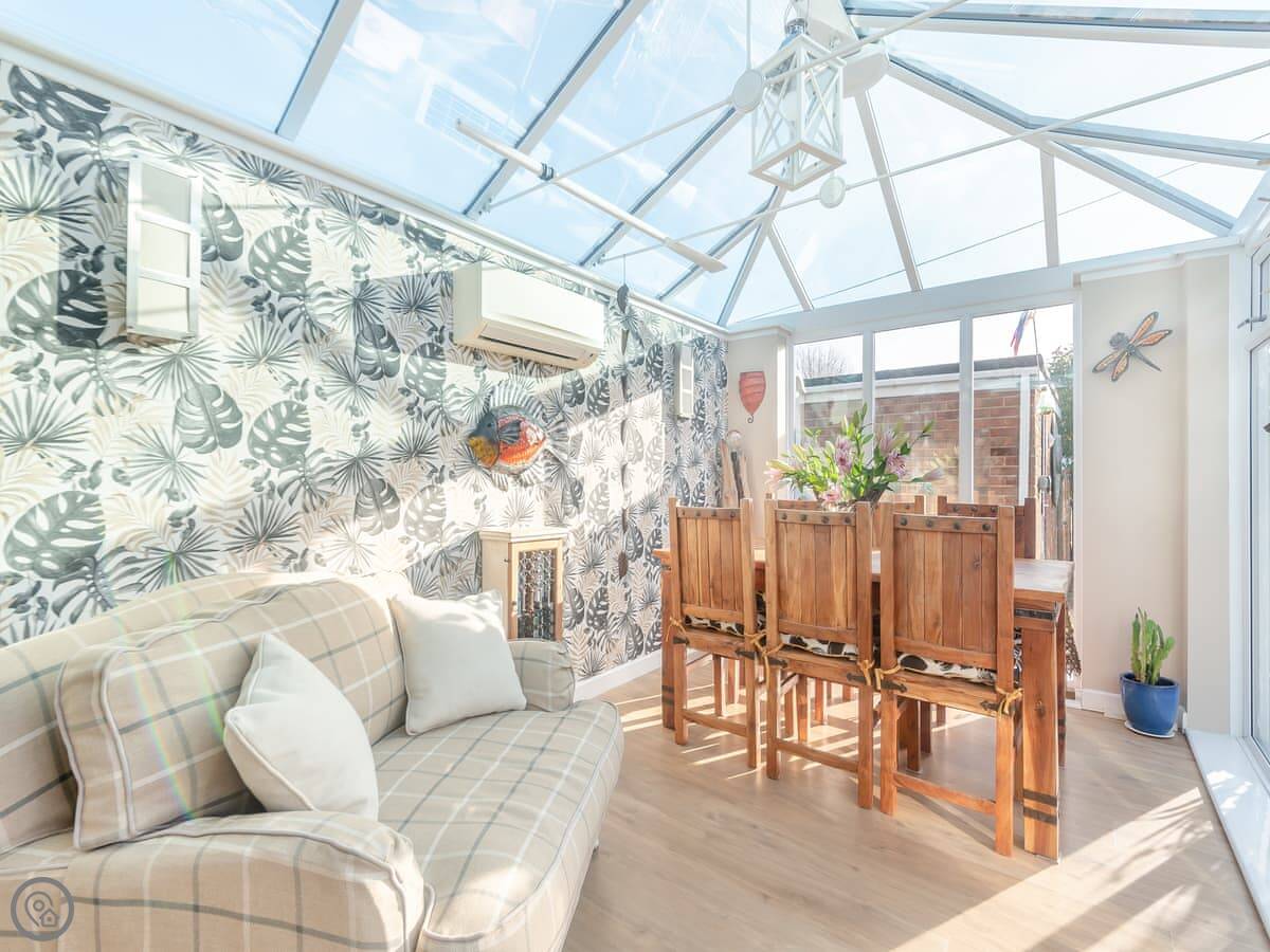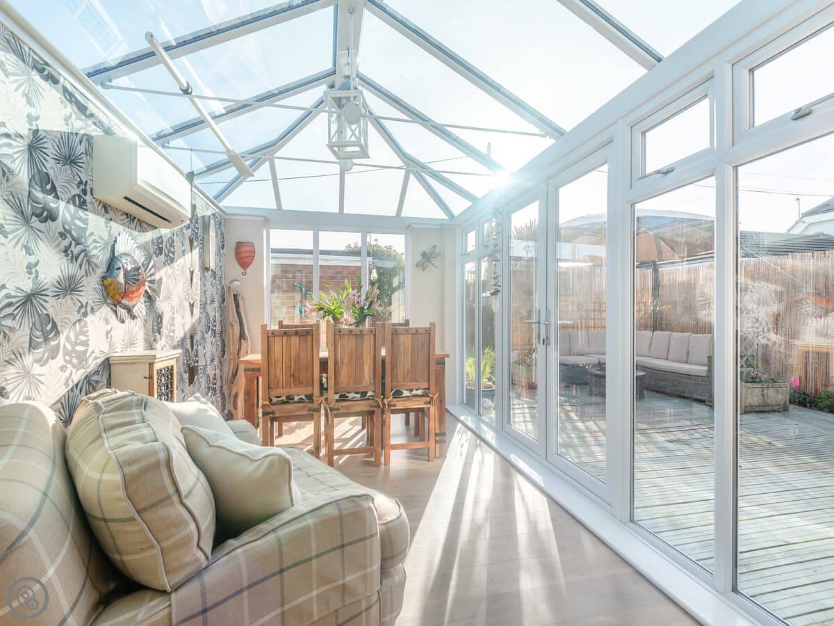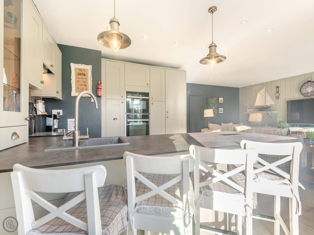 The main living area is open plan. The doors open out onto a decked garden area. It's enclosed, which is good for dogs or kids. There's a table out there, a BBQ, and a pizza oven. You can park two cars off the road next to the house.